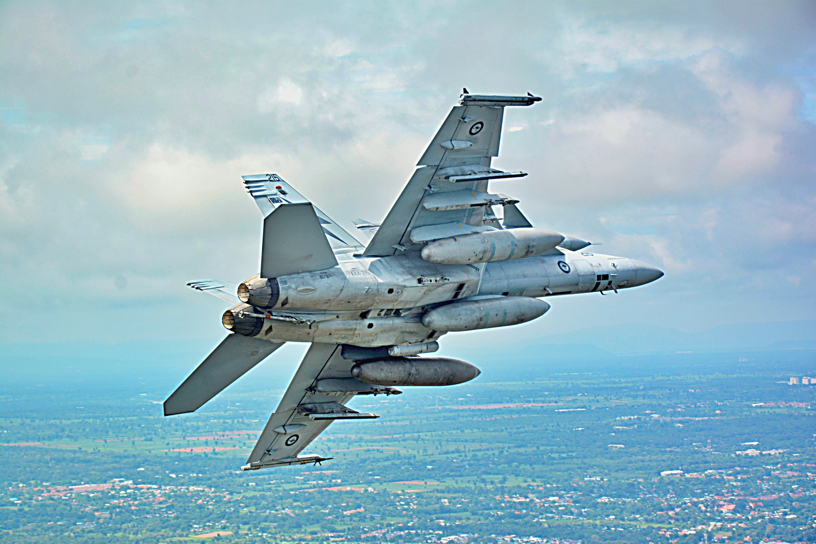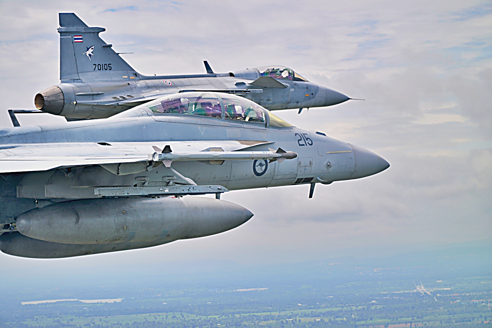 태국 Korat 상공에서 태국 왕립 공군의 Saab JAS 39 Gripen 전투기 및 F-16 전투기와 호주 왕립 공군 제1비행대대의 F/A-18F Super Hornet 전투기가 9월 9일 Thai Boomerang 25 훈련의 일환으로 양국 합동 훈련을 실시하고 있다.