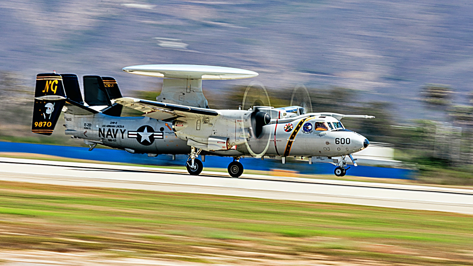미국 해군 VX-9 항공시험평가대대 F/A-18F Super Hornet 전폭기와 F-35C Lightning II 공격기 및 VAW-117 공중 지휘통제전대 소속 E-2D Hawkeye 조기경보기가 2025년 9월 12일 Gray Flag 2025 훈련중 Point Mugu 해군 항공기지에서 이륙하고 있다.