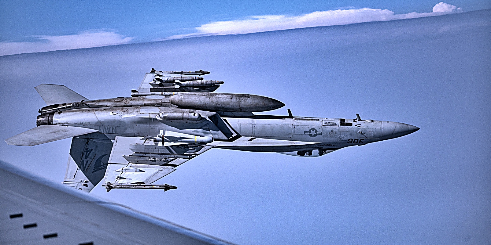 Nimitz Carrier Strike Group 소속 미 해군 F/A-18E Super Hornet 전폭기들이 2025년 8월 7일 미 중부사령부 작전구역 상공에서 미 공군 KC-46 Pegasus로 공중 급유를 마친 후 전투 공중 순찰 임무로 복귀하고 있다.