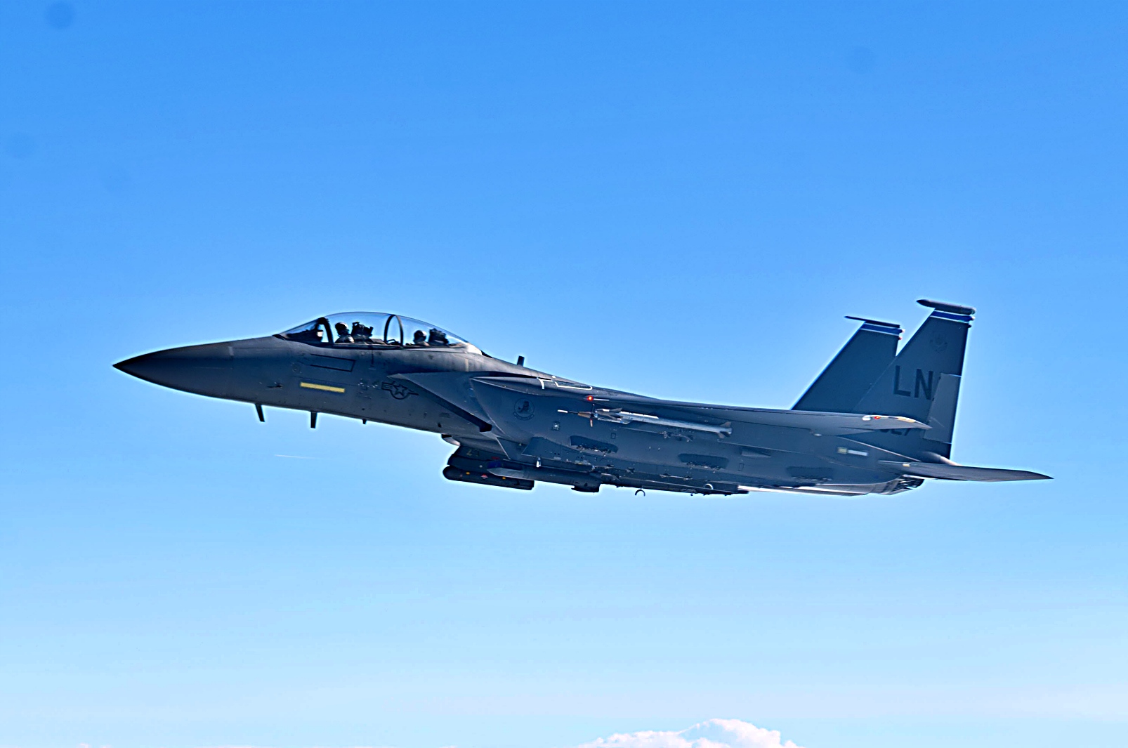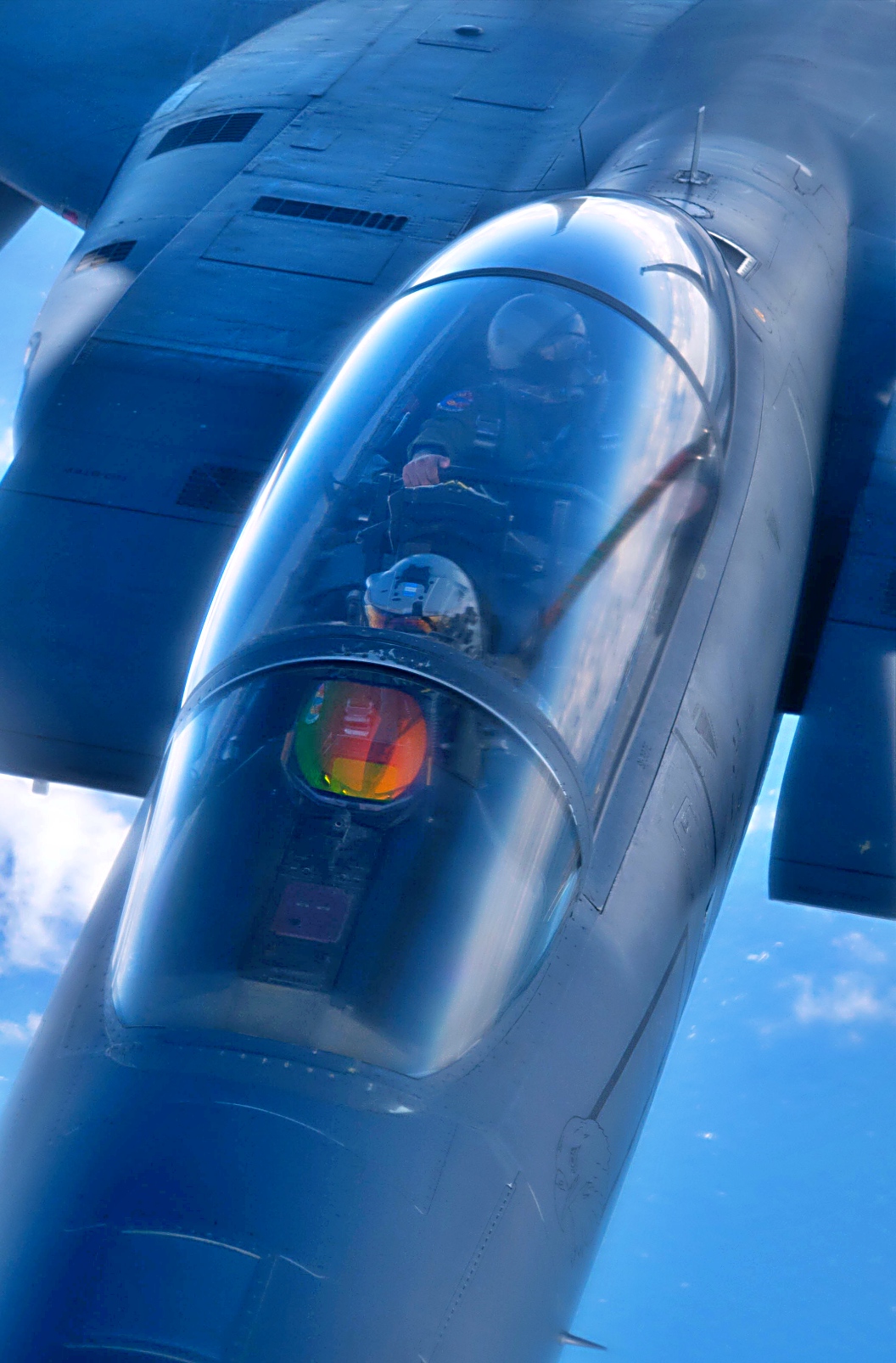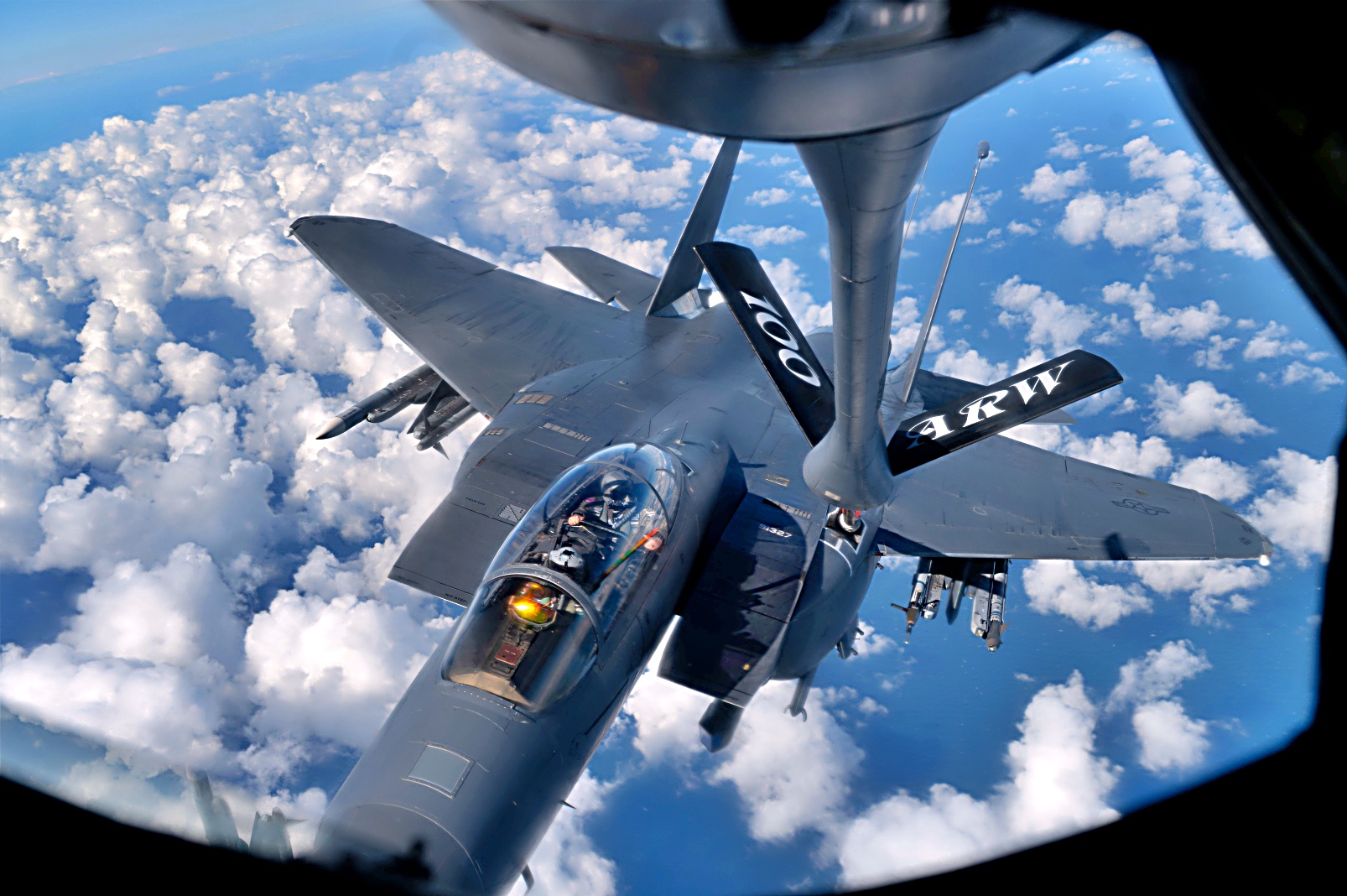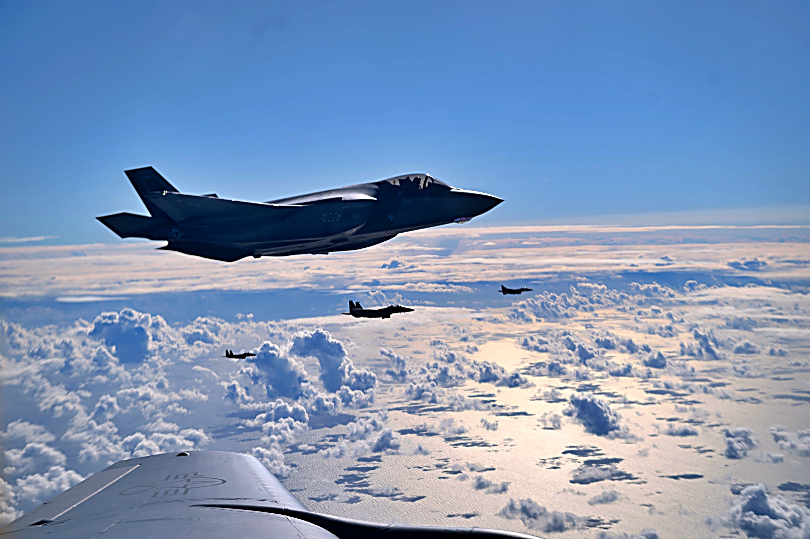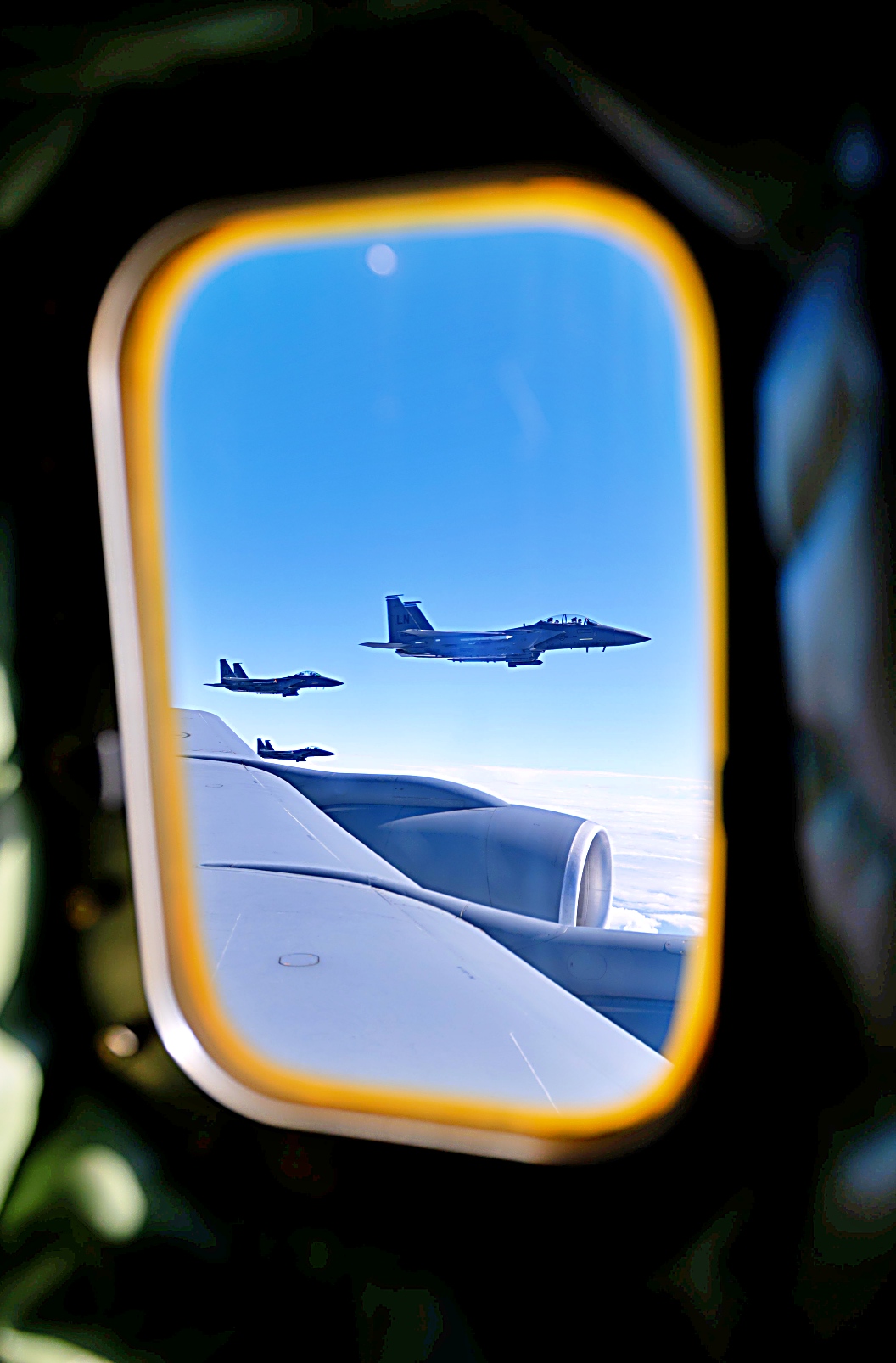 2025년 9월 16일, 북해 상공에서 진행된 ‘ Cobra Warrior’ 훈련 중 공중급유를 마친 미 공군 제48전투비행단 소속 F-15E Strike Eagle 전투기가 제100공중급유비행단 소속 KC-135 Stratotanker와 나란히 비행하고 있다. 이번 훈련은 100공중급유비행단이 도전적이고 경쟁적인 작전 환경에서 핵심 임무 수행 능력과 전투력을 유지할 수 있는지 확인하기 위해 실시됐다.