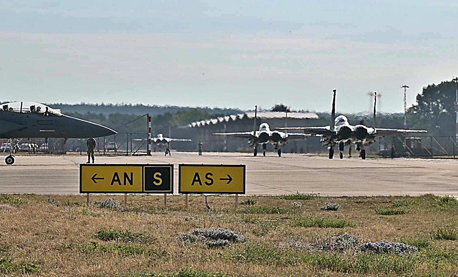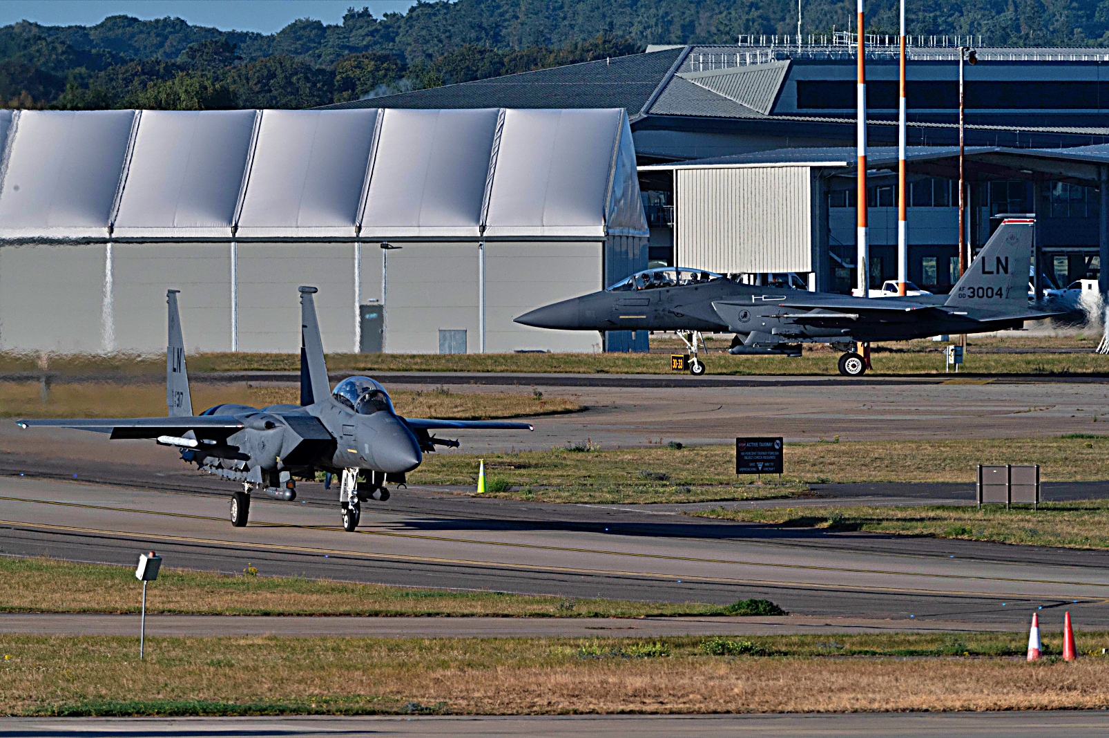 2025년 8월 25일부터 28일까지 영국 공군 Lakenheath 기지에서 진행된 Combat Readiness Exercise 중, 미 공군 제495전투비행대대 소속 F-35 Lighting II 공격기와 제494전투비행대대 소속 F-15E Strike Eagle 전폭기가 이륙하고 있다.