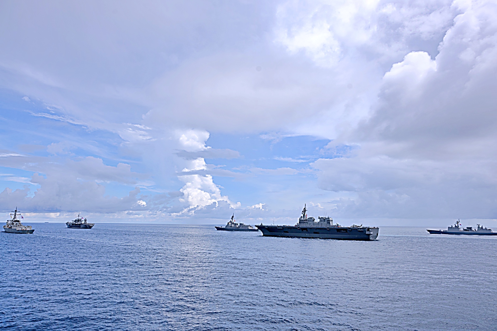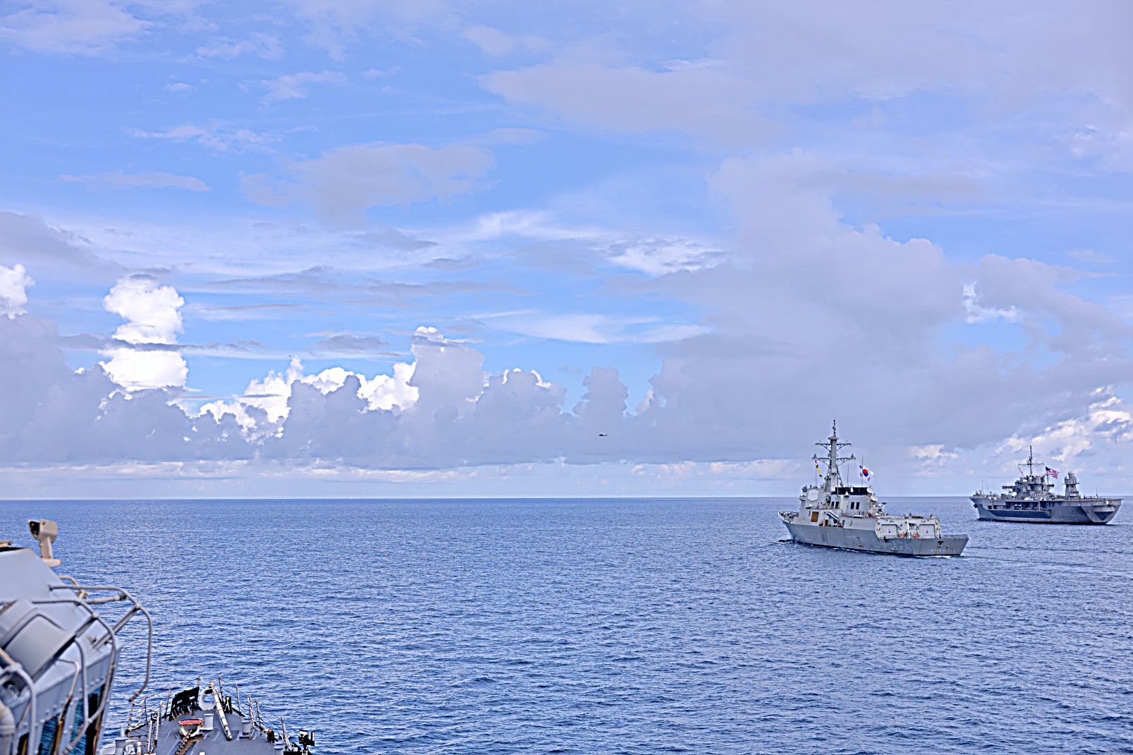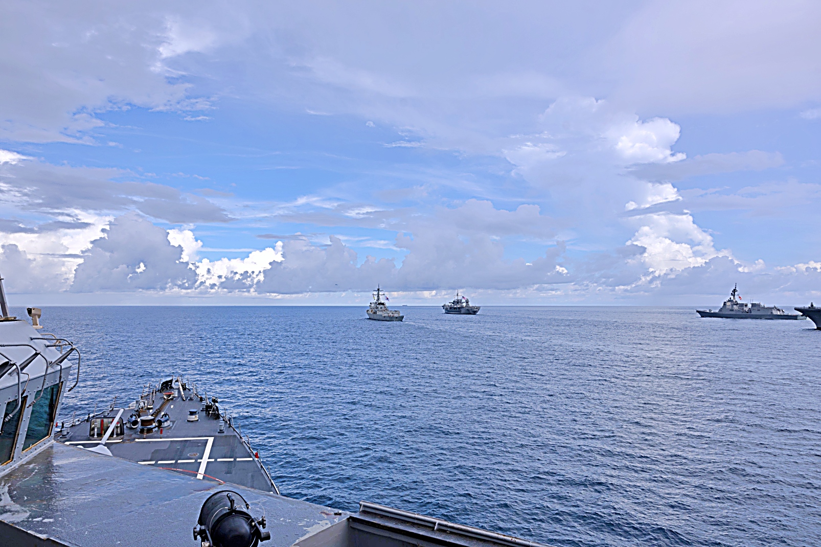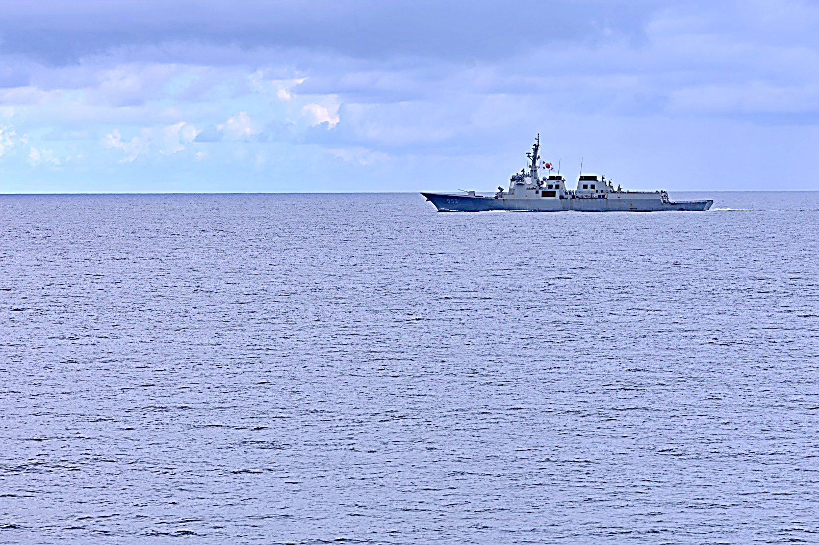 2025년 9월 16일, 남해상에서 진행 중인 ‘ Freedom Edge 25’ 훈련중 미 해군 7함대의 지휘 통제함 USS Blue Ridge (LCC 19)함과 Arleigh Burke (Flight I)급 Aegis 미사일 구축함 USS Curtis Wilbur (DDG-54)함, 일본 해상자위