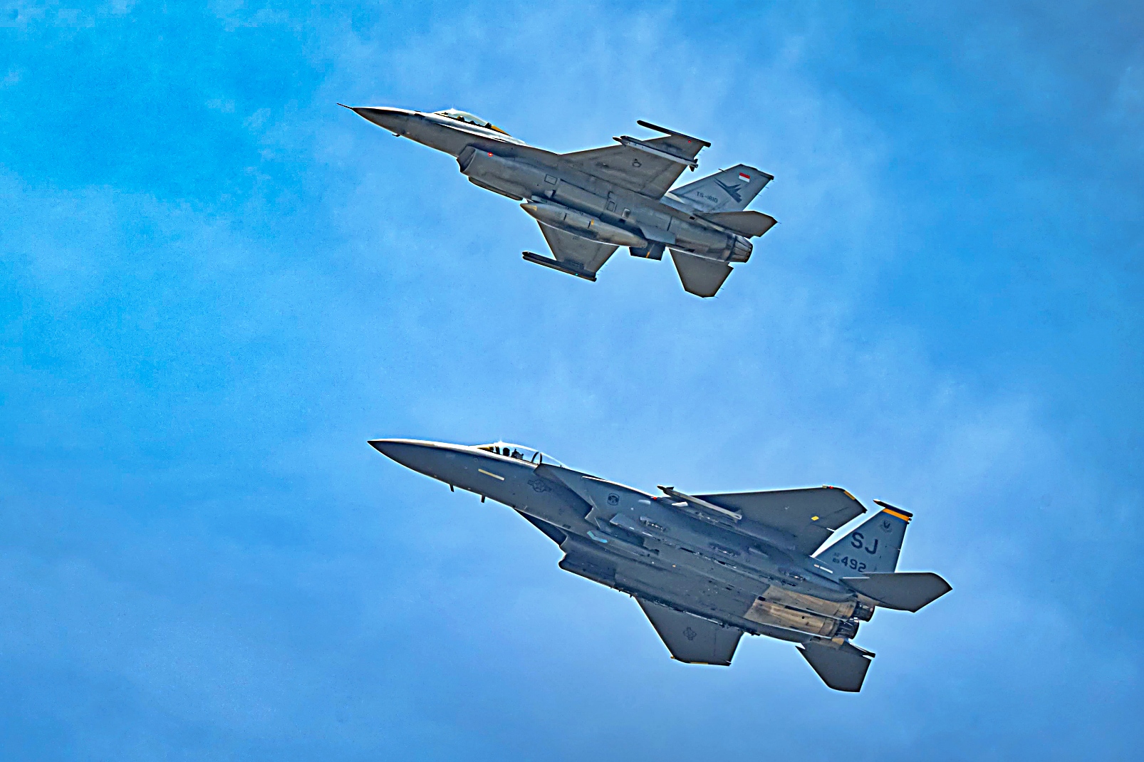 인도네시아 공군 F-16과 미 공군 F-15E Strike Eagle 전투기가 2025년 9월 9일 인도네시아 Roesmin Nurjadin 공군 기지에서 진행된 Cope West 25 훈련 중 함께 비행하고 있다.