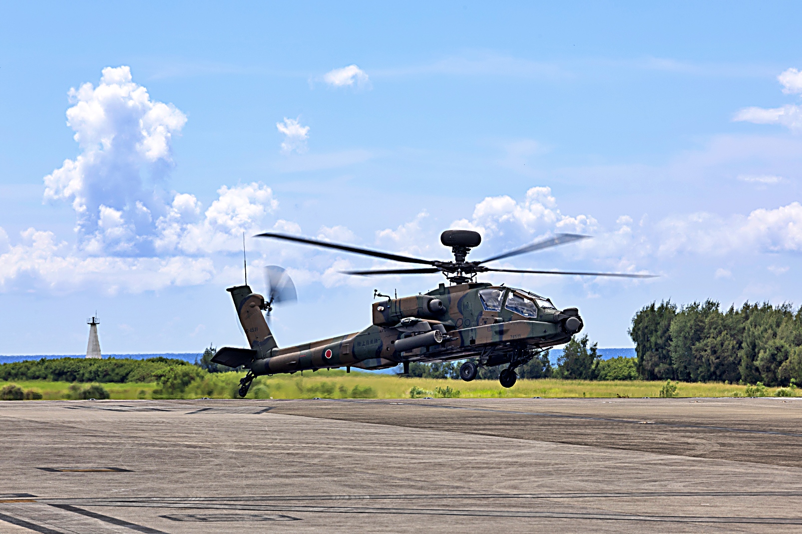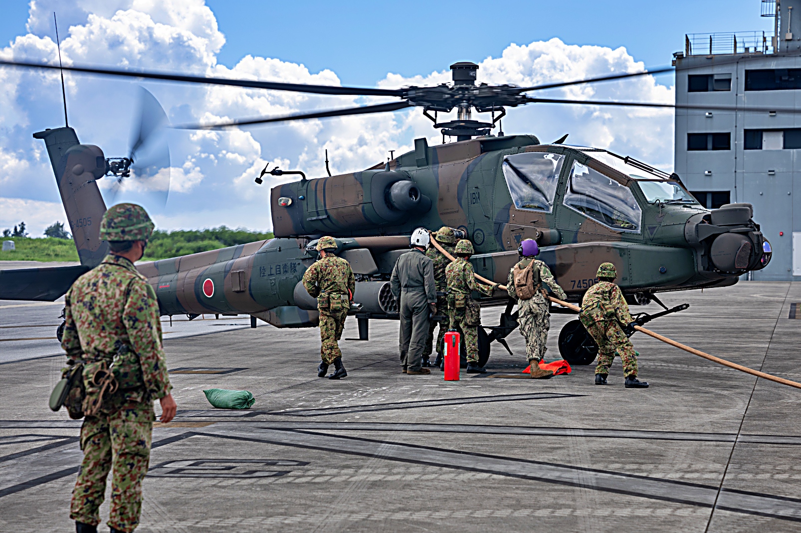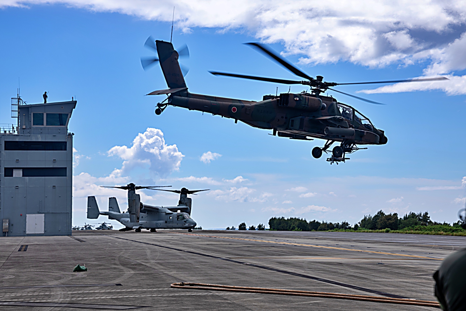 2025년 9월 19일, 일본 오키나와 Ie Shima에서 진행된 ‘ Resolute Dragon 25’ 훈련 중, 미 해병대 제1해병항공단 제36해병항공근 VMM-262 해병중형틸트로터비행대대의 MV-22B Osprey 수송기와 일본 육상자위대 AH-64DJP Apache 공격헬기가 착륙하여 미 해병대원과 일본 육상자위대의 재급유 지원을 받고 있다.