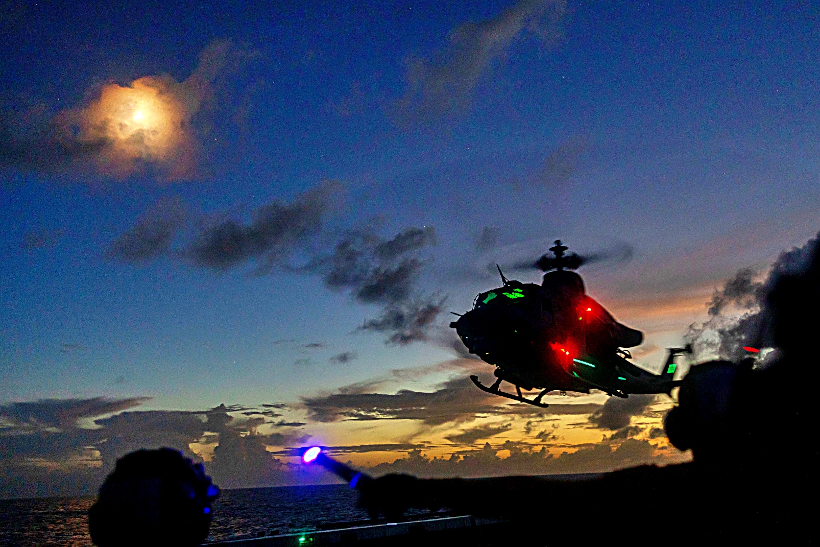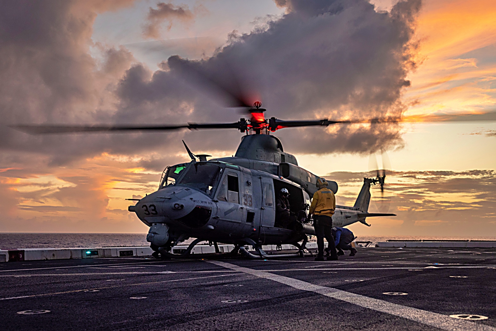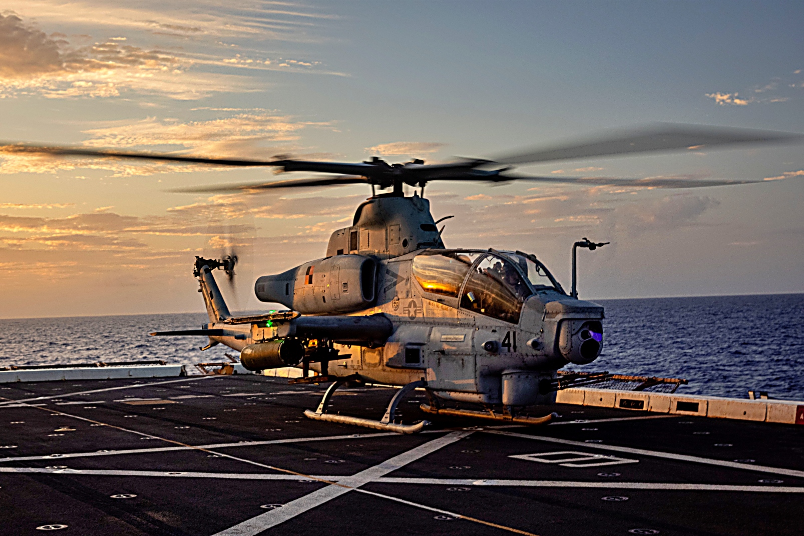 2025년 8월 27일 카리브해를 항해 중인 Iwo Jima Amphibious Ready Group 일원인 미 해군 San Antonio급 상륙수송함 USS San Antonio (LPD 17)함에 탑재된 미 해병대 제22해병원정대(특수작전능력) 소속 VMM-263 강화형 해병중형틸트로터비행대대 소속 AH-1Z Viper 공격헬기가 UH-1Y Venom 다목적 수송헬기와 이륙하고 있다.