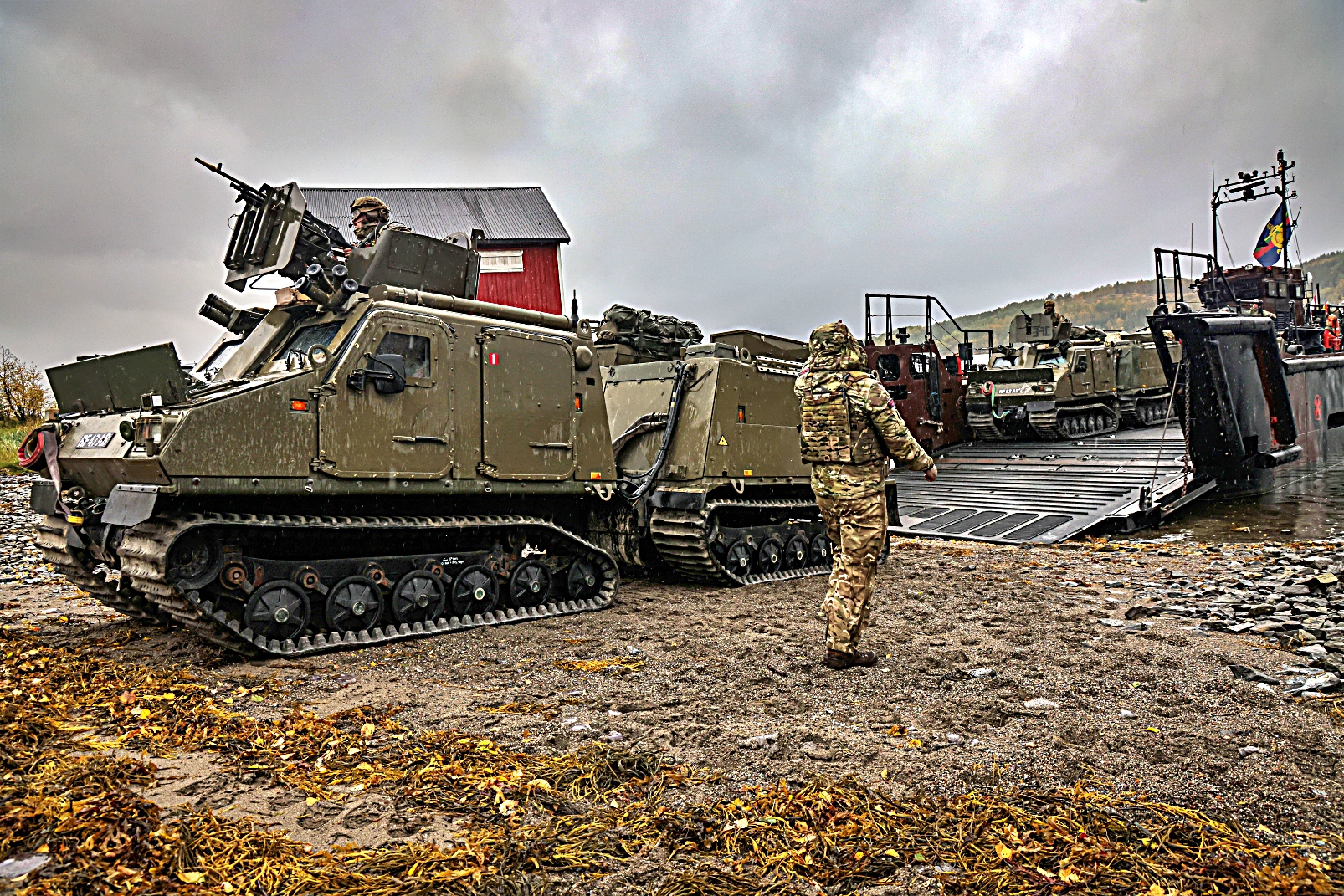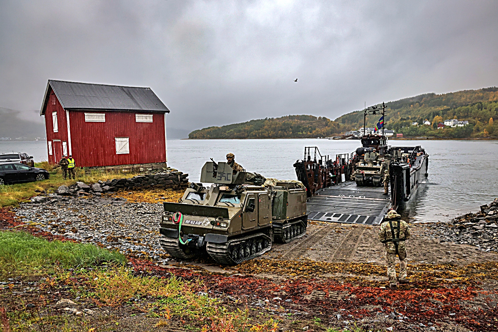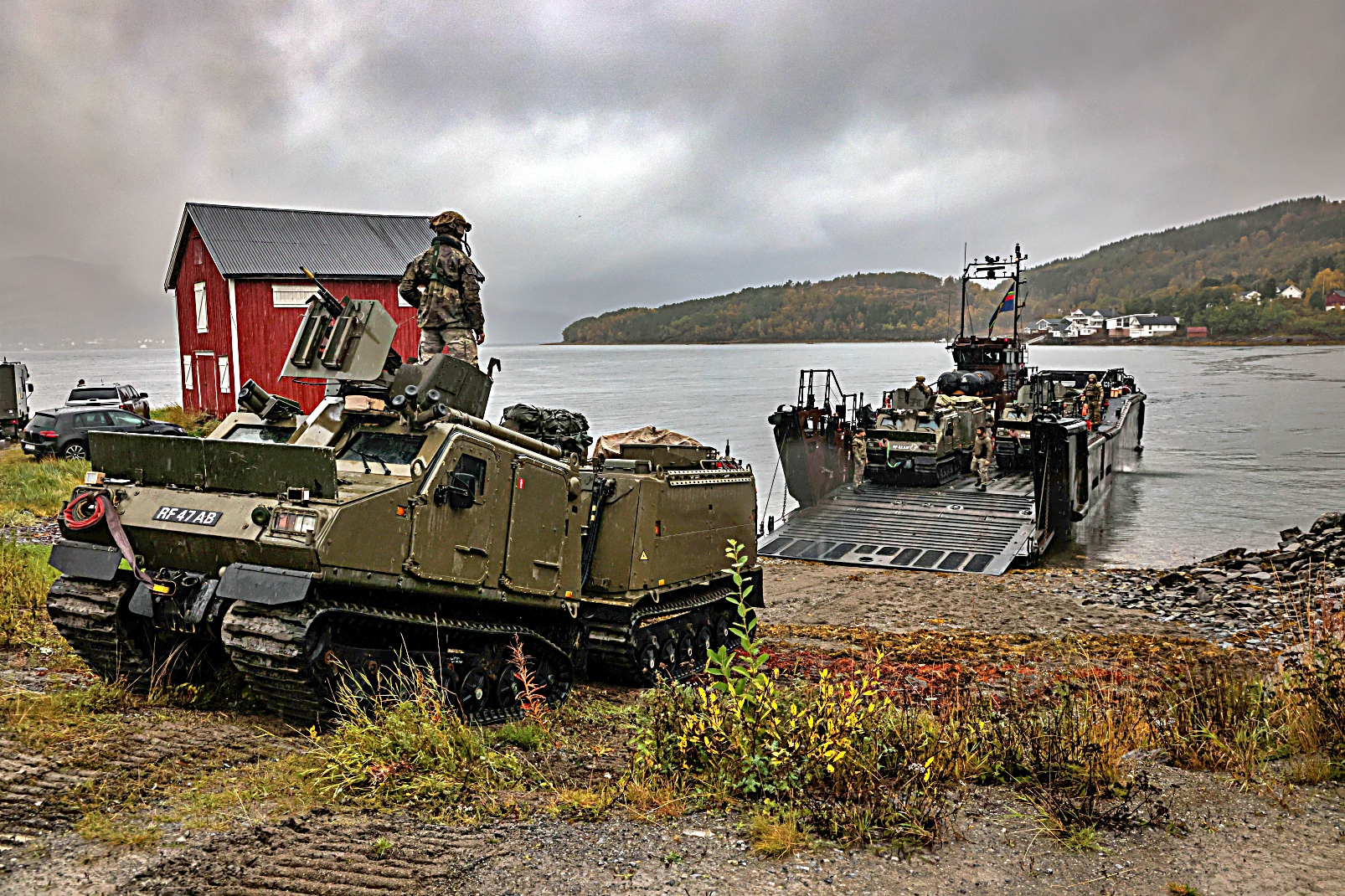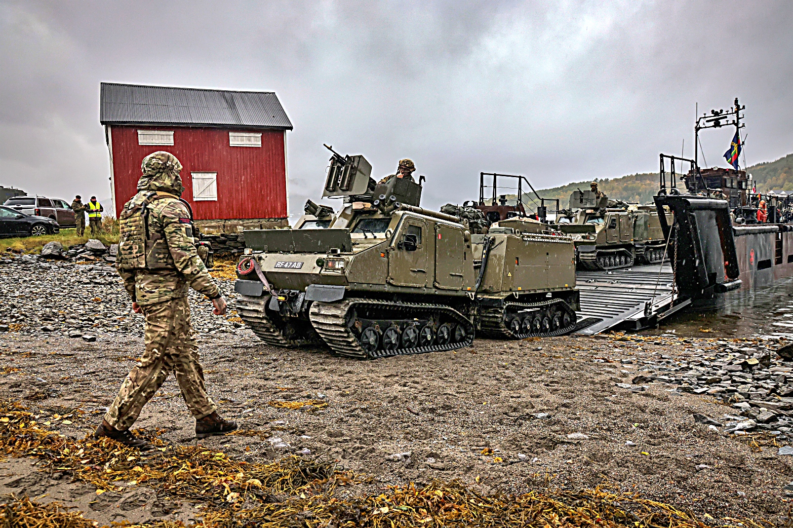 2025년 9월 26일 노르웨이에서 바이킹 BVS10 장갑차를 운용하는 CLR 기갑지원단(ASG) 소속 영국 해병대가 Exercise Tarasiss 훈련중 RFA Lyme Bay 상륙함으로부터 발진하여 해변 상륙 훈련을 실시하고 있다.