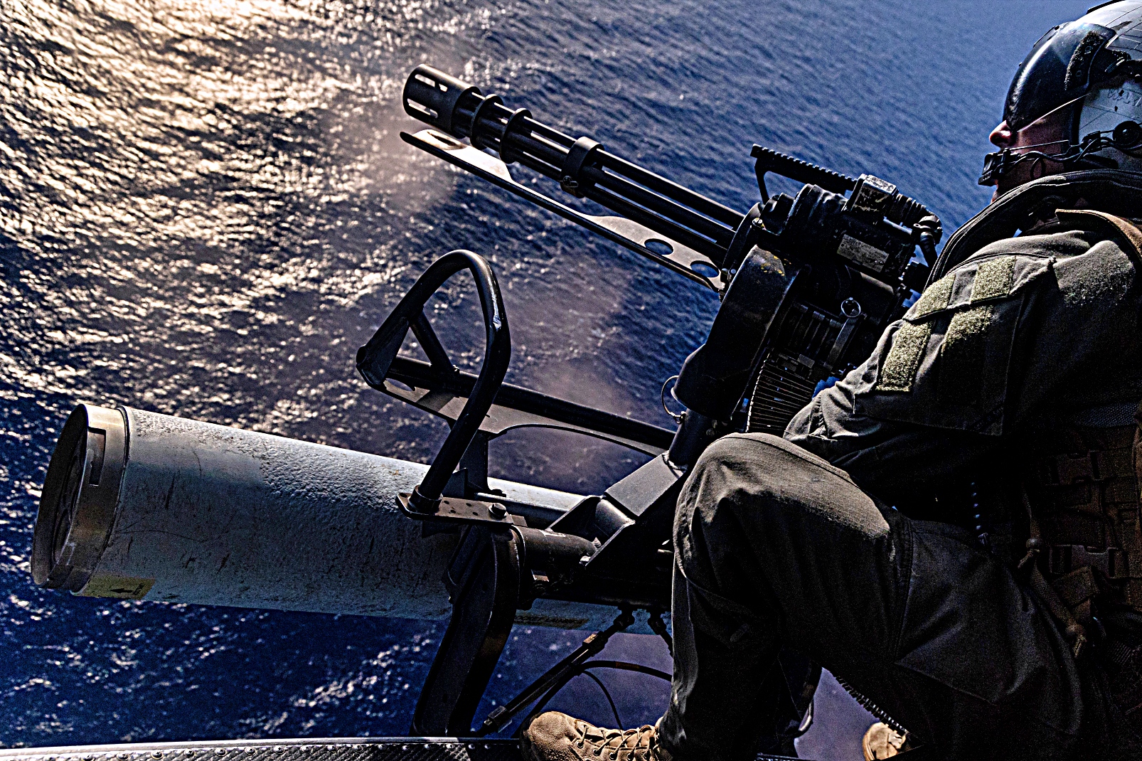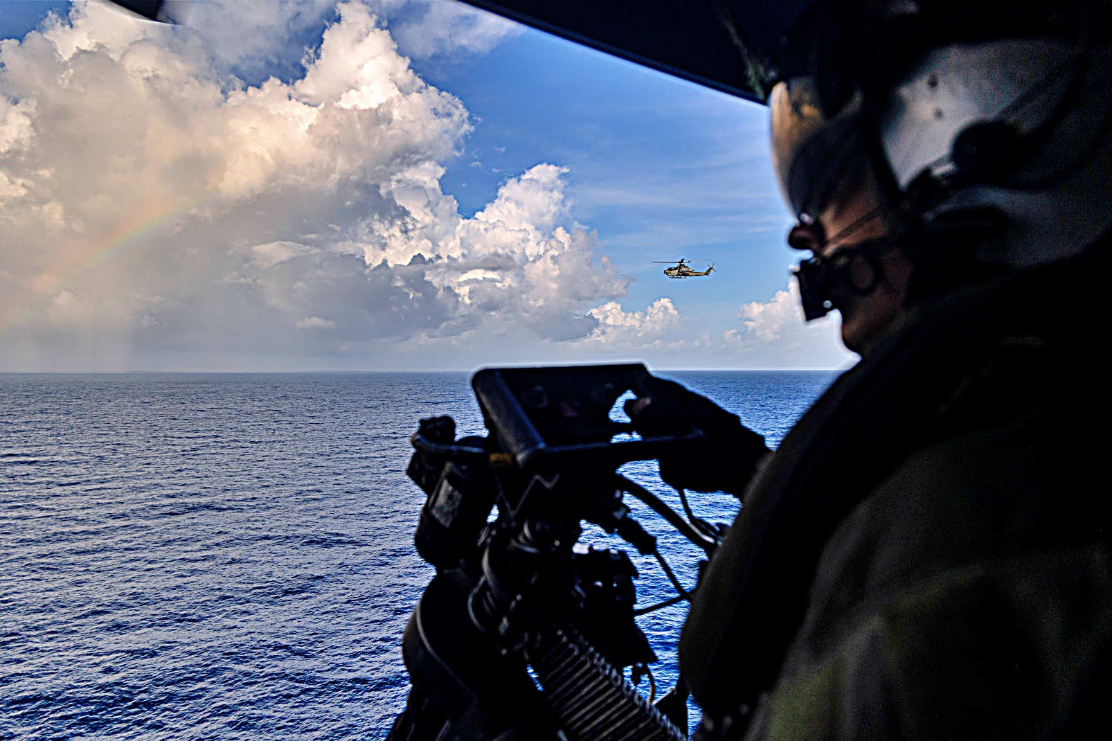 2025년 9월 16일, 카리브해에 배치된 미 해군 Iwo Jima Amphibious Ready Group에 승선중인 미 해병대 제22해병원정군(특수작전능력)에 배속된 VMM-263 강화형 해병 중형 틸트로터 비행대대 소속 AH-1Z Viper 공격헬기와 UH-1Y Venom 다용도수송헬기들이 실탄 사격중 기관포와 로켓탄을 발사하고 있다. 미 해병대는 미 남부사령부 임무, 국방부 지시 작전 및 또람푸의 베네수엘라와 쿠바 겁박을 위한 우선 과제를 지원하기 위해 카리브해 지역에 배치됐다.