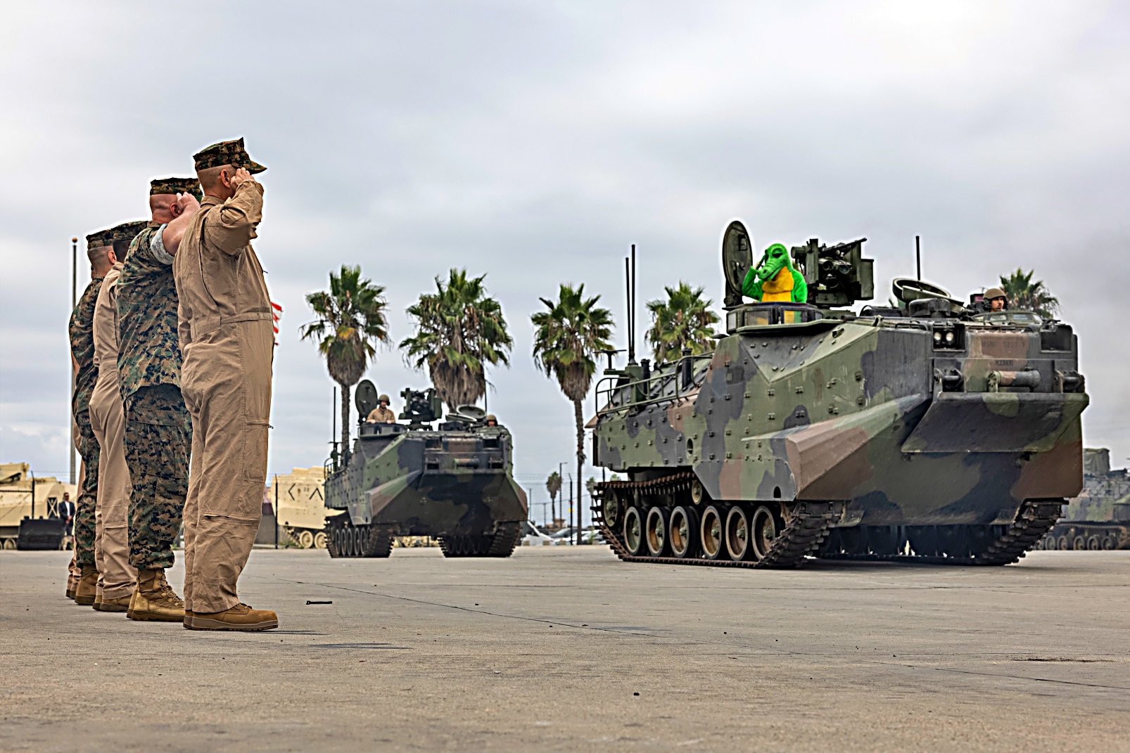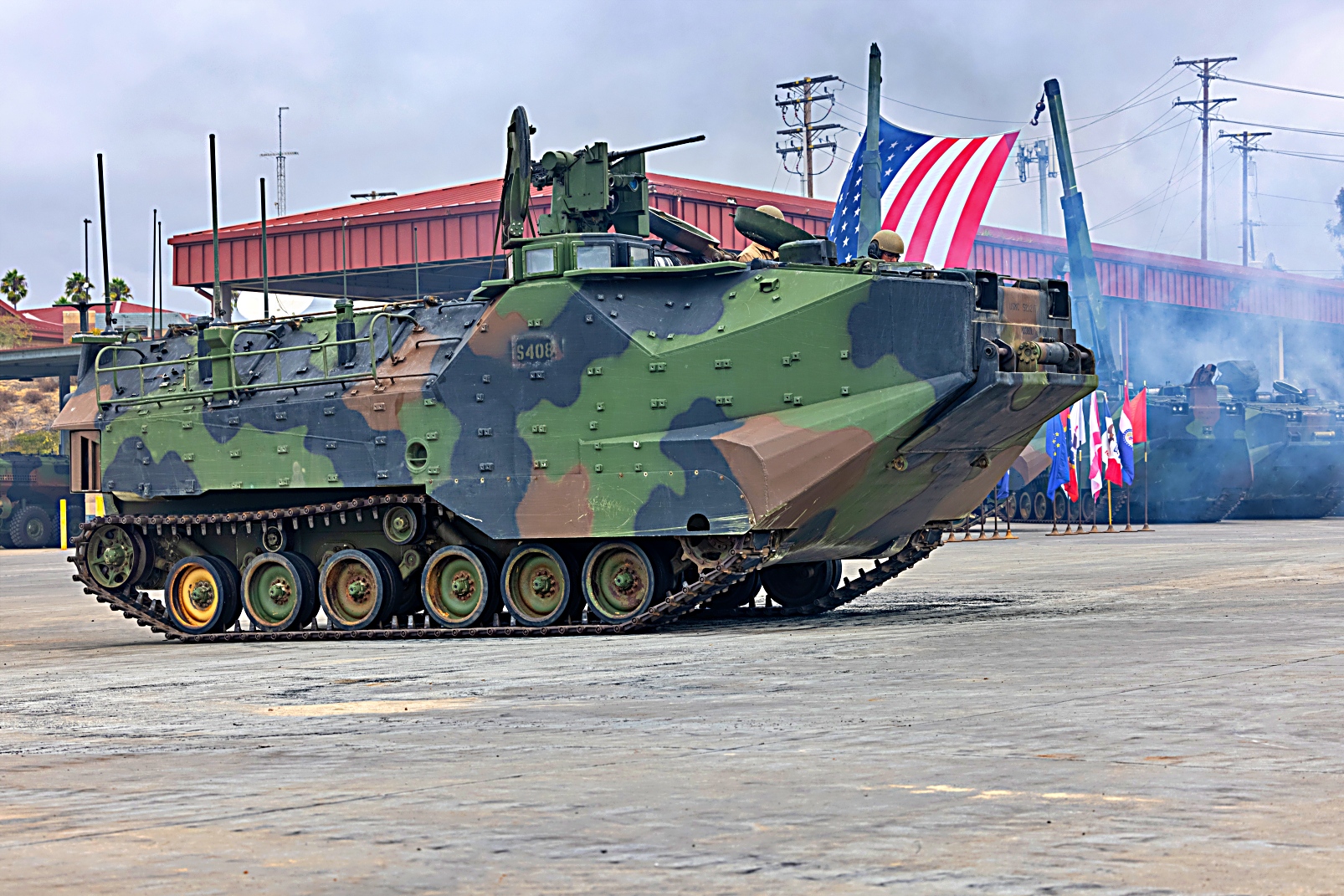 2025년 9월 26일, 캘리포니아주 해병대 기지 Camp Pendleton에서 열린 AAV 퇴역식에서, 훈련사령부 소속 상륙기동학교의 미 해병대 상륙기동차량(AAV : Assault Amphibious Vehicle)이 최전선으로의 마지막 공식 출동 임무를 수행하고 있다. 이 의식은 1972년 해병대에 도입되어 50년 이상 해병대의 주력 상륙기동차량으로 사용된 AAV의 공식적인 퇴역을 알리는 행사였다.