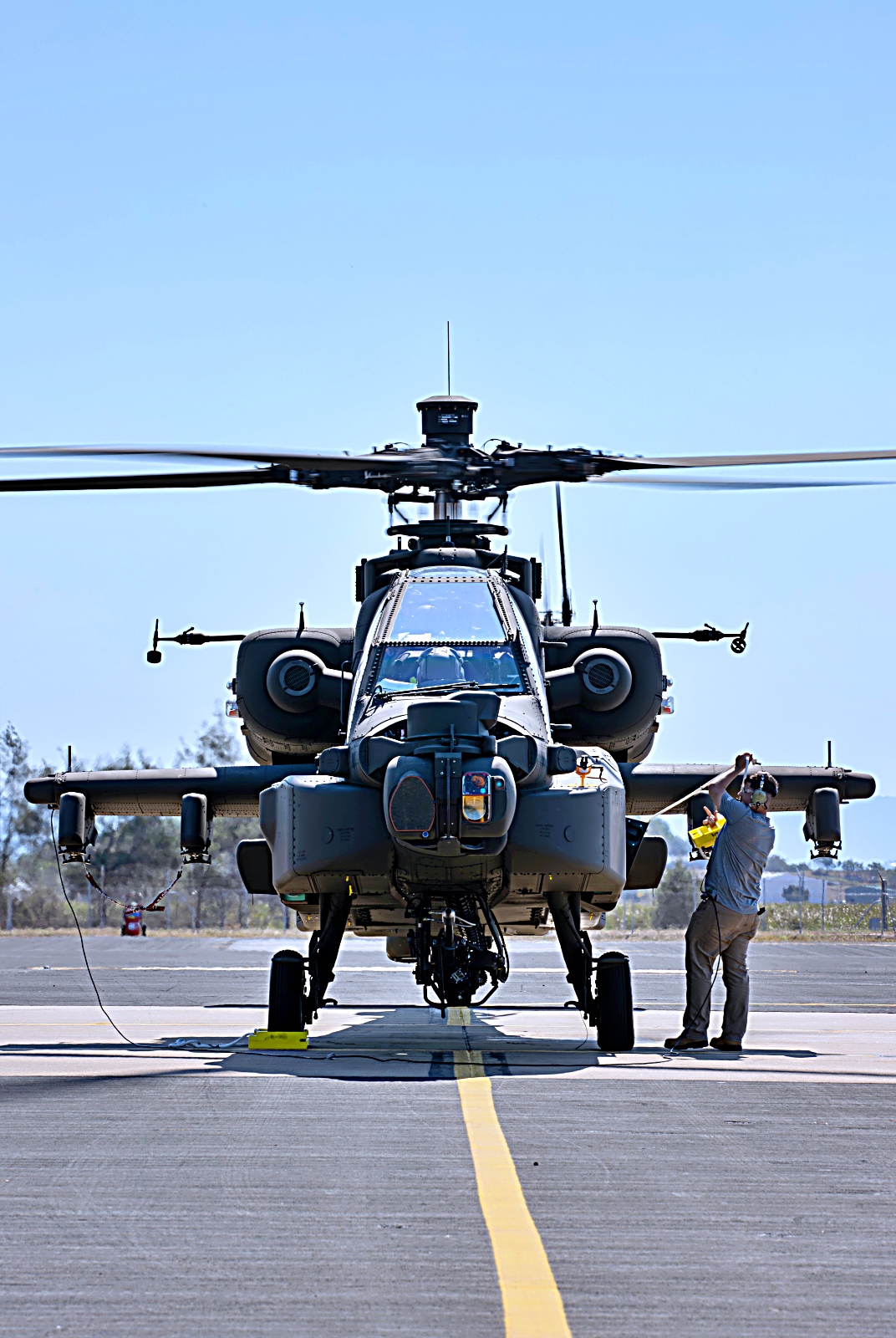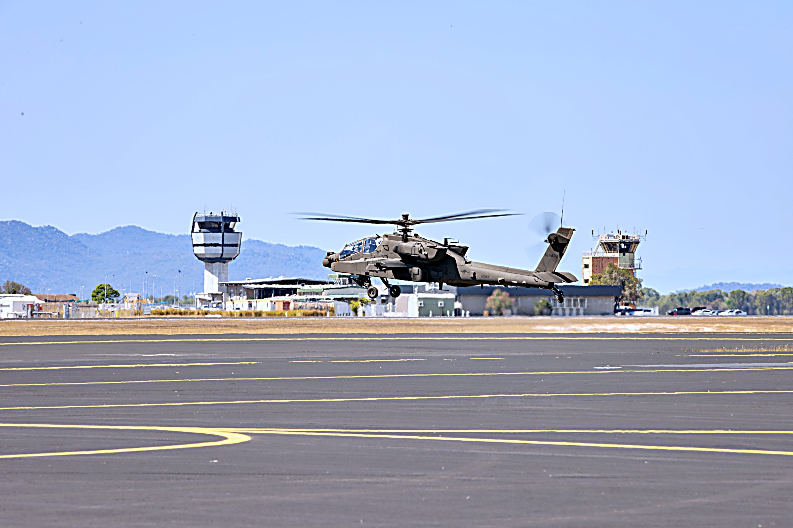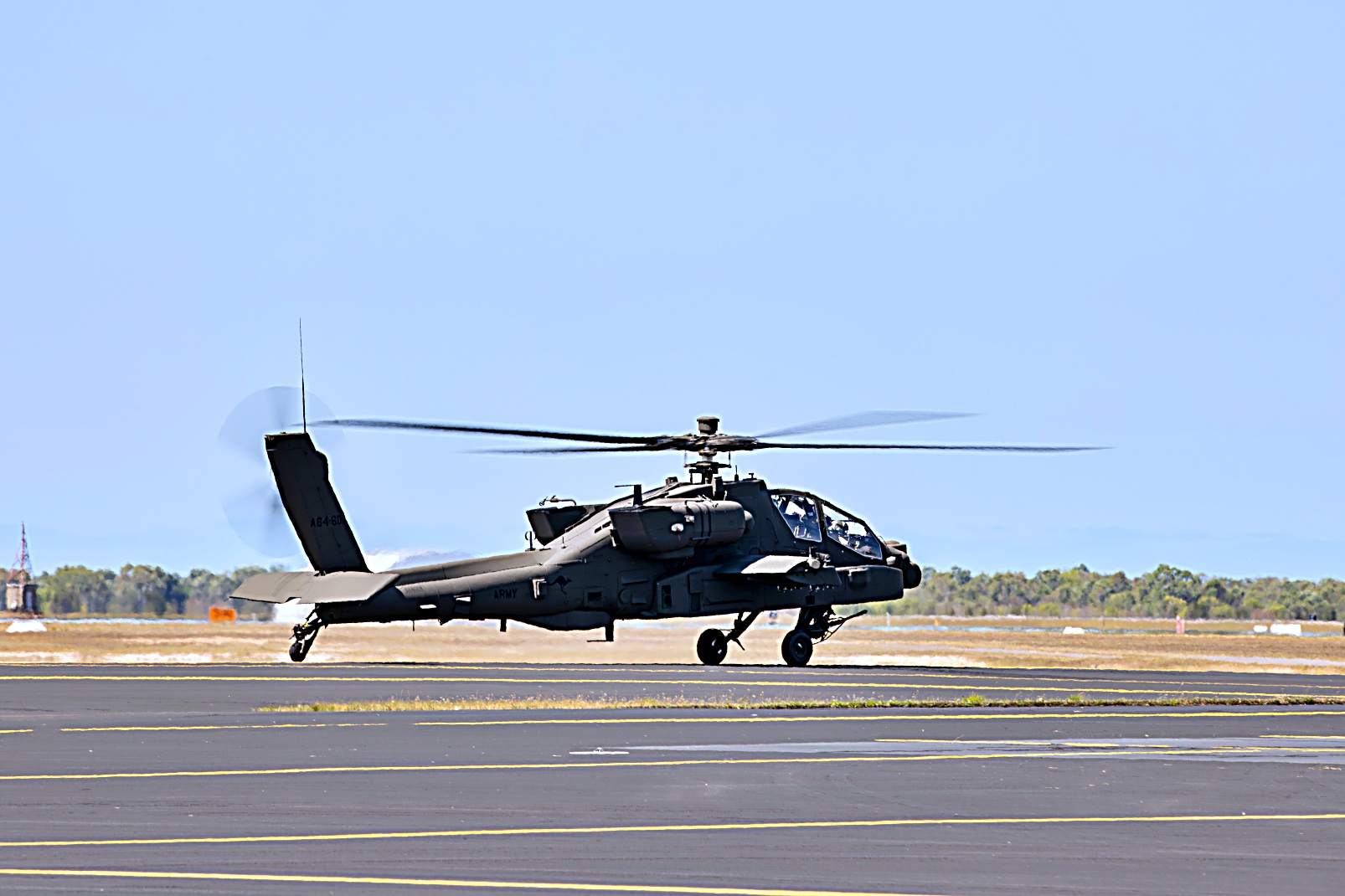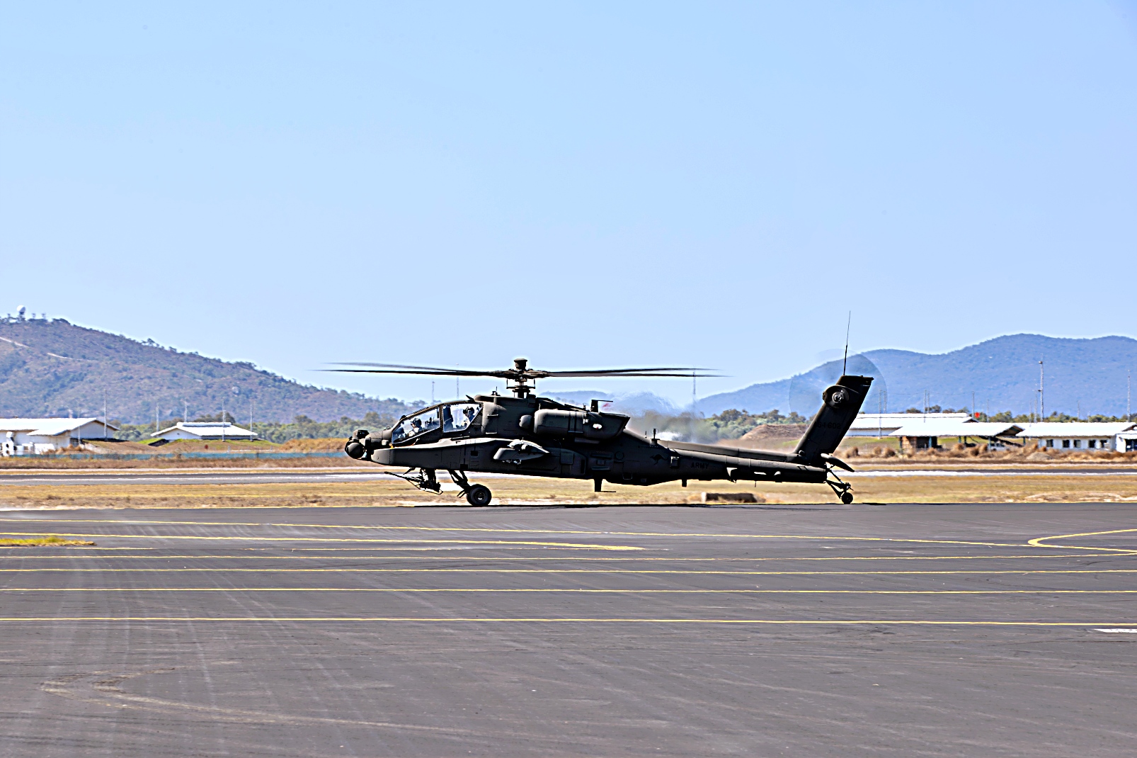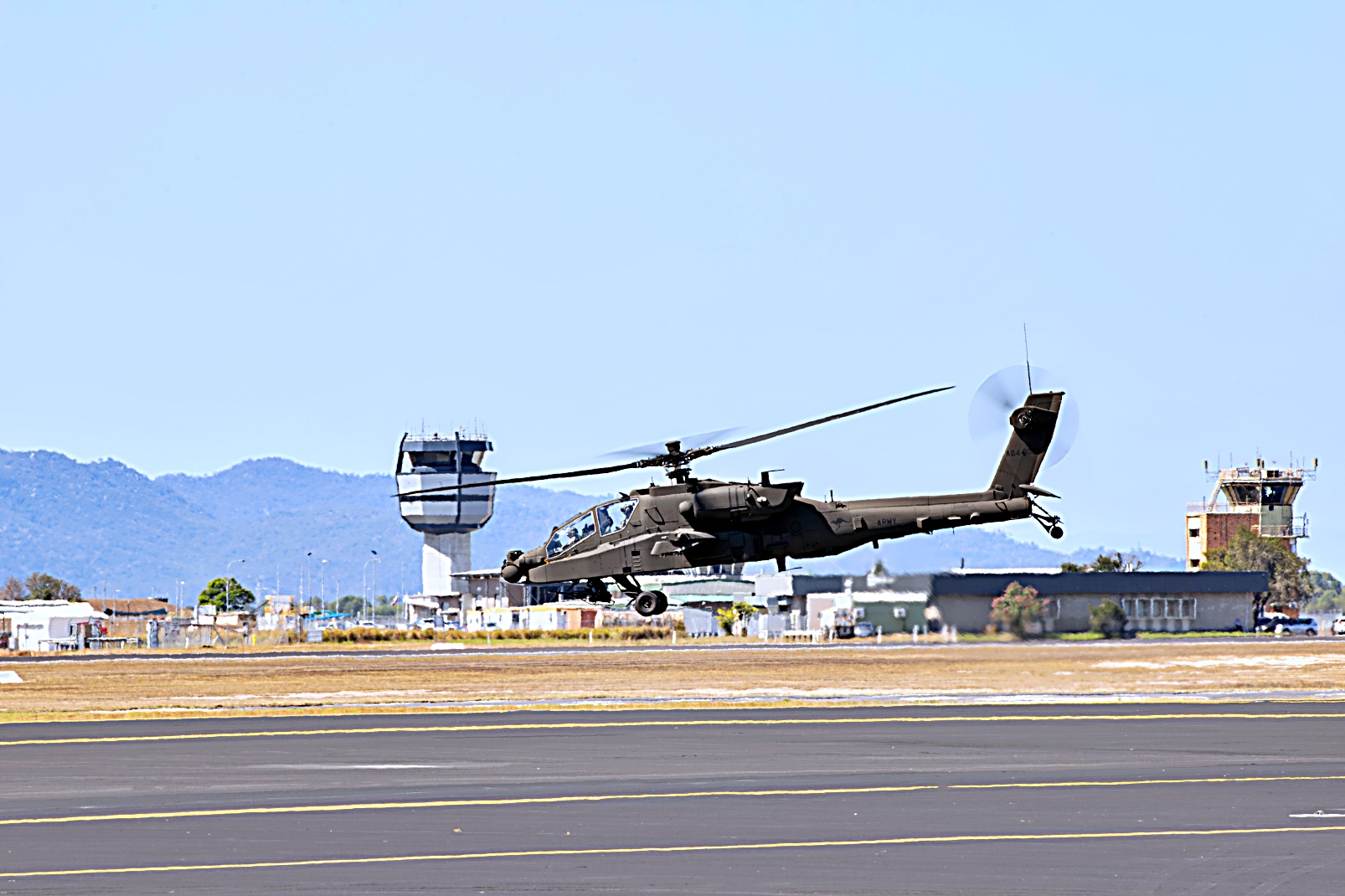 2025년 9월 30일 미국 조종사들이 퀸즐랜드주 Townsville에서 호주 육군이 인수한 첫 두 대의 Apache AH-64E Guardian 중 한 대의 정비 시험 비행을 수행하고 있다.