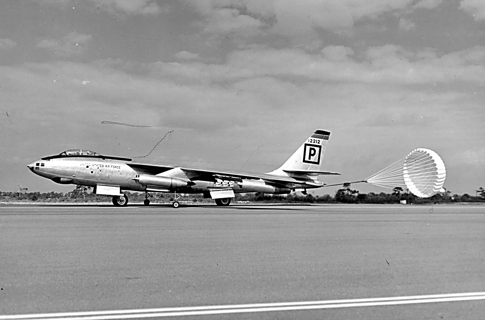 이와 관련 착륙 접근 시 엔진 출력을 줄여야 한다는 문제가 있었다. 출력을 다시 최대까지 올리는 데 최대 20초가 소요될 수 있어, 폭격기는 “터치 앤드 고” 순간 착륙을 쉽게 수행할 수 없었다. 16피트(약 4.9m) 길이의 "approach chute"(드로그 낙하산)은 공기역학적 항력을 제공하여 엔진을 즉시 가동 가능한 중간 출력으로 감속한 상태에서도 접근 속도로 비행할 수 있게 했다. 지상에서는 조종사들이 32피트(약 9.8m) 길이의 “브레이크 낙하산”을 사용했다. 브레이크 낙하산은 앞쪽 노즈 기어에 강하게 착륙한 후 항공기가 “돌고래처럼 뛰는 현상”(porpoising) 또는 바운싱을 방지하기 위해 전개될 수 있었다.훈련에는 일반적으로 접근 낙하산을 끌고 착륙 패턴을 여러 차례 연습 착륙하는 1시간이 포함됐다.