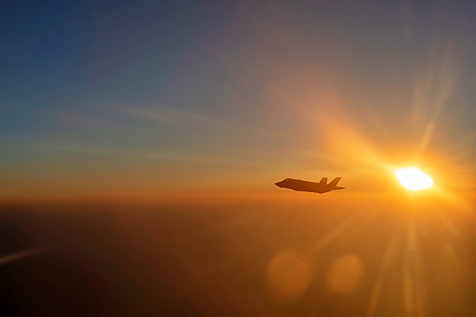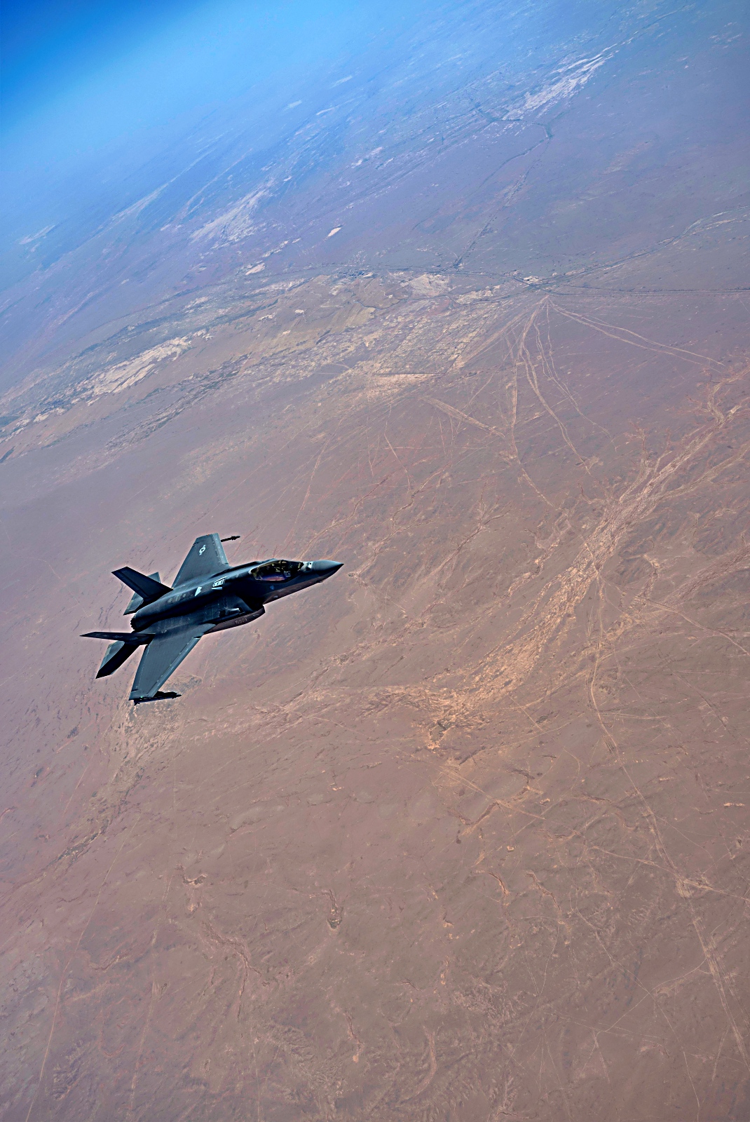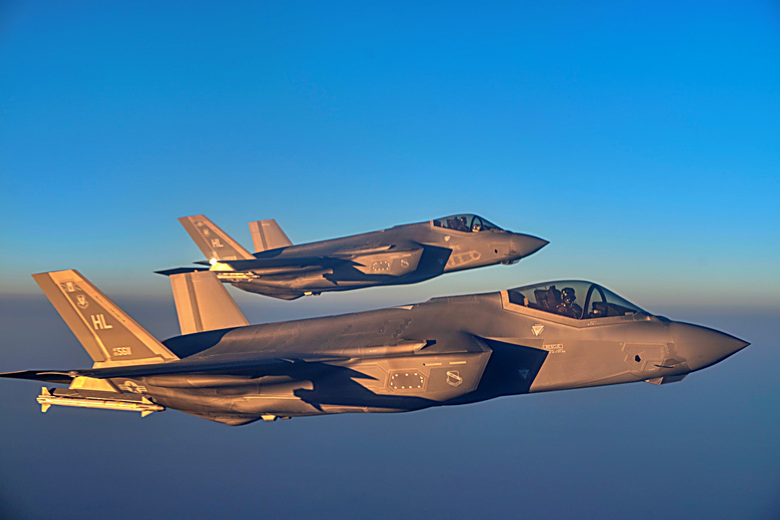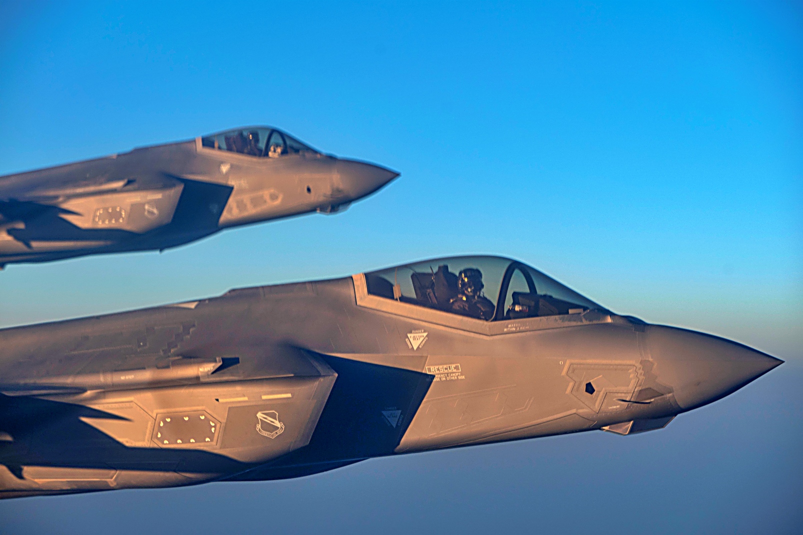 2025년 6월 6일, 미 공군 F-35 Lightning II 공격기 2대가 미 중앙사령부 관할 구역 상공에서 편대를 이루어 비행 중이다. 이 지역에 배치된 5세대 첨단 전투기는 적의 어떠한 공격 행위나 침략 위협에 대응하기 위해 군사 태세를 조정할 수 있는 미군 및 연합군의 역량을 보여준다.