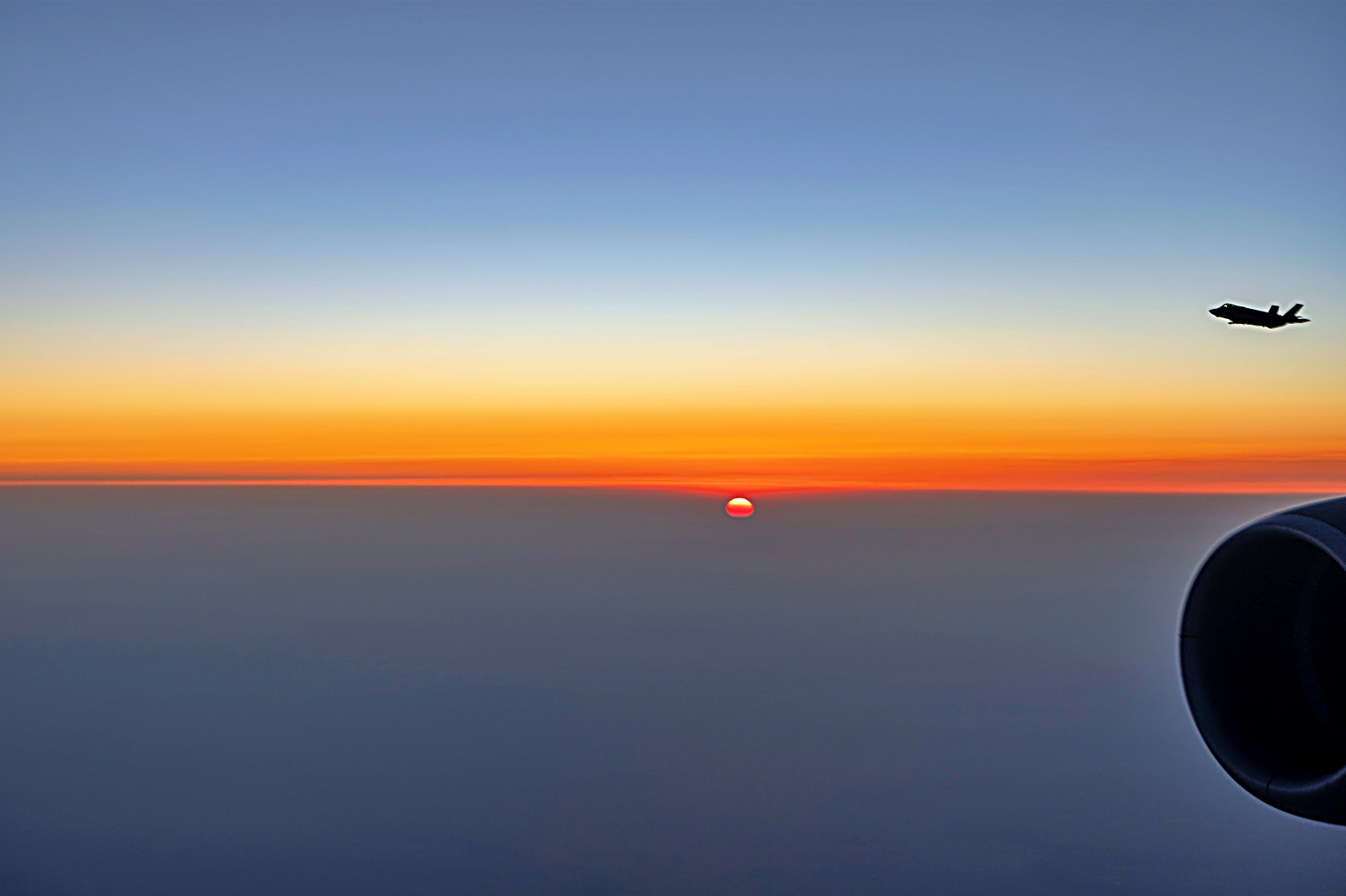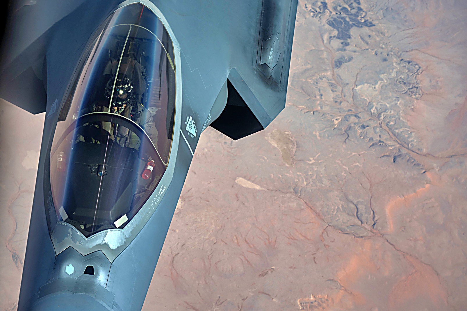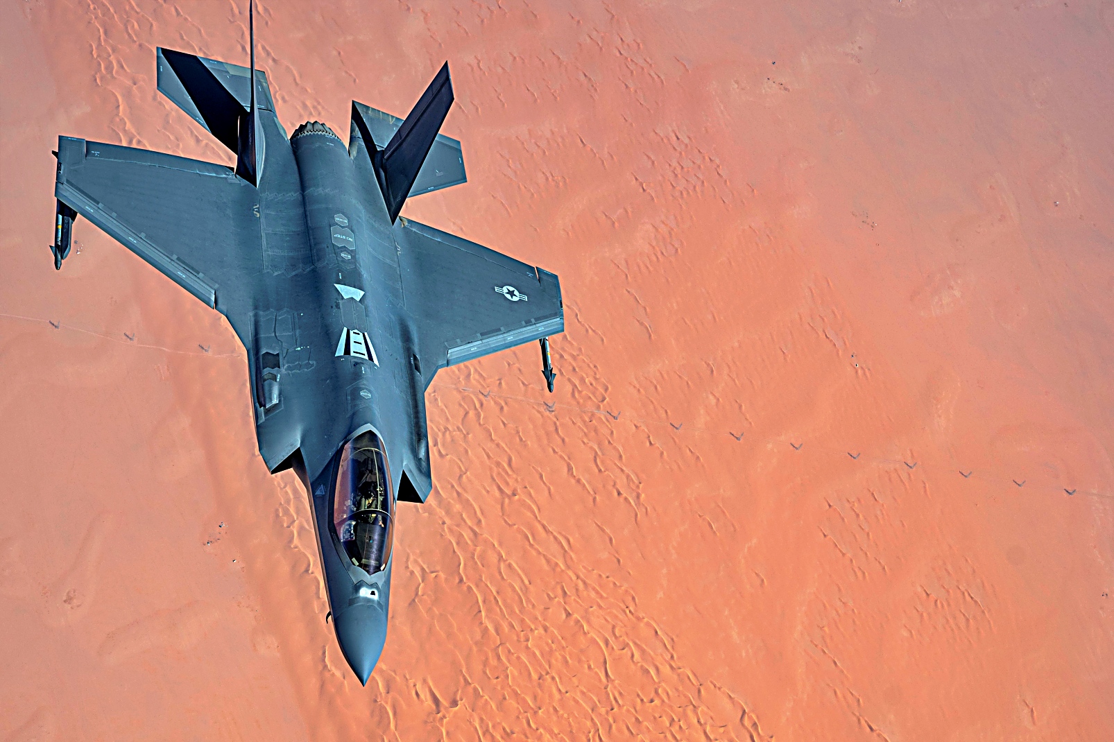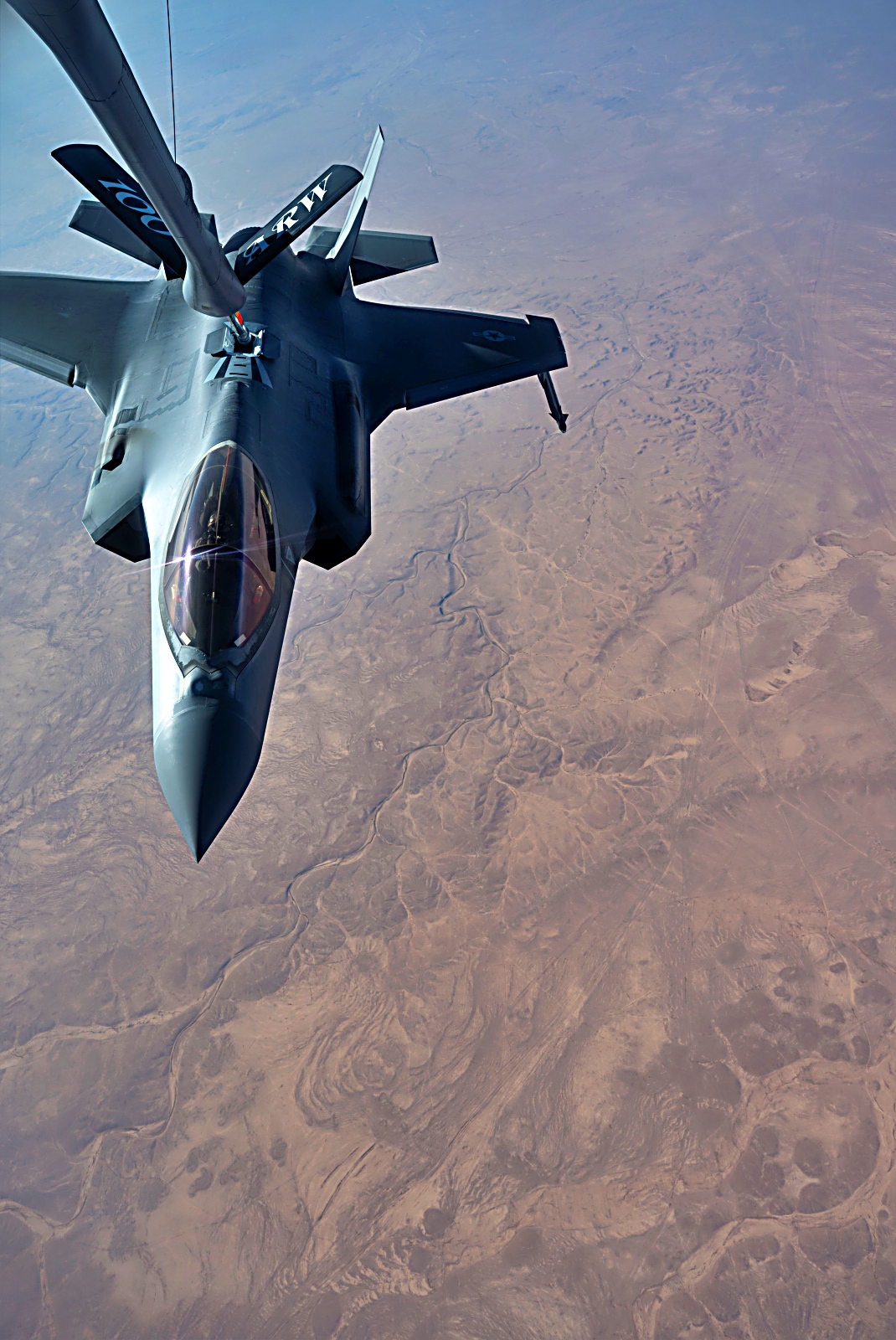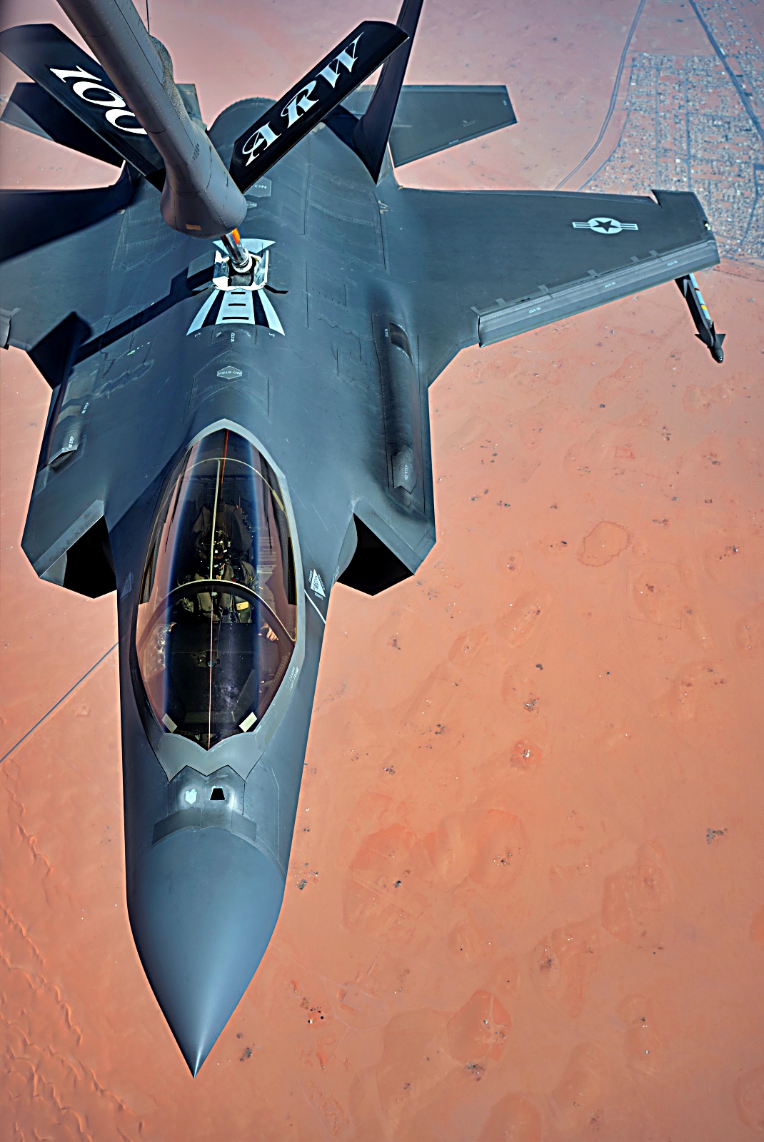 앞서 5월 30일, 미 공군 F-35 공격기가 미 중앙사령부 관할 구역 상공에서 야간 초계비행중 공중 급유를 받고 있다. F-35는 공중, 우주, 지상, 해상 및 사이버 자산을 통합하여 미국의 전투력을 한층 강화하는 탁월한 공중 영역 인지 능력을 제공한다.