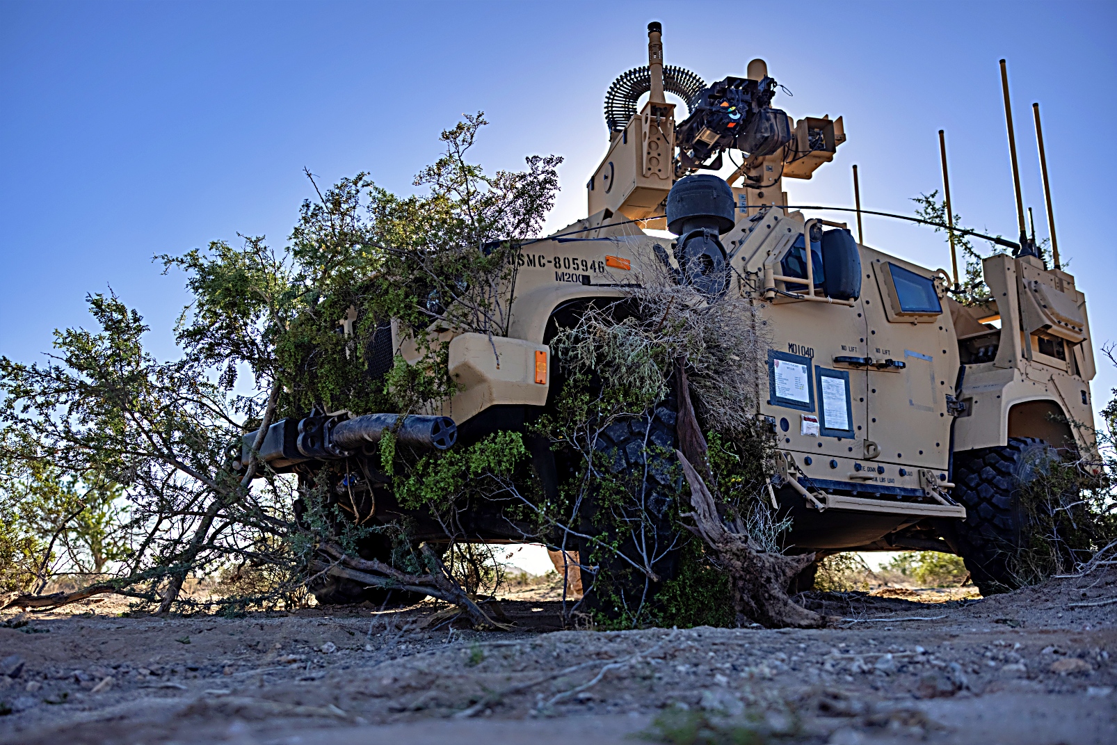 미 해병 제3해병항공대 제3저고도방공대대에 배치된 LMADIS (Light Marine Air Defense Integrated System)을 탑재하는 Polaris MRZR 고기동차량들이 2024년 10월 10일 아리조나주 Wellton 인근 Tacts Airfield 에서 무기 및
