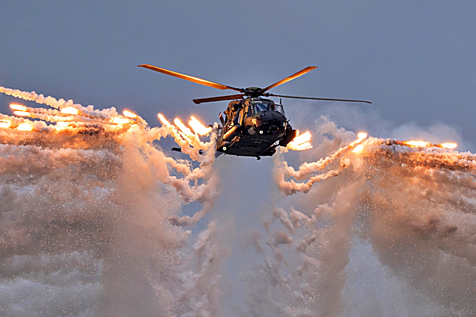 NH-90 헬기가 플레어를 발사하고 있다. 이 플레어는 열추적 유도 미사일을 유도한다.