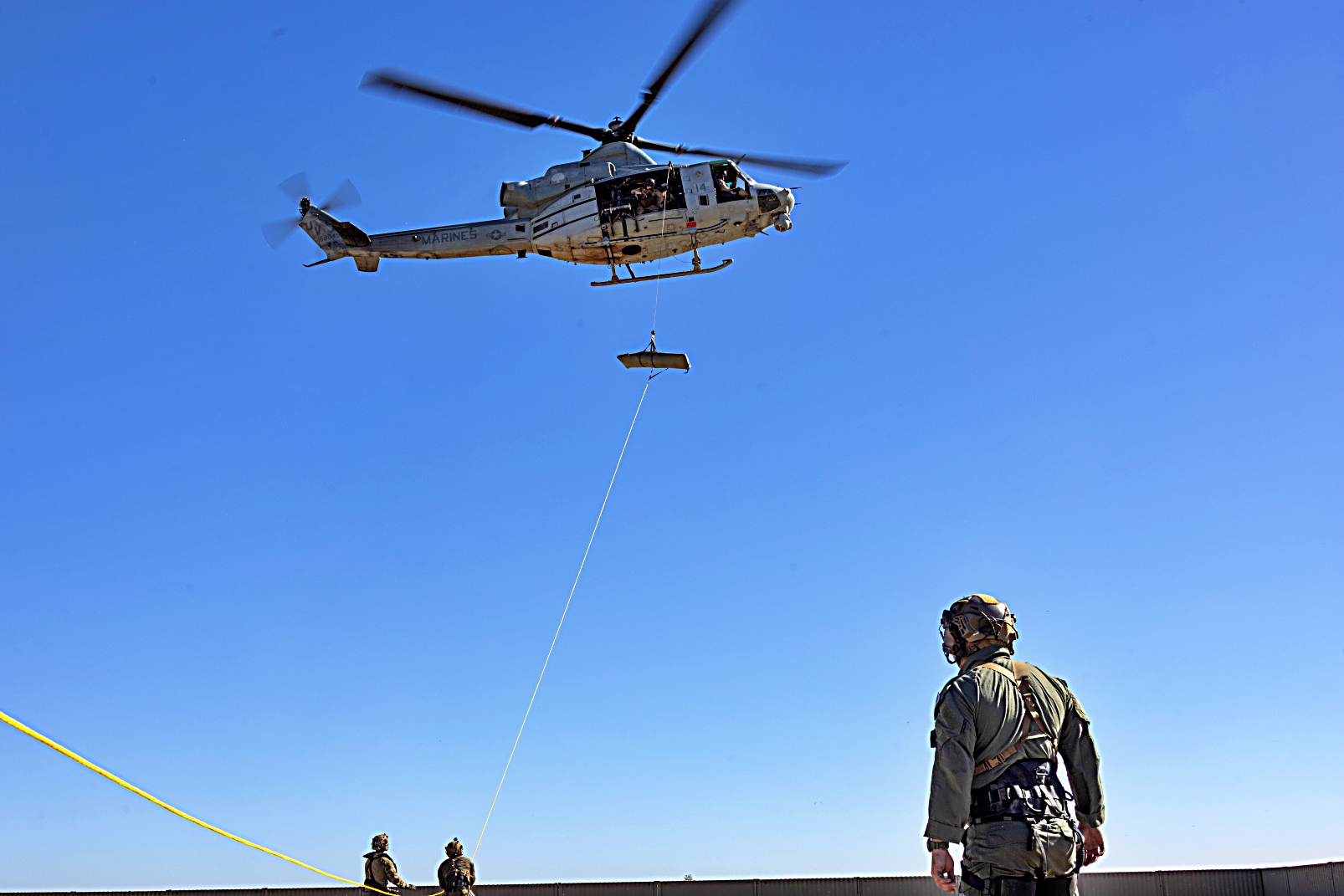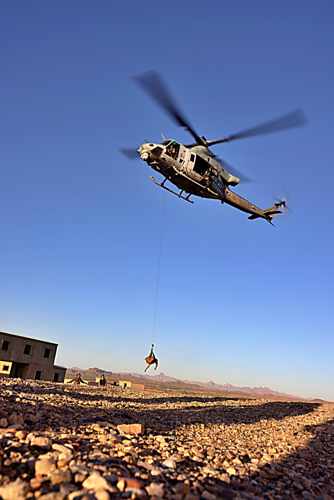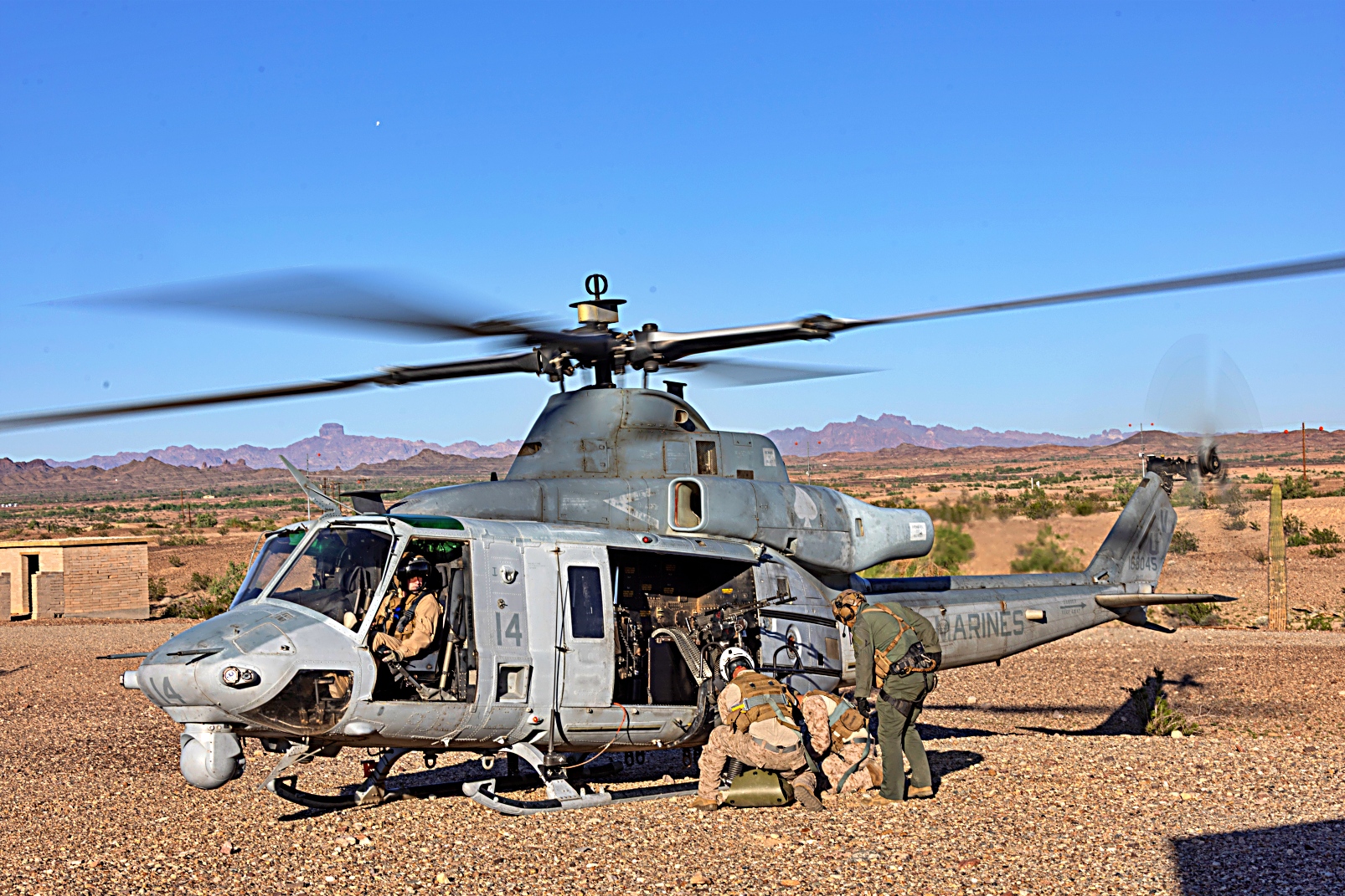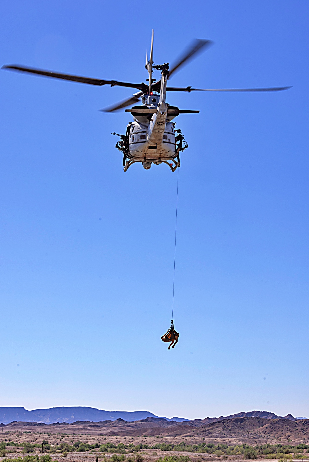 미국 해병대 제1해병항공무기전술대대(MAWTS-1) 소속 UH-1Y Venom 헬기가 2025년 10월 3일 애리조나주 유마 인근에 조성된 중동의 한 마을을 묘사한 Club Med에서 진행된 무기전술교관과정 1-26 (Weapons and Tactics Instructor course 1-26)의 일환으로 부상자 후송 및 호이스트 훈련 (CASEVAC : casualty evacuation and hoist exercise)중 모의 부상자를 호이스트로 들어 올리고 있다.