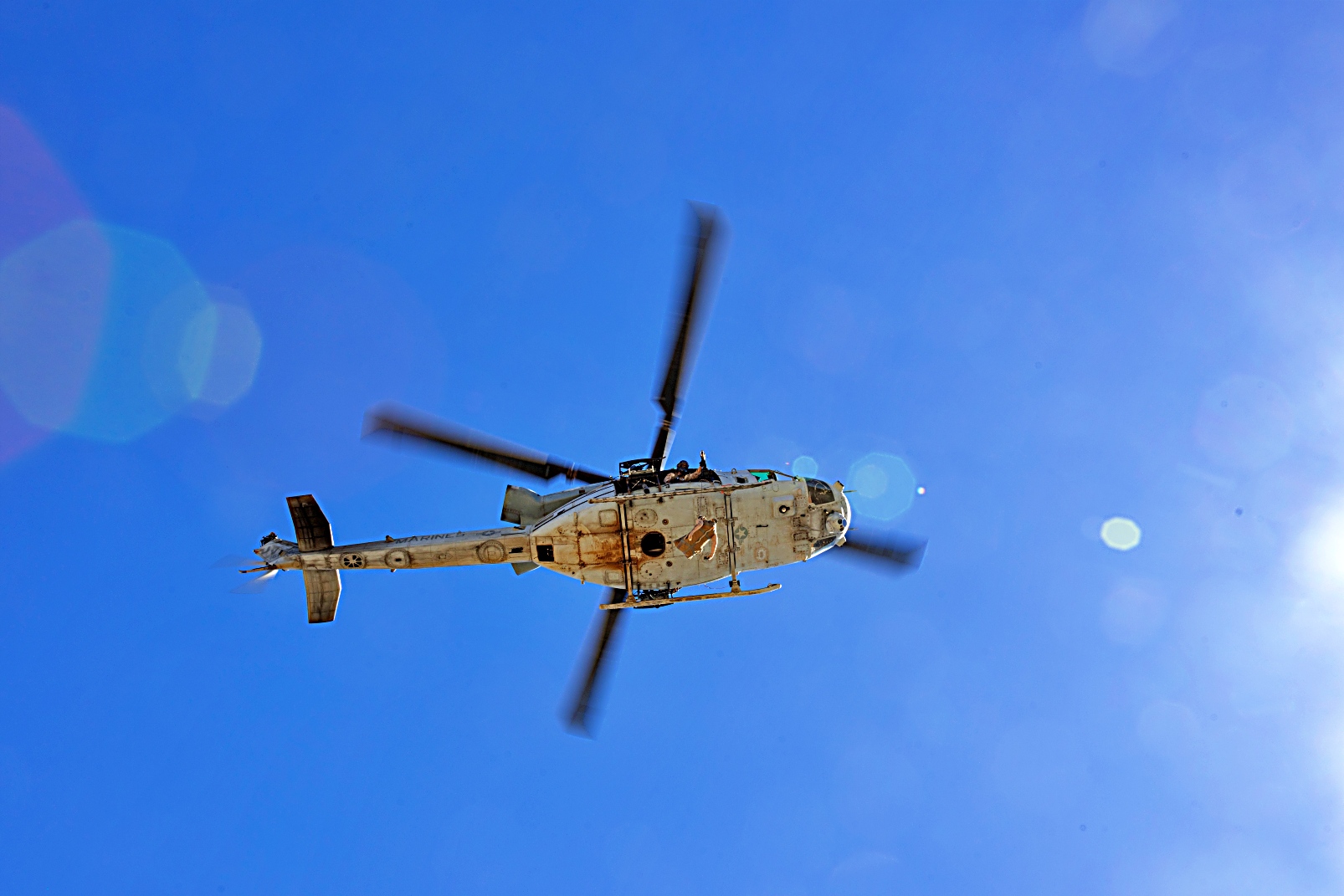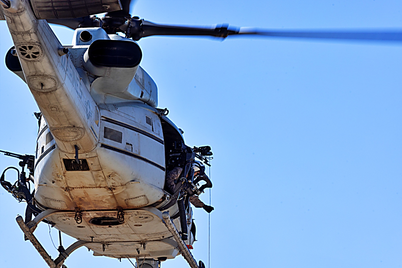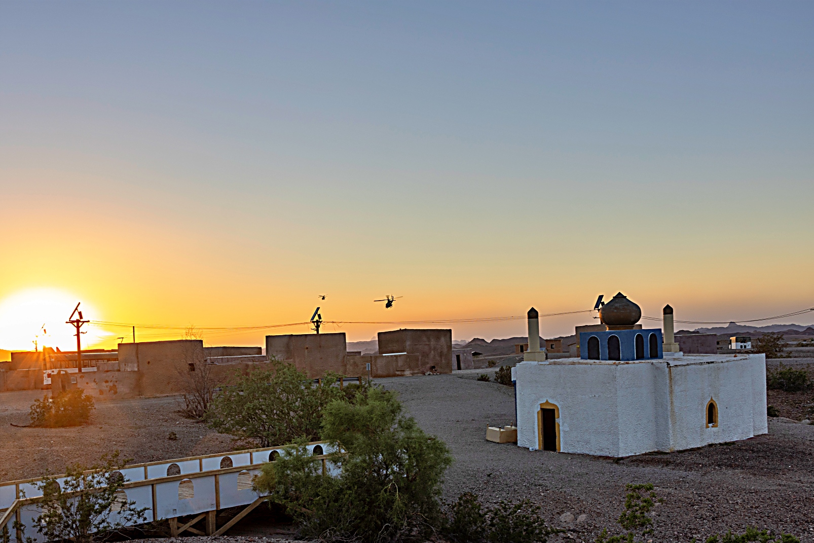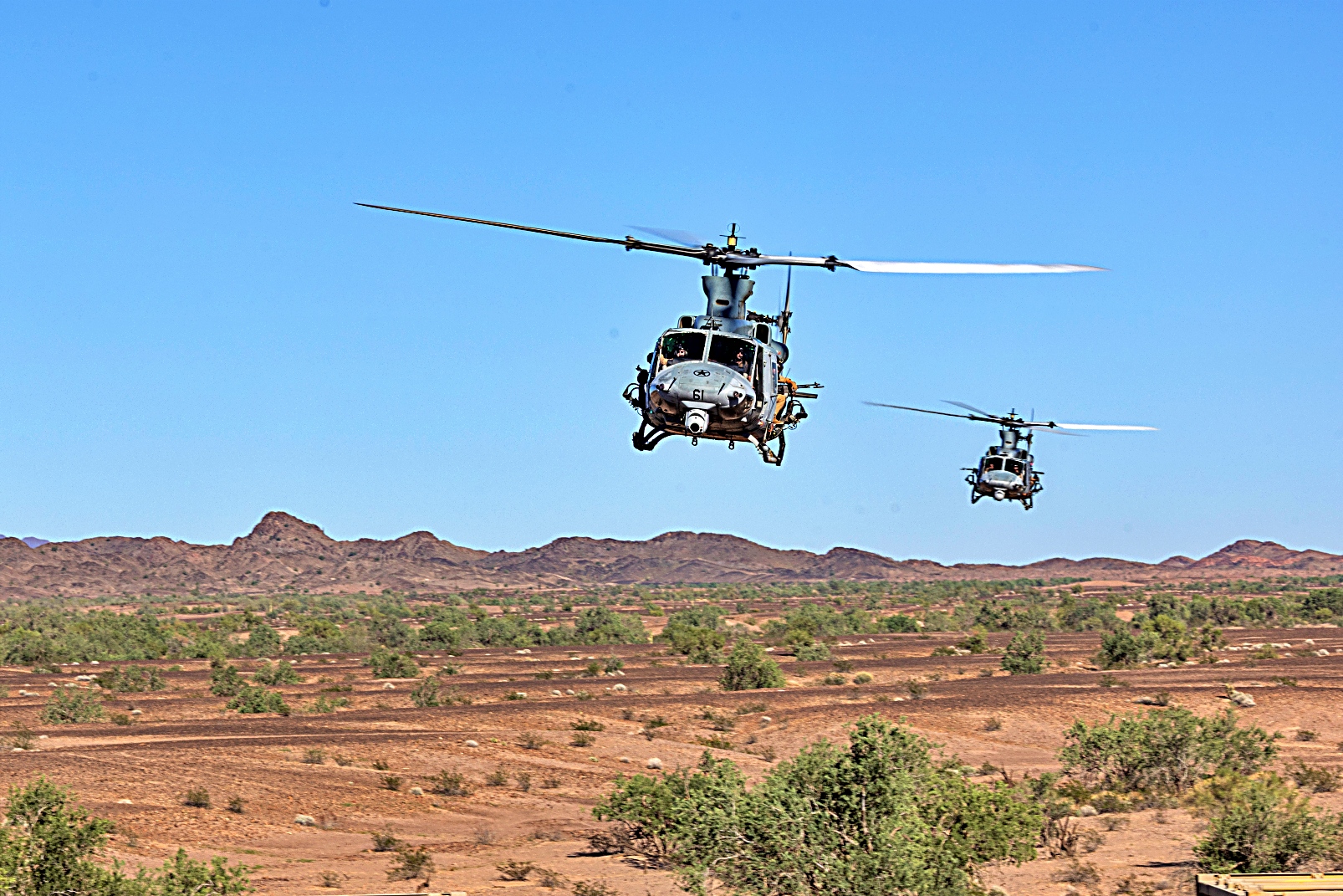 미국 해병대 제1해병항공무기전술대대(MAWTS-1) 소속 UH-1Y Venom 헬기가 2025년 10월 3일 애리조나주 유마 인근에 조성된 중동의 한 마을을 묘사한 Club Med에서 진행된 무기전술교관과정 1-26 (Weapons and Tactics Instructor course 1-26)의 일환으로 부상자 후송 및 호이스트 훈련 (CASEVAC : casualty evacuation and hoist exercise)중 모의 부상자를 호이스트로 들어 올리고 있다.