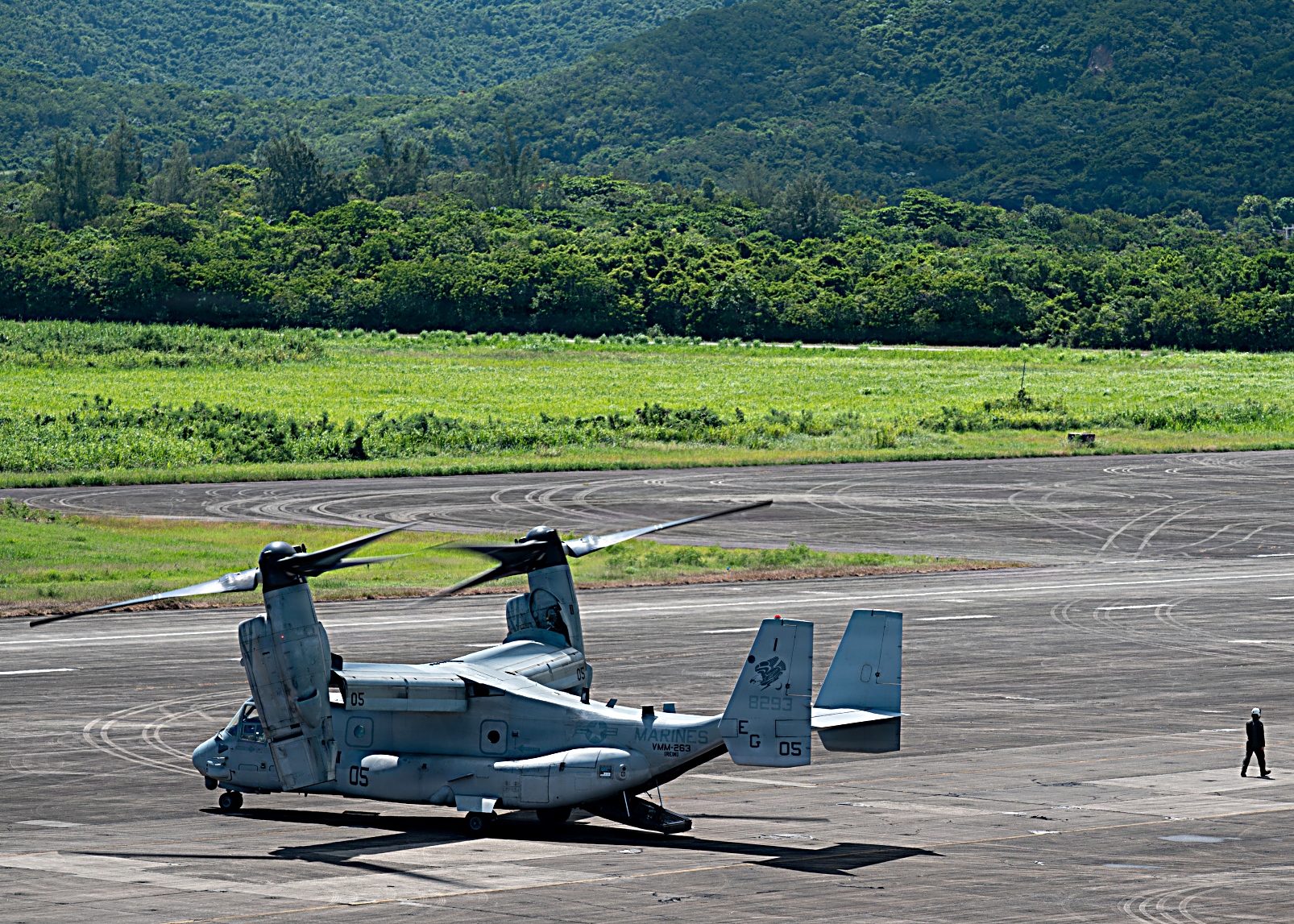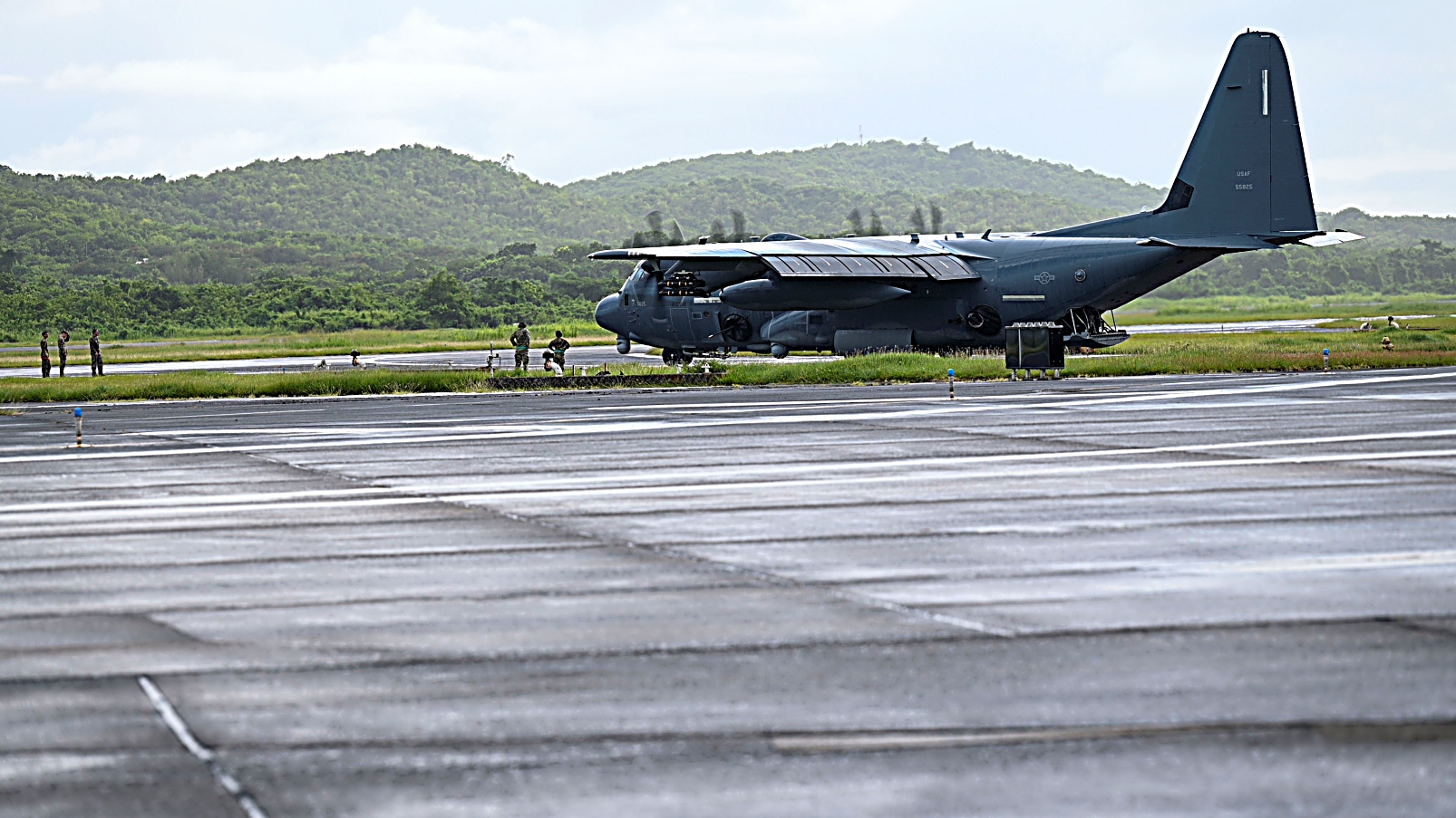 2025년 10월 2일, 푸에르토리코 Ceiba에서 미 해병대 F-35B Lightning II 공격기, KC-130J Super Hercules 급유수송기, MV-22 Osprey 수송기가 이륙준비를 하는 동안 미 공군 AC-130J Ghostrider 건쉽이 주기되어 있다.