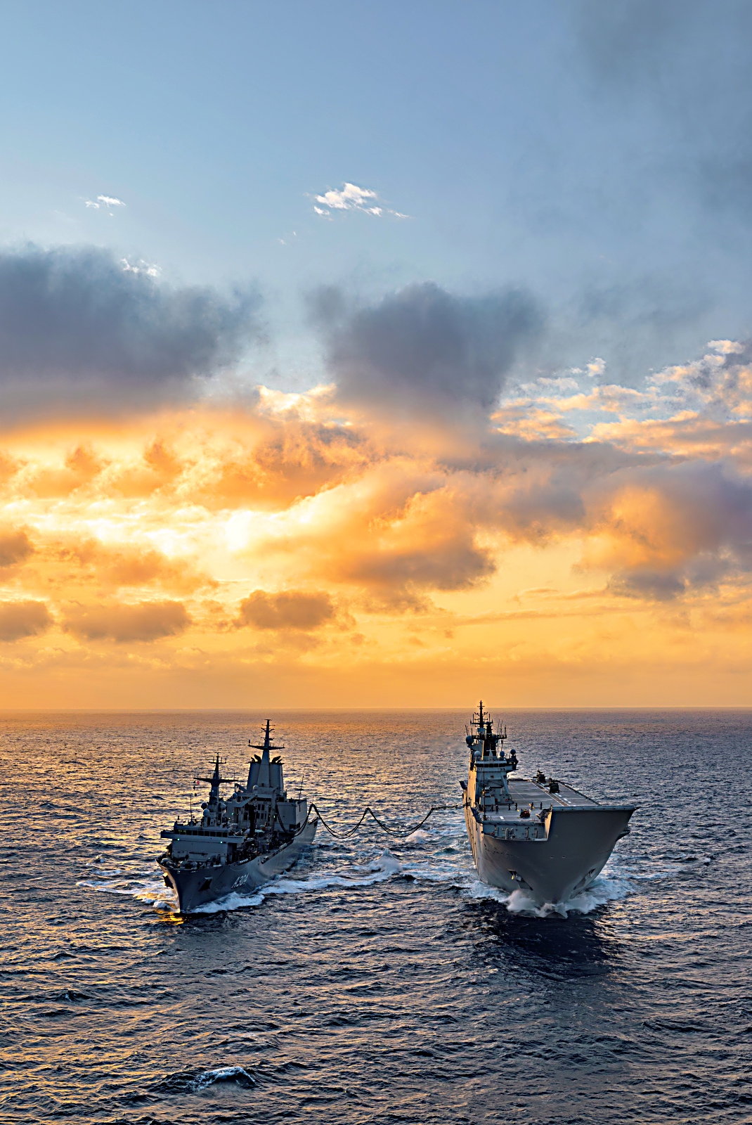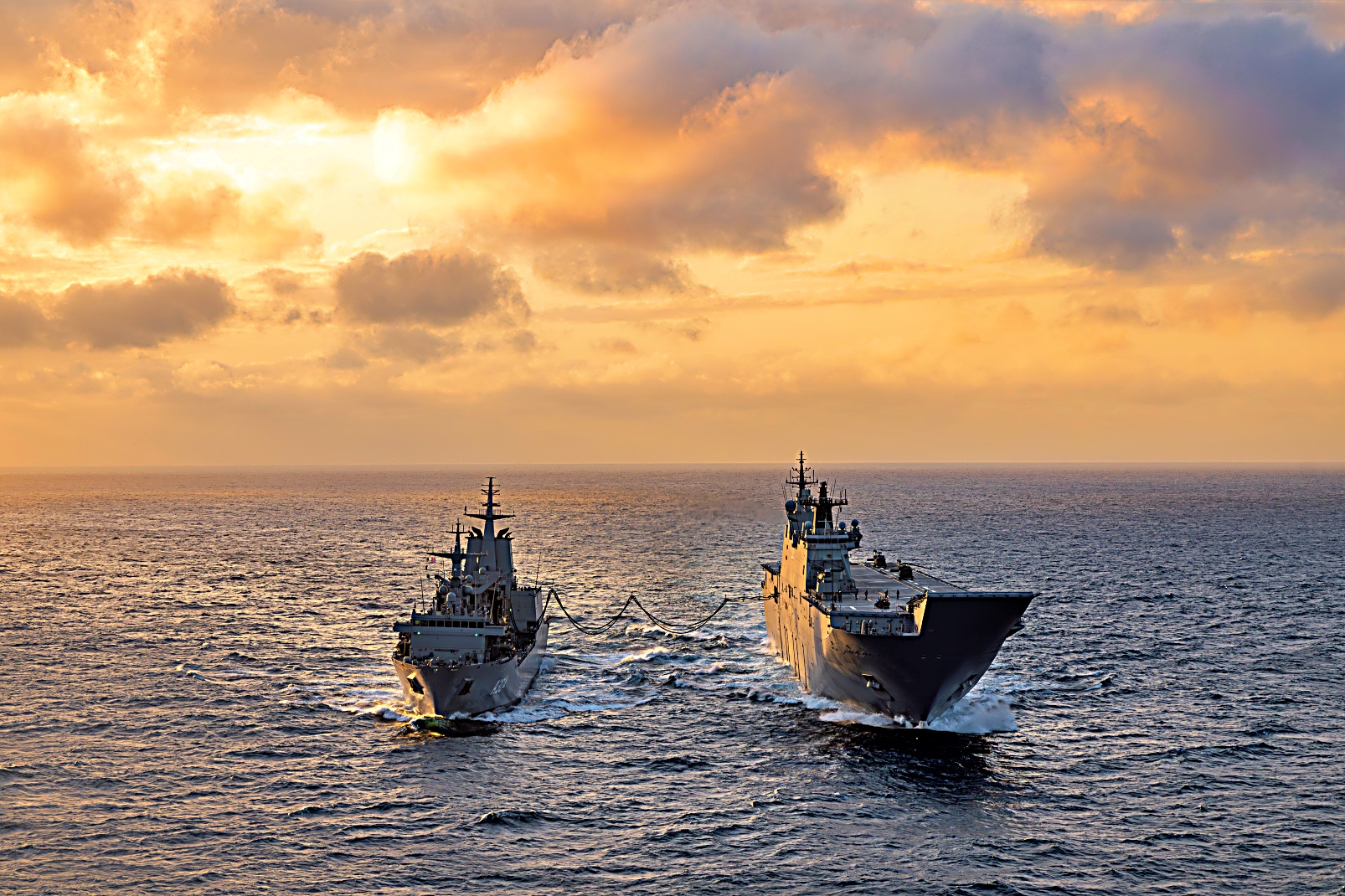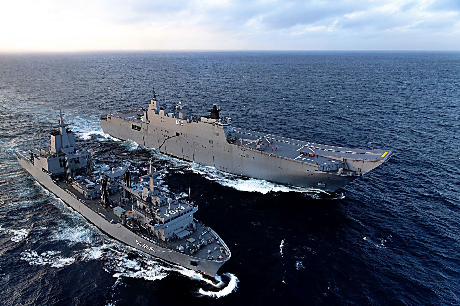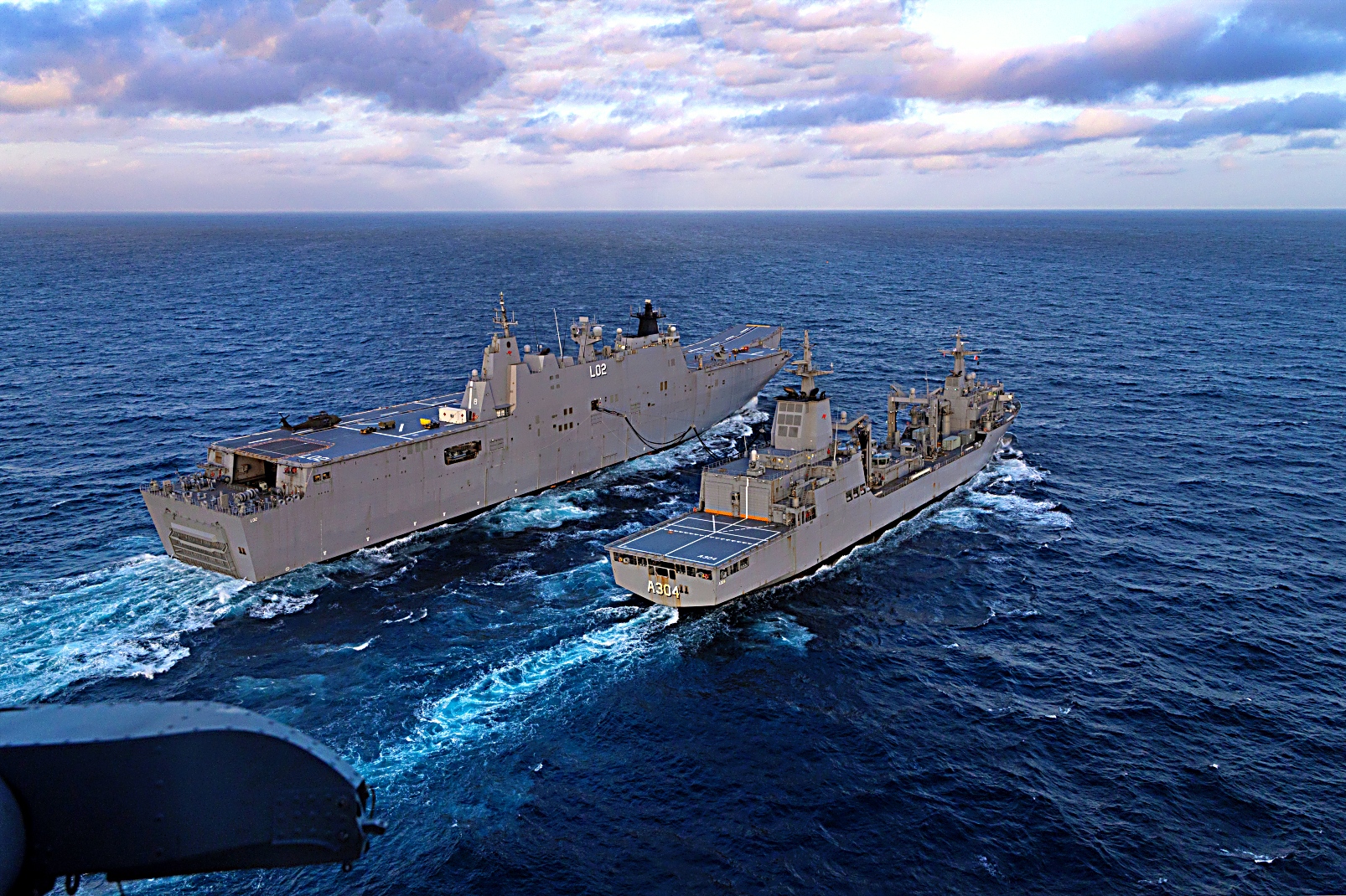 호주 해안에서 2025년 9월, 호주해군의 신형 보급함 HMAS Stalwart (III)함이 강습상륙헬기함 HMAS Canberra와 해상 보급(RAS : Replenishment at Sea)을 수행 중이다.
