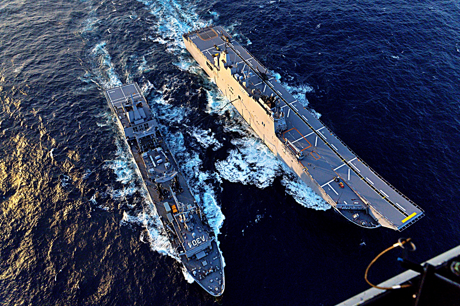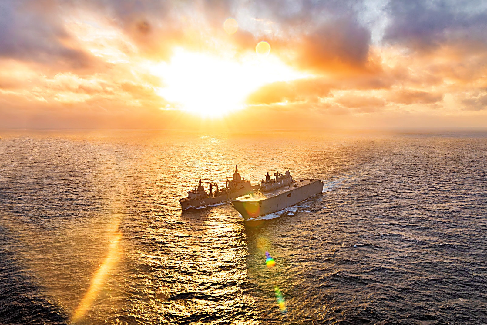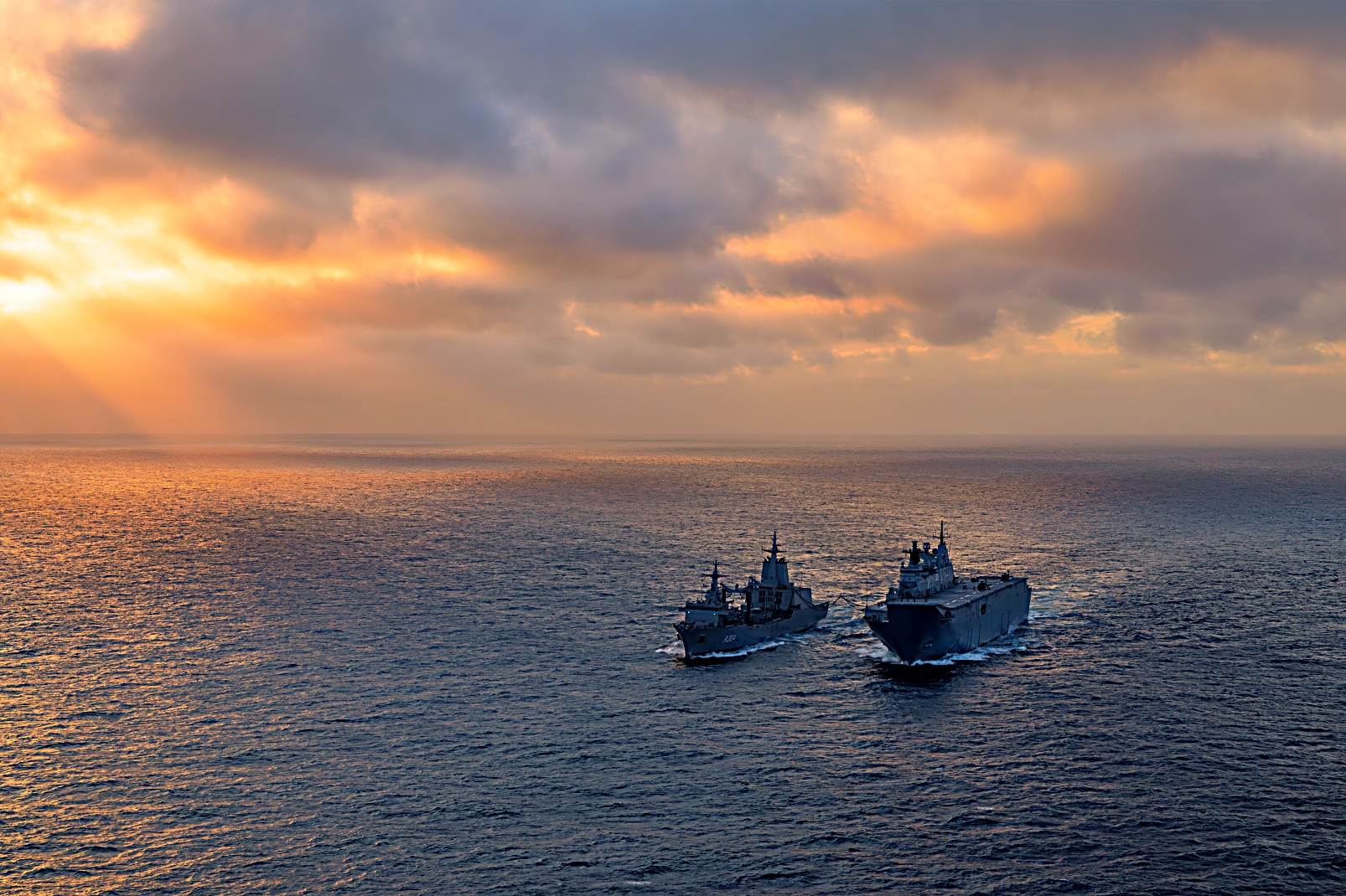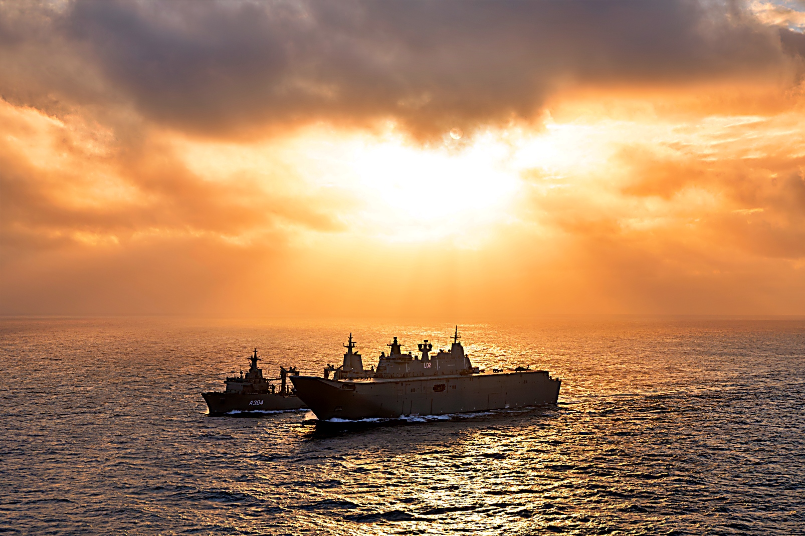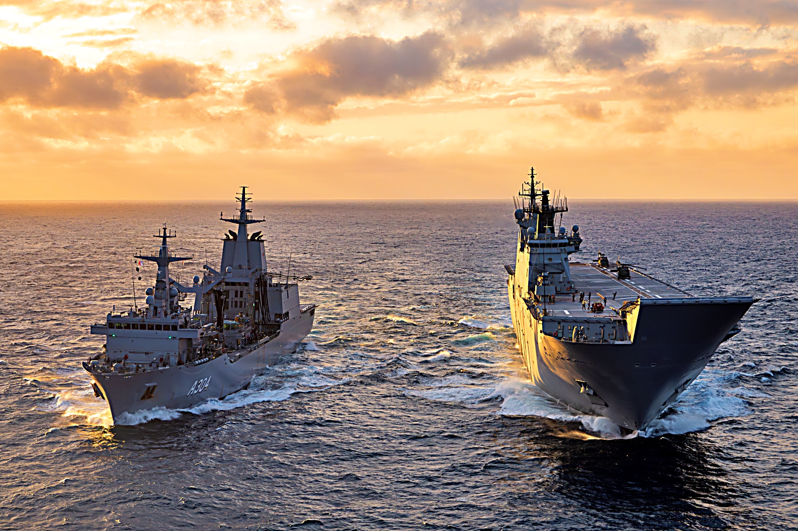 호주 해안에서 2025년 9월, 호주해군의 신형 보급함 HMAS Stalwart (III)함이 강습상륙헬기함 HMAS Canberra와 해상 보급(RAS : Replenishment at Sea)을 수행 중이다.