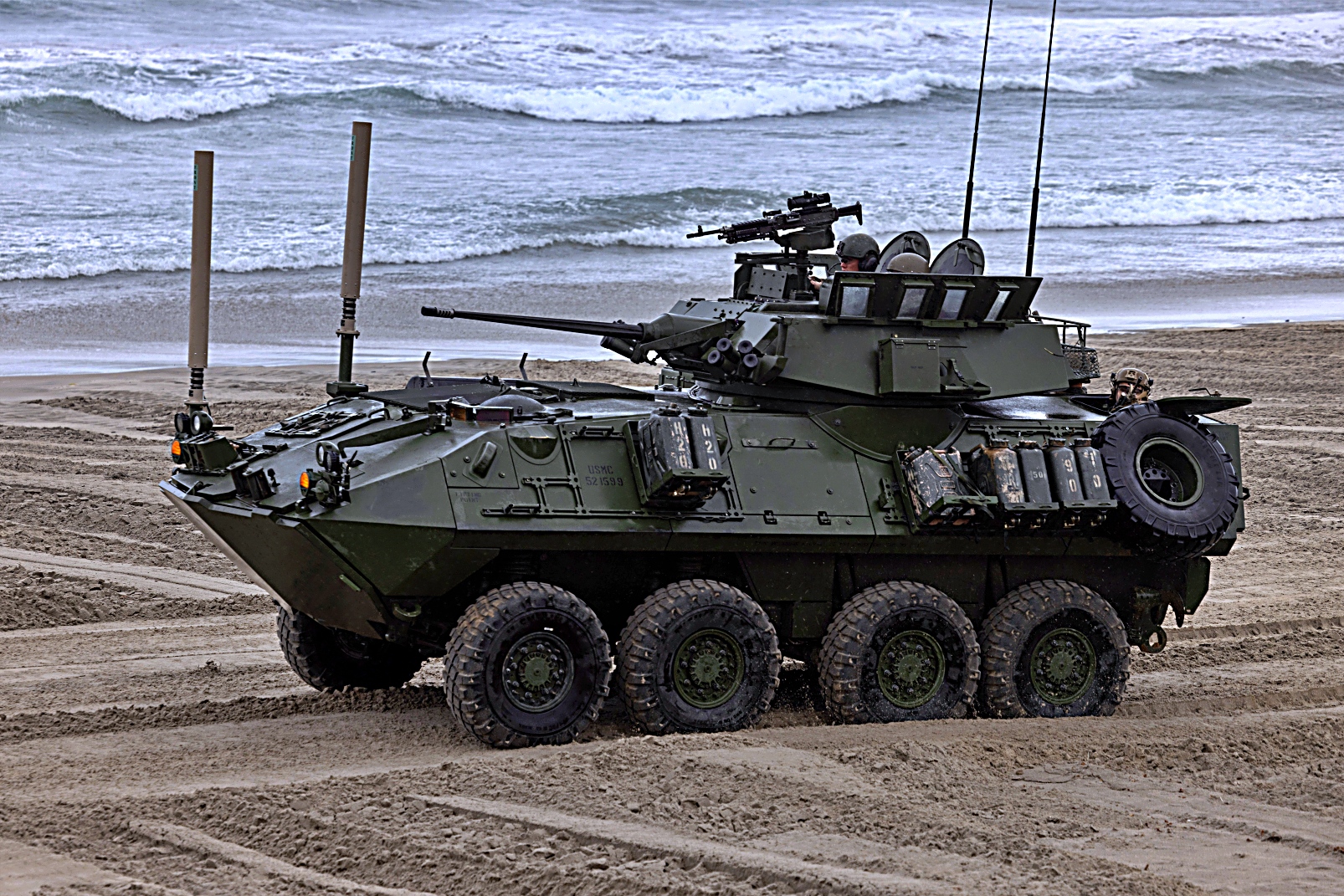 일반적인 육상 속도는 4륜 또는 8륜 구동에서 약 100km/h(62.5mph)이지만, 8륜 구동에서는 연료 효율이 감소한다.25mm M242 Bushmaster 자동포, 7.62mm M240 기관총 두 정 포탑의 좌우 전방에 위치한 4연발 연막탄 발사기 두 개가 장착됐다. 승무원은 차장, 포수, 운전수 등 3명이고, 전투 장비를 갖춘 정찰병은 4명이 후방 병력실에 탑승한다.