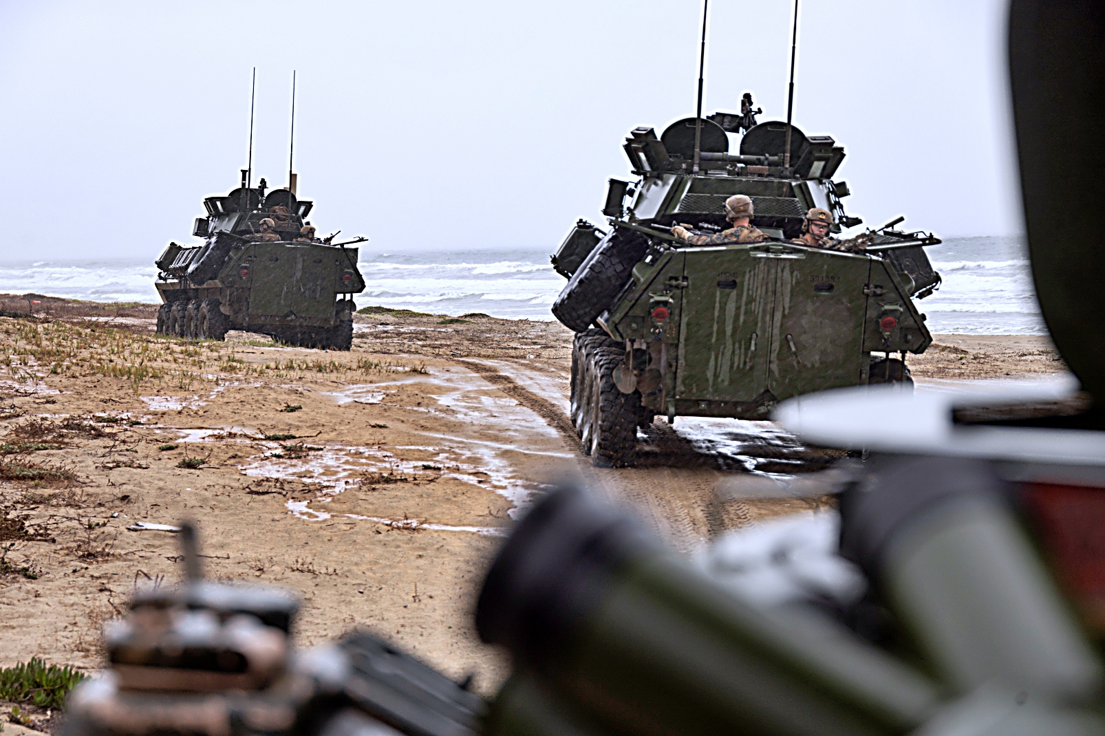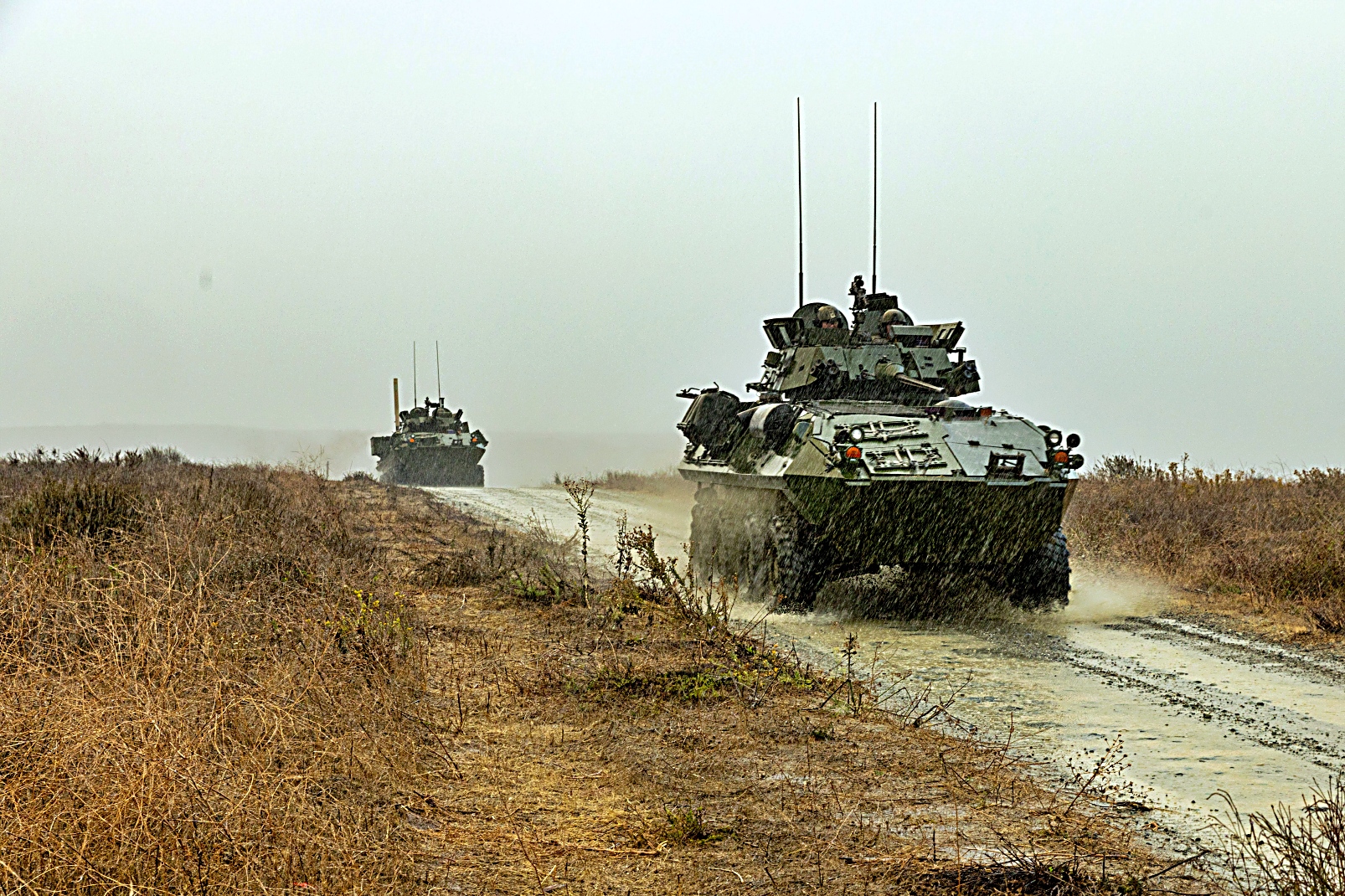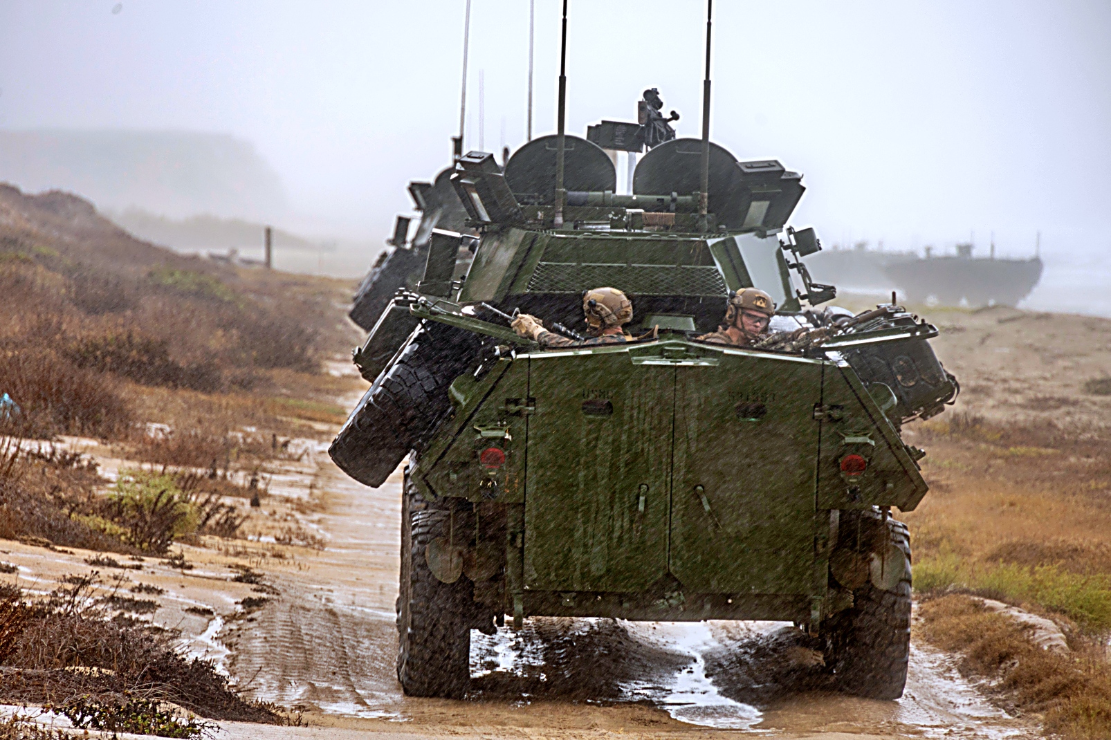 2025년 10월 9일부터 15일 사이, 캘리포니아주 Camp Pendleton 해병대 기지에서 열린 제250회 상륙능력 시연 리허설 중, 제1해병사단 제1경장갑정찰대대 소속 미 해병대원들이 LAV 계열의 다양한 경장갑차를 운용하고 있다.