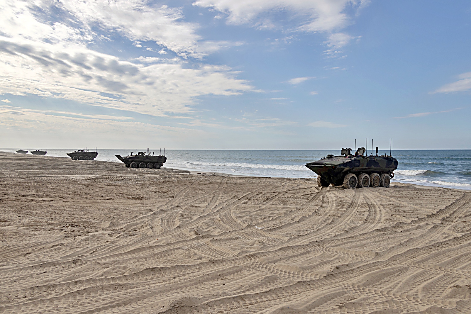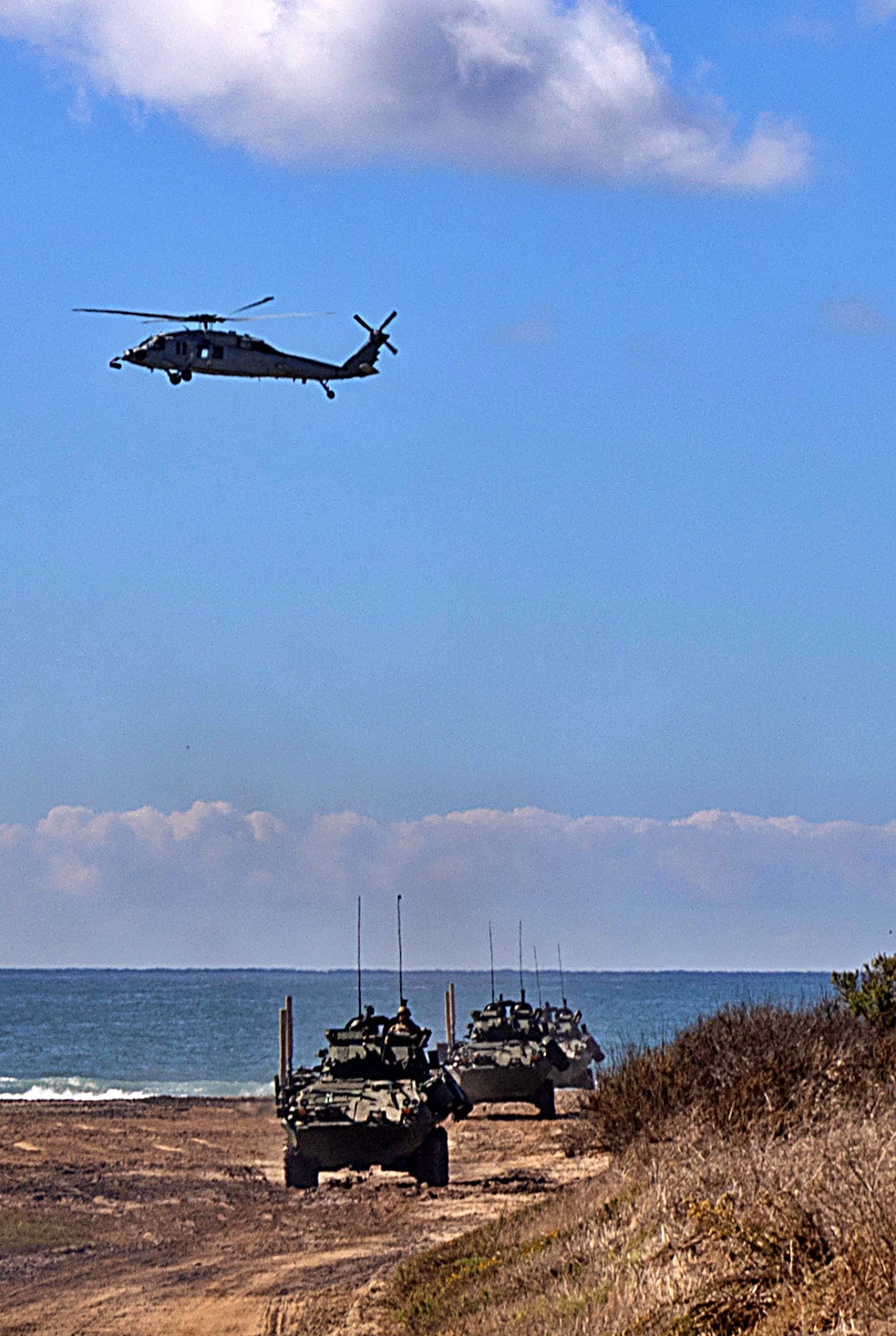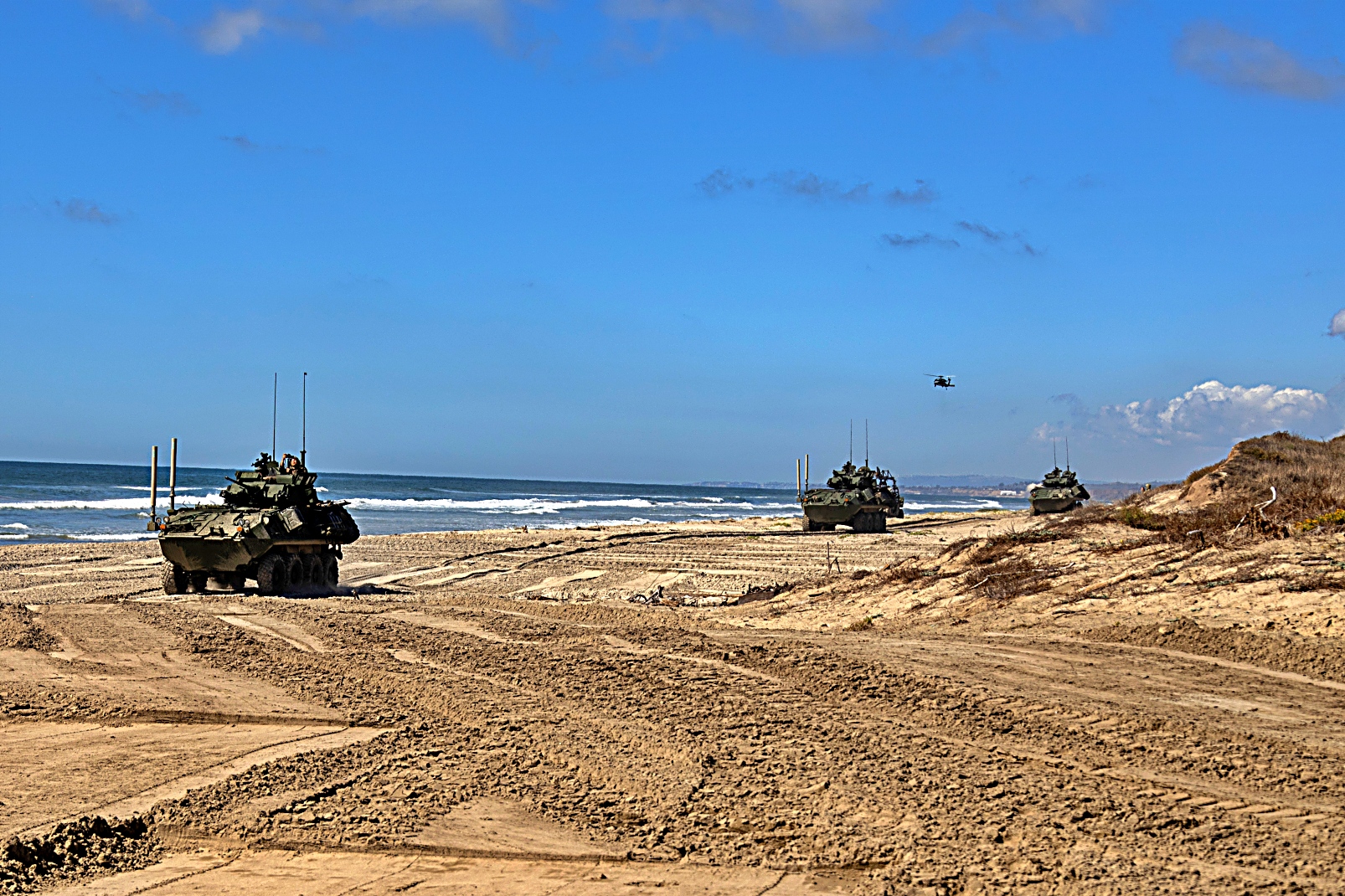 2025년 10월 9일부터 15일 사이, 캘리포니아주 Camp Pendleton 해병대 기지에서 열린 제250회 상륙능력 시연 리허설 중, 제1해병사단 제1경장갑정찰대대 소속 미 해병대원들이 LAV 계열의 다양한 경장갑차를 운용하고 있다.