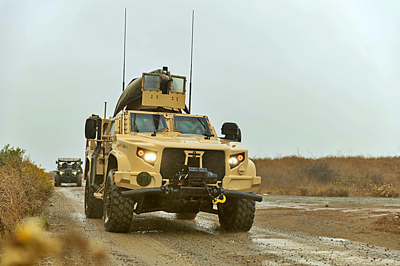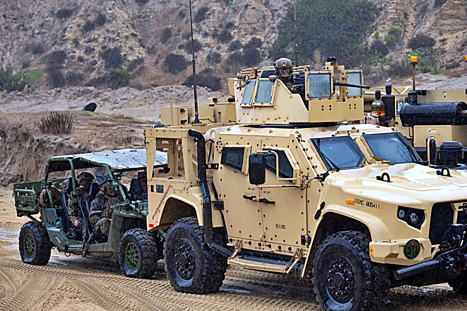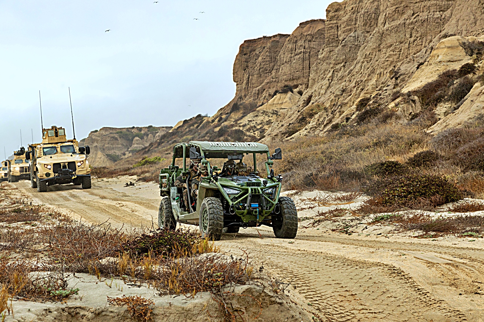 2025년 10월 9일부터 15일 사이, 캘리포니아주 Camp Pendleton 해병대 기지에서 열린 제250회 상륙능력 시연 리허설 중, 제1해병사단 제5해병연대 제3해병대대 소속 미 해병대원들이 합동 경전차량(JLTV : Joint Light Tactical Vehicle)를 운용하고 있다.