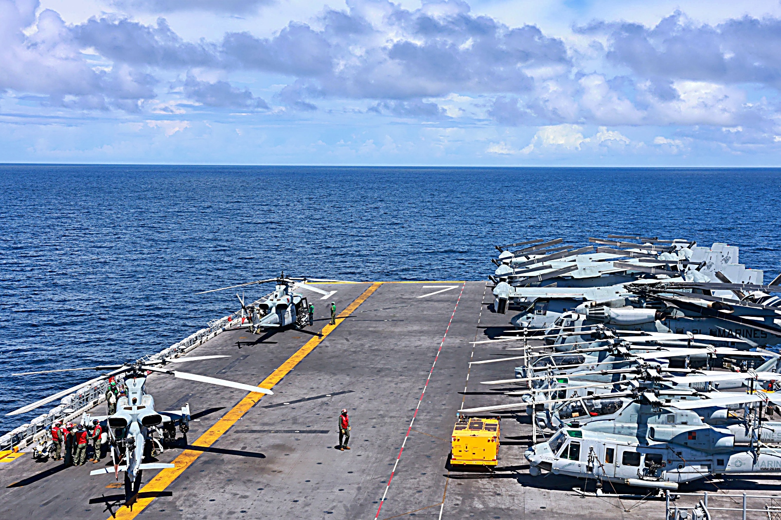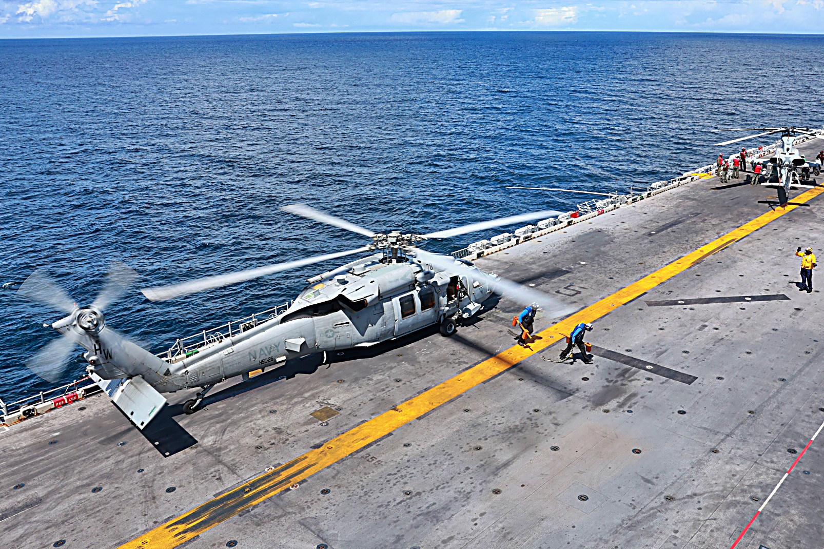 2025년 9월 13일 카리브해에 배치된 미 해군 Wasp급 강습상륙함 USS Iwo Jima (LHD 7)함의 비행 갑판에서 HSC-26 헬리콥터 해상 전투대대 소속 MH-60S Seahawk 헬기와 VMM-263 강화형 중형 틸트로터 비행대대 소속 AV-8B Harrier 공격기및 MV-22B Osprey 수송기가 비행작전을 수행하고 있다.