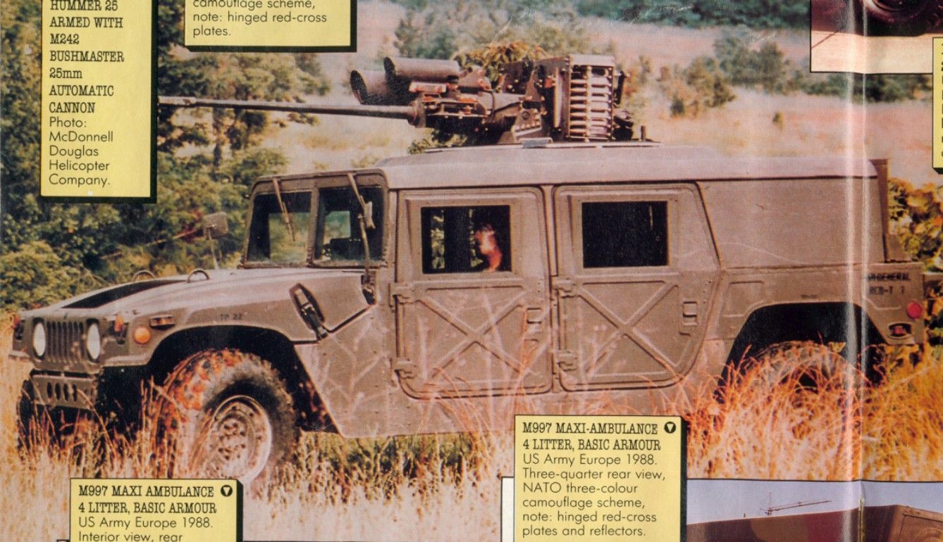 1986년 스페츠나츠 Spetnaz 감시 임무를 맡은 미주리주 방위군의 Bushmaster 25mm 체인건으로 무장한 Hummer