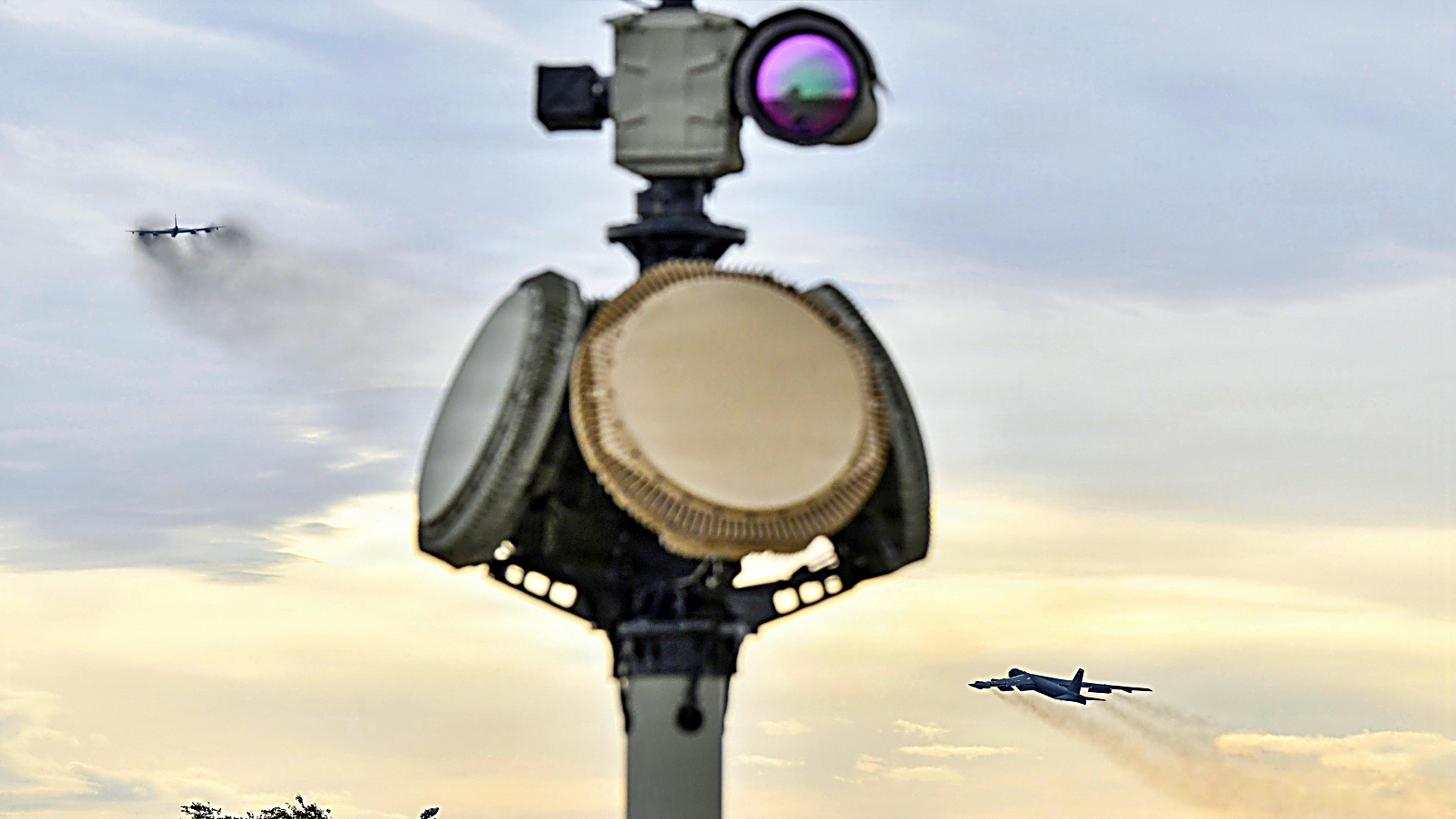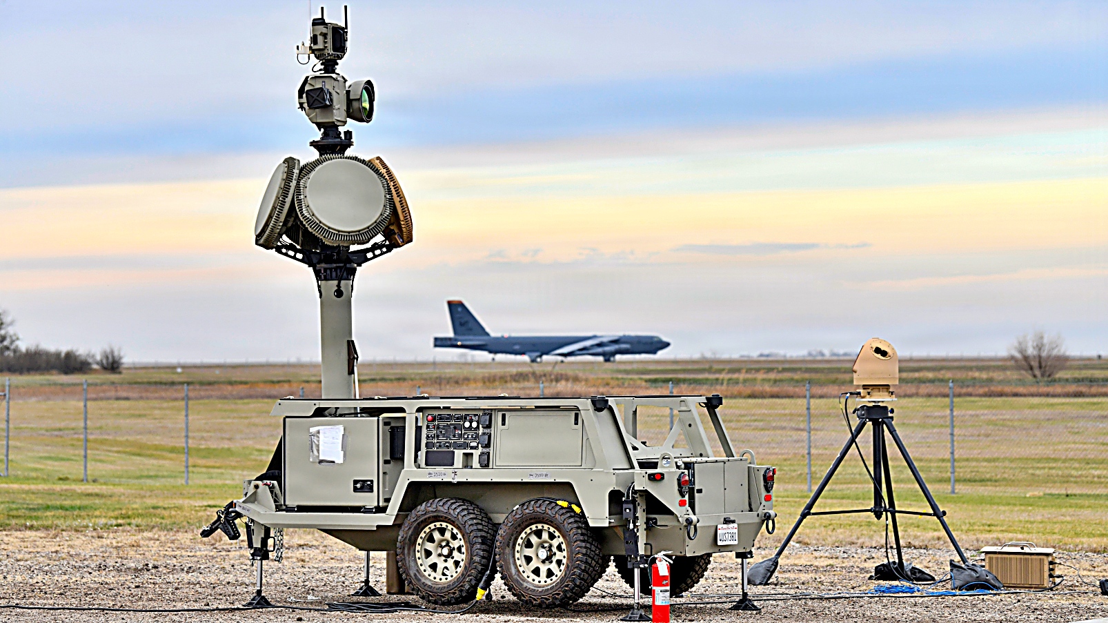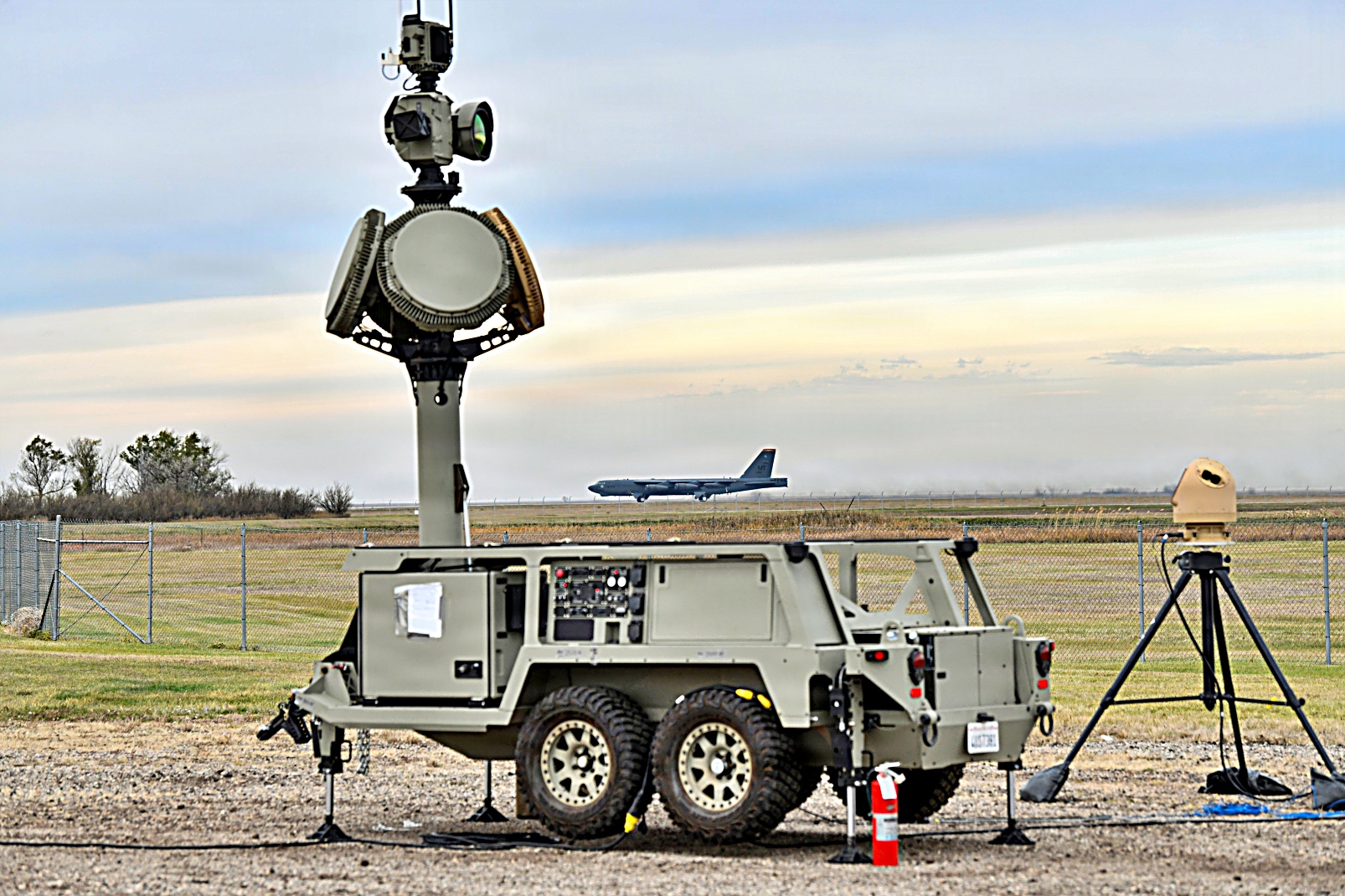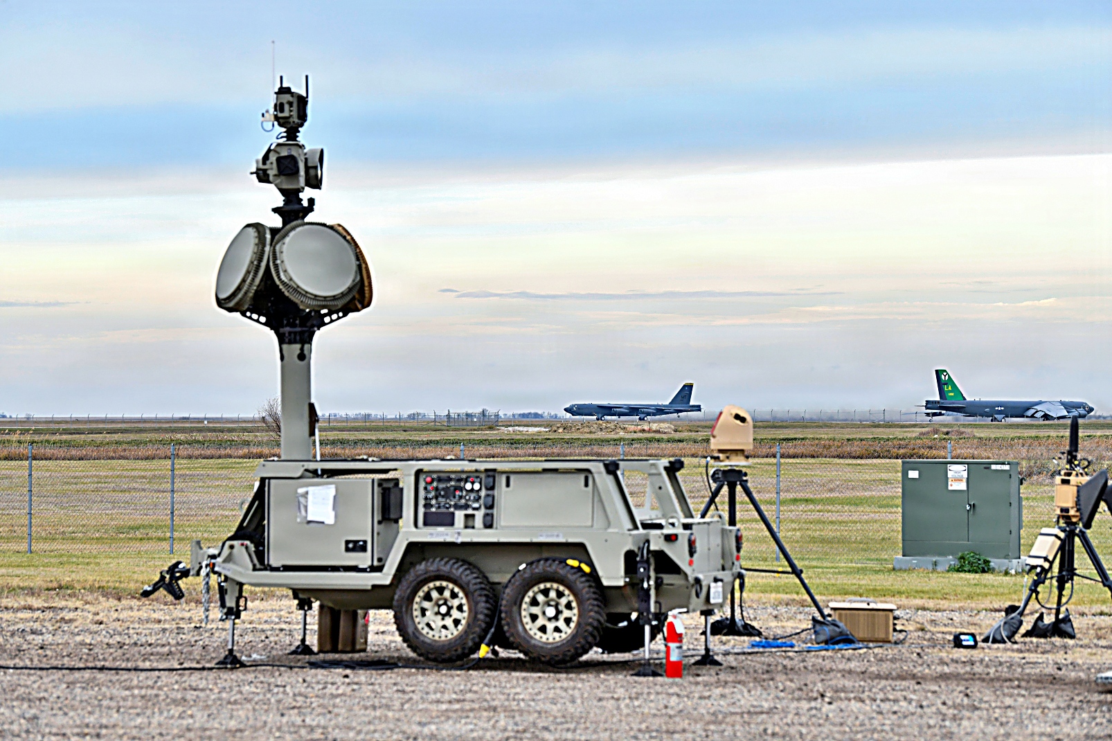 2025년 10월 26일, 노스다코타주 Minot 공군기지에서 제5폭격비행단 소속 B-52H Stratofortress 한 대가 이륙하고 다른 한 대가 활주로를 이동 중이다. 전경에 보이는 미 북부사령부 소형 무인항공체계 대응용 이동식 장비와 운영 요원들은 드론 침입을 경험하는 기지 사령관을 신속히 지원할 수 있는 사령부의 능력을 입증하기 위한 훈련의 일환으로 North Dakota 기지에 긴급 배치됐다.