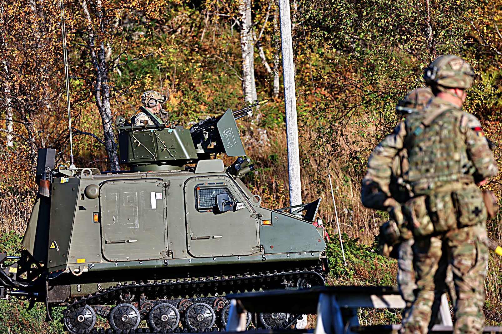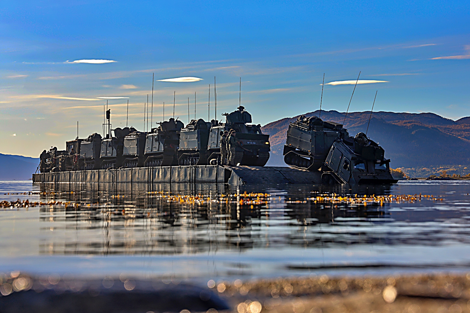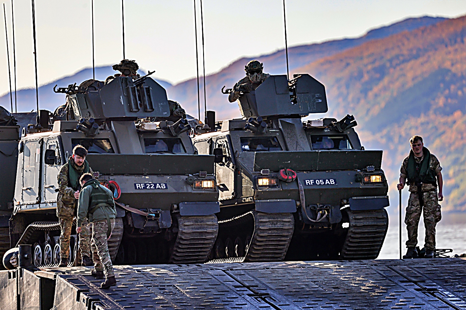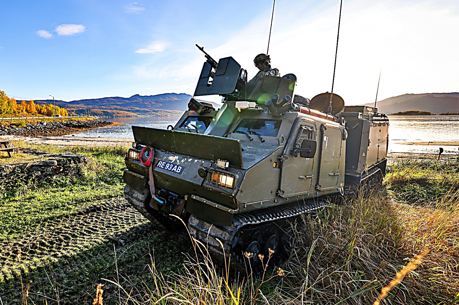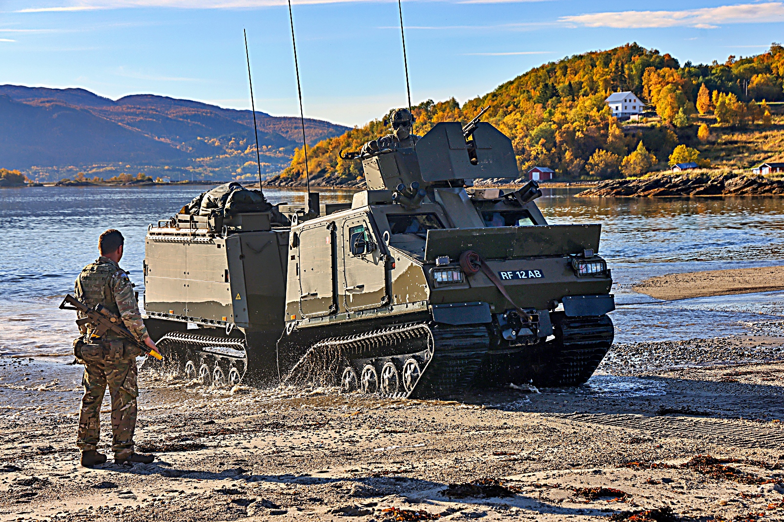 2025년 9월 26일 노르웨이에서 바이킹 BVS10 장갑차를 운용하는 CLR 기갑지원단(ASG) 소속 영국 해병대가 Exercise Tarasiss 훈련중 RFA Lyme Bay 상륙함으로부터 발진하여 해변 상륙 훈련을 실시하고 있다. Exe