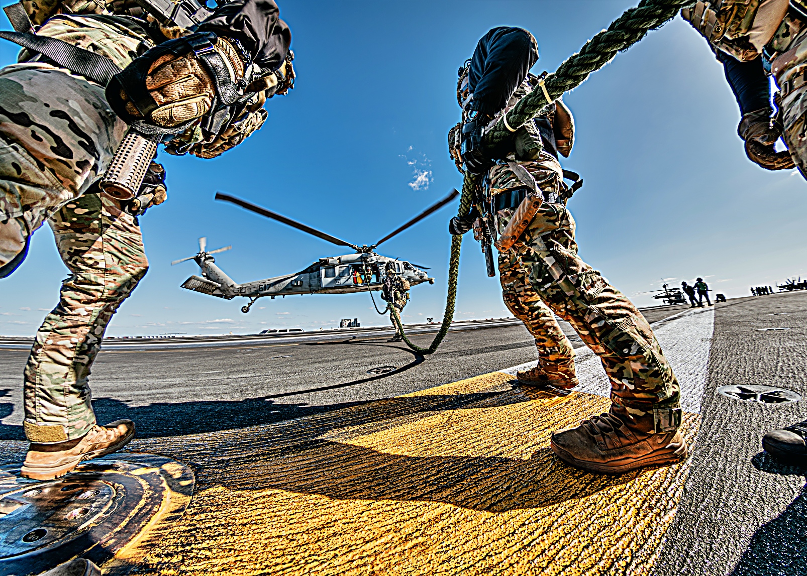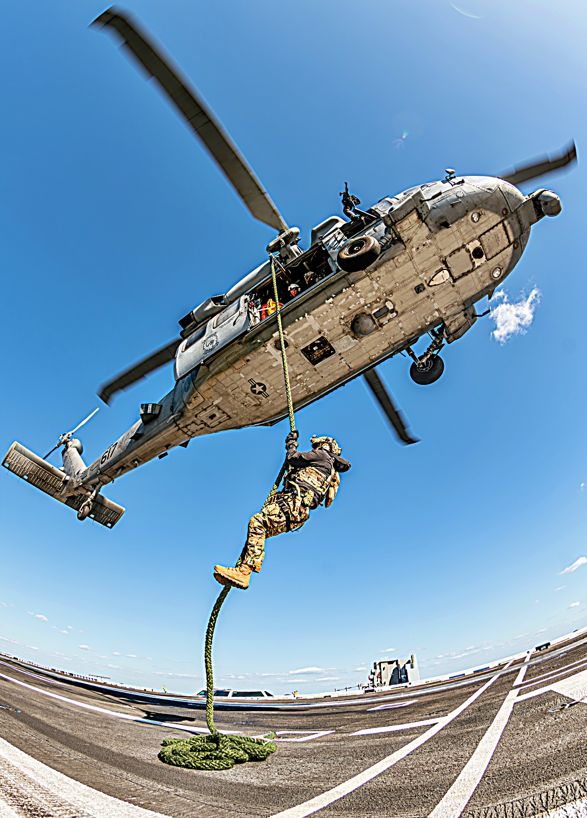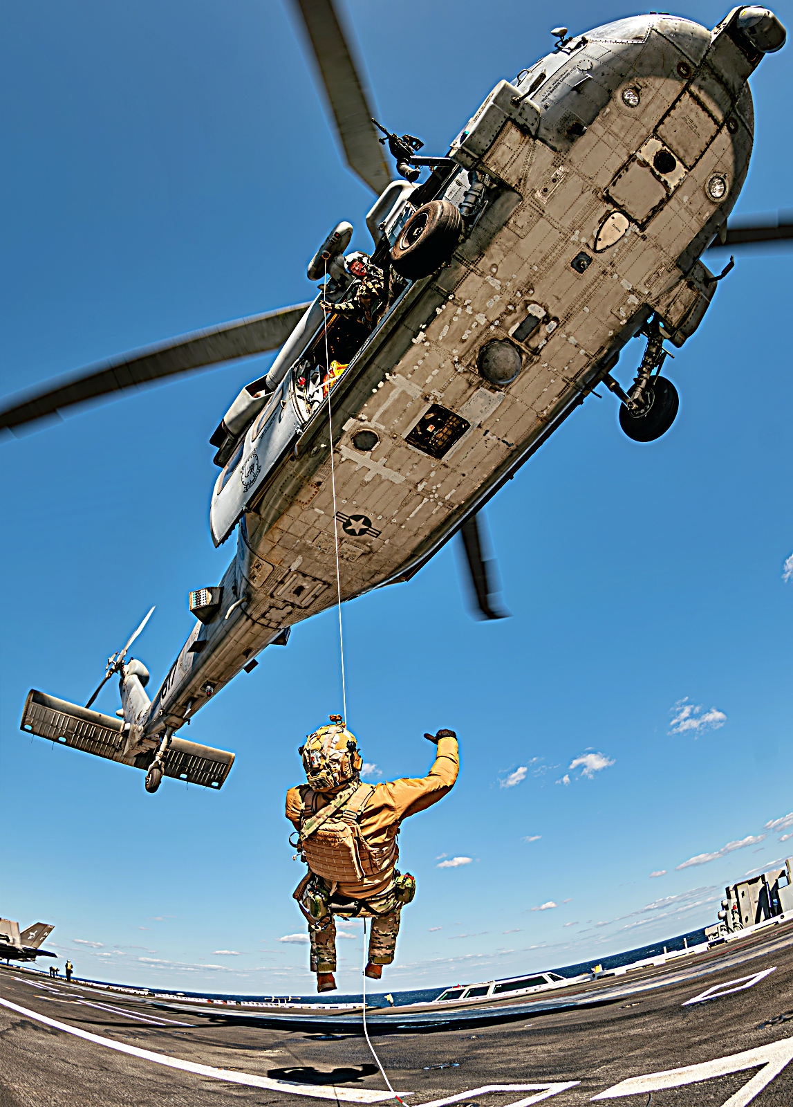 2025년 11월 10일 미 해군 제70임무부대 (Task Force 70) 사령부 소속 폭발물 처리 기동대(EODMU) 5에 배속된 해군 병사들과 주한미해군 사령부에 배속된 한국 해군 특수전단 소속 병사들이 2025년 항공모함 타격군 훈련(CSGEX) 중 항해 중인 Nimitz급 항공모함 USS George Washington (CVN 73)의 비행 갑판에서 고속 로프 하강 훈련에 참여하고 있다. 2025년 11월 10일.