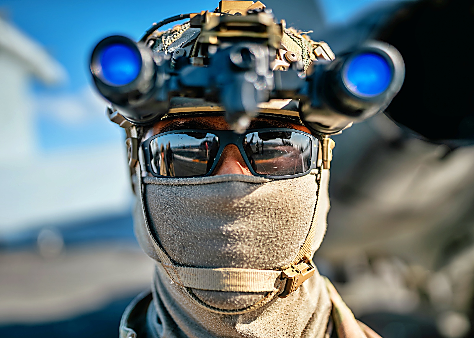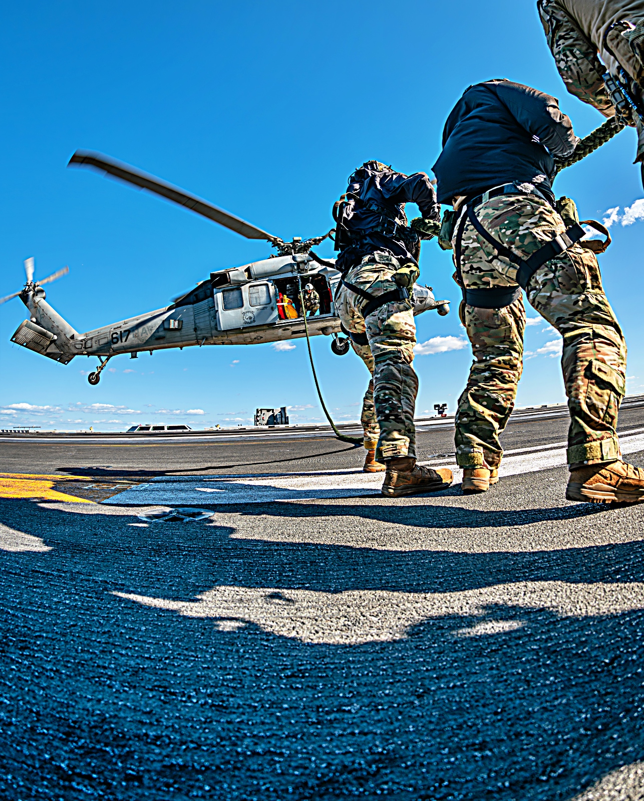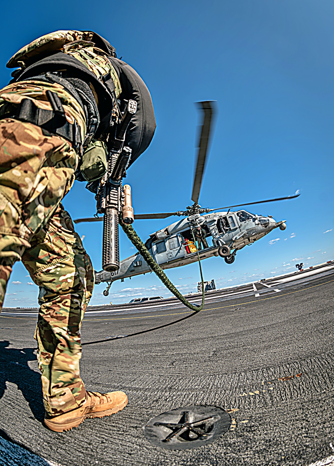 2025년 11월 10일 미 해군 제70임무부대 (Task Force 70) 사령부 소속 폭발물 처리 기동대(EODMU) 5에 배속된 해군 병사들과 주한미해군 사령부에 배속된 한국 해군 특수전단 소속 병사들이 2025년 항공모함 타격군 훈련(CSGEX) 중 항해 중인 Nimitz급 항공모함 USS George Washington (CVN 73)의 비행 갑판에서 고속 로프 하강 훈련에 참여하고 있다. 2025년 11월 10일.