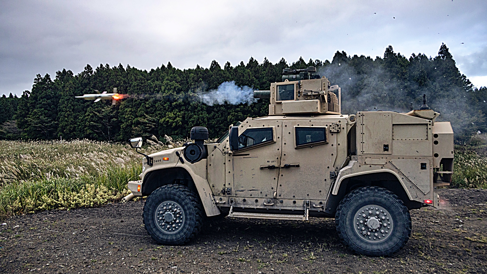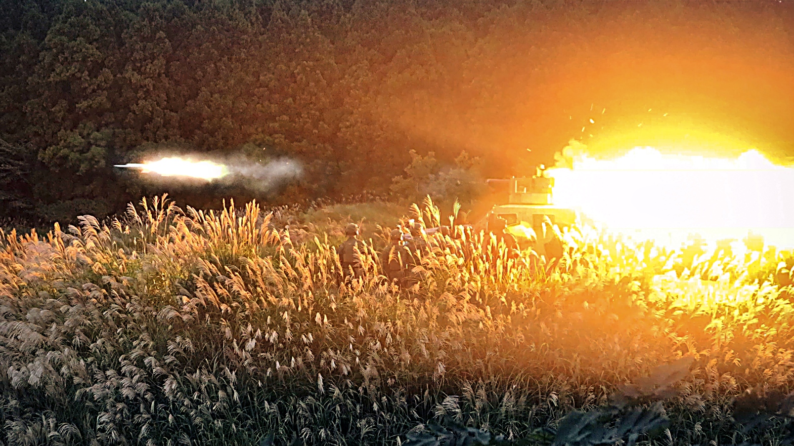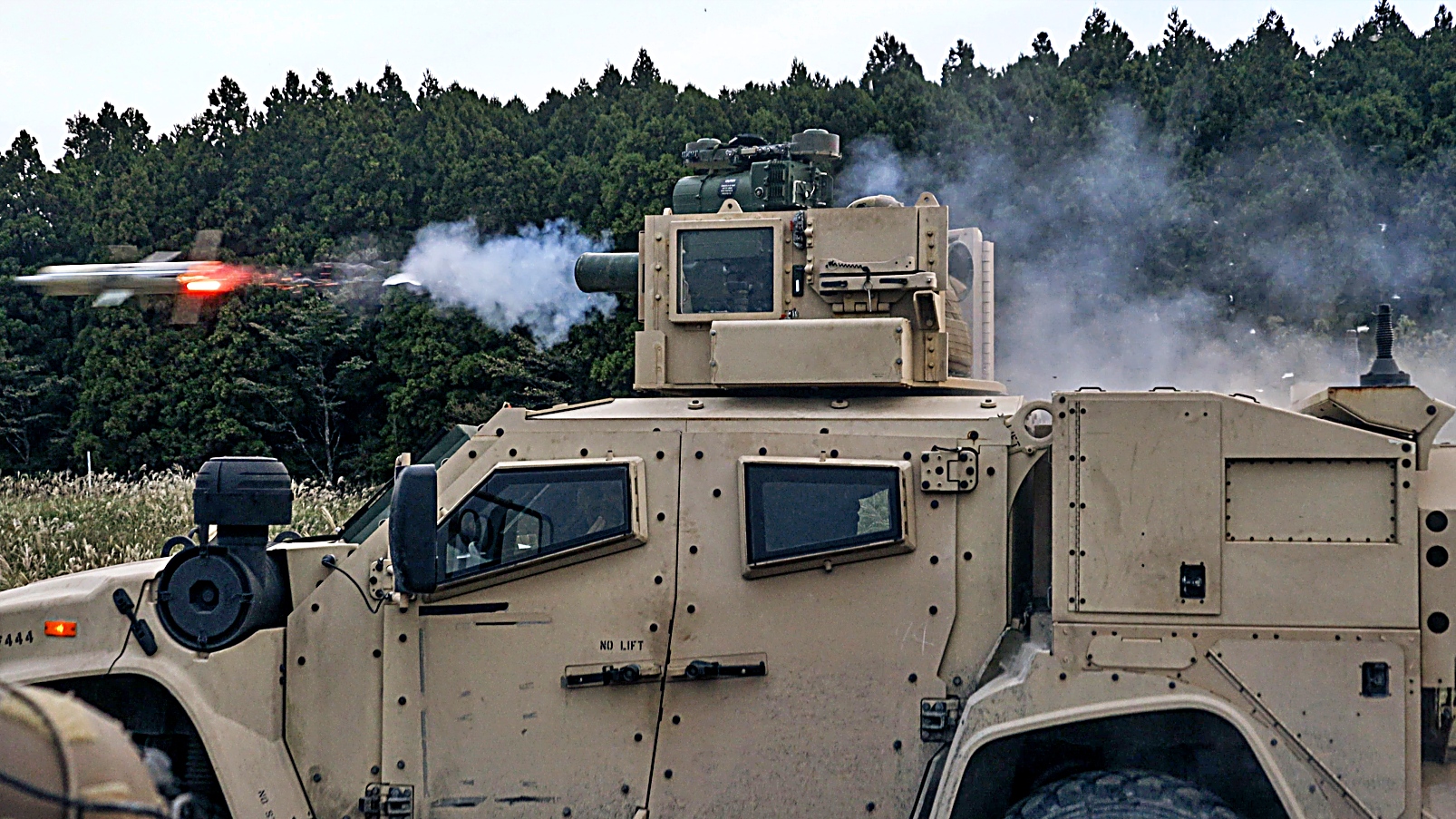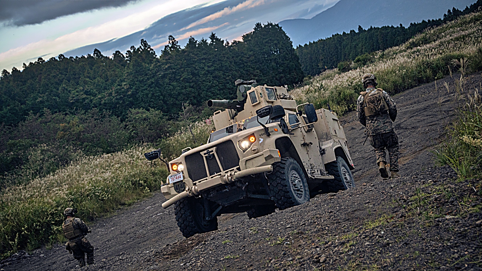 2025년 10월 9일 일본 Camp Fuji의 Combined Arms Training Center에서 진행된 실사격 훈련중 미 해병대 제31해병원정군 소속 제7해병연대 제1대대 상륙전투대대 병사들이 TOW 발사기를 장착한 M1281 JLTV-CCWC에서 TOW 대전차 미사일을 발사하고 있다.