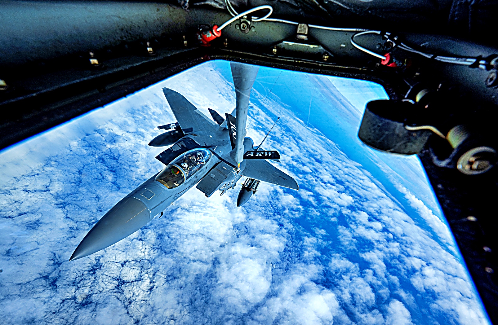 2025년 10월 15일 대서양 상공에서 진행된 ‘Ocean Sky’ 훈련 중, 미 공군 제48전투비행단 소속 F-15E Strike Eagle 전투기들이 제100공중급유비행단 KC-135 Stratotanker 급유기와 함께 비행하고 있다. Ocean Sky’ 훈련은 참가국 모두가 유사한 수준의 적을 상대로 복잡한 시나리오에서 전술, 기법 및 절차를 연습하고 발전시킬 수 있는 소중한 기회를 제공한다.