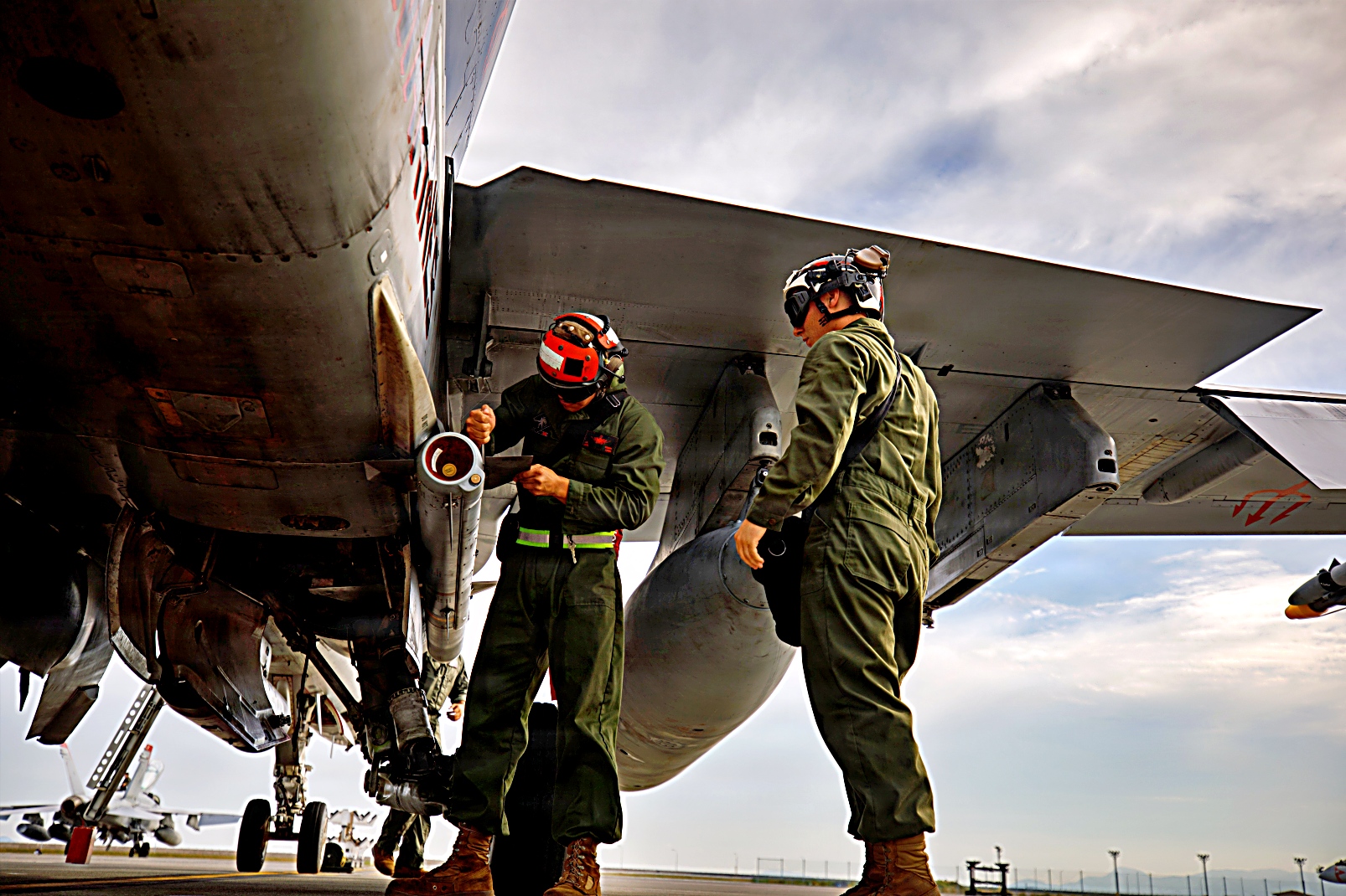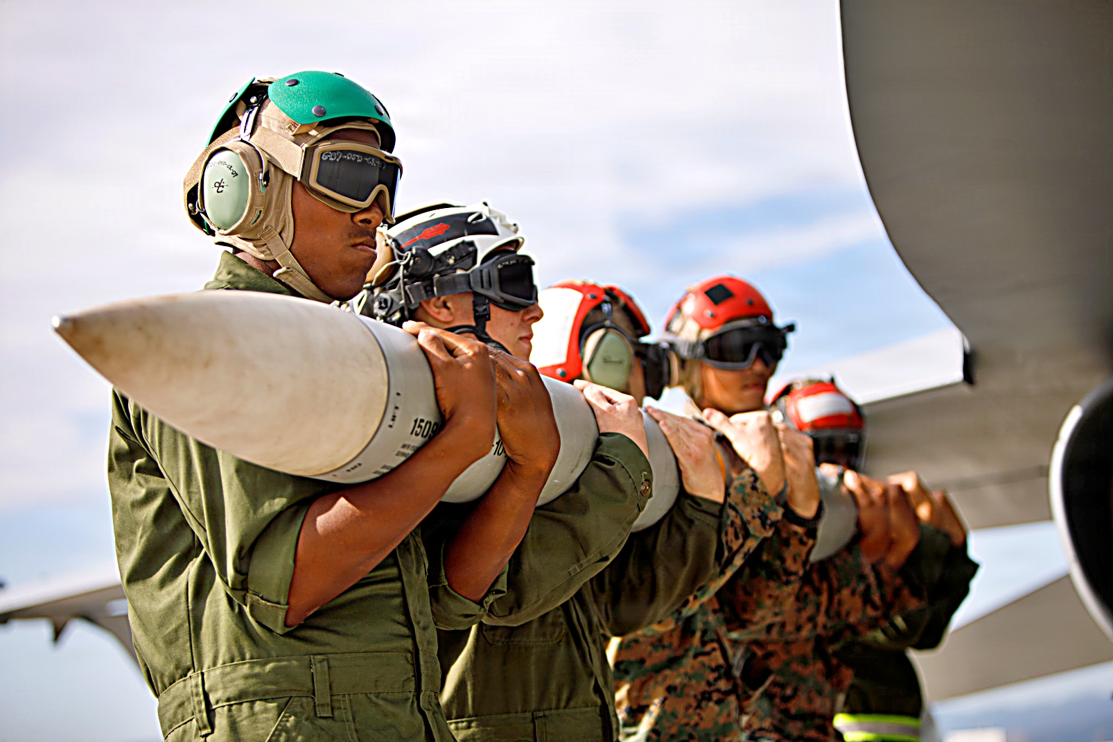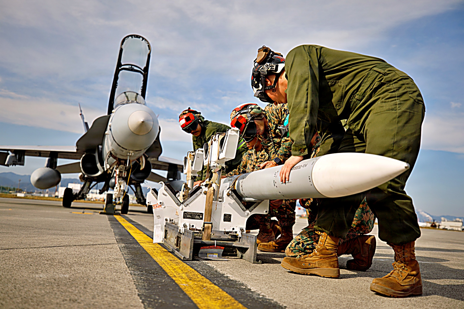 미 해병대 VMFA-232 해병전투공격대대 소속 미 해병대원들과 제1해병항공단 제12해병항공군 제12해병항공병참군대대(Marine Aviation Logistics Group Squadron (MALS) 소속인 해병대원들이 2025년 11월 5일 일본 이와쿠니 해병대 항공기지에서 진행된 무장 분리 작업 중 F/A-18D Hornet 전투기에서 실탄을 안전하게 하역하여 운반하고 있다. MALS-12와 VMFA-232는 자유롭고 개방된 인도-태평양 유지 지원을 위한 신속 대응 및 공중 우위 확보를 위해 공대공 미사일 하역을 위한 무장 회전 작전을 수행했다.