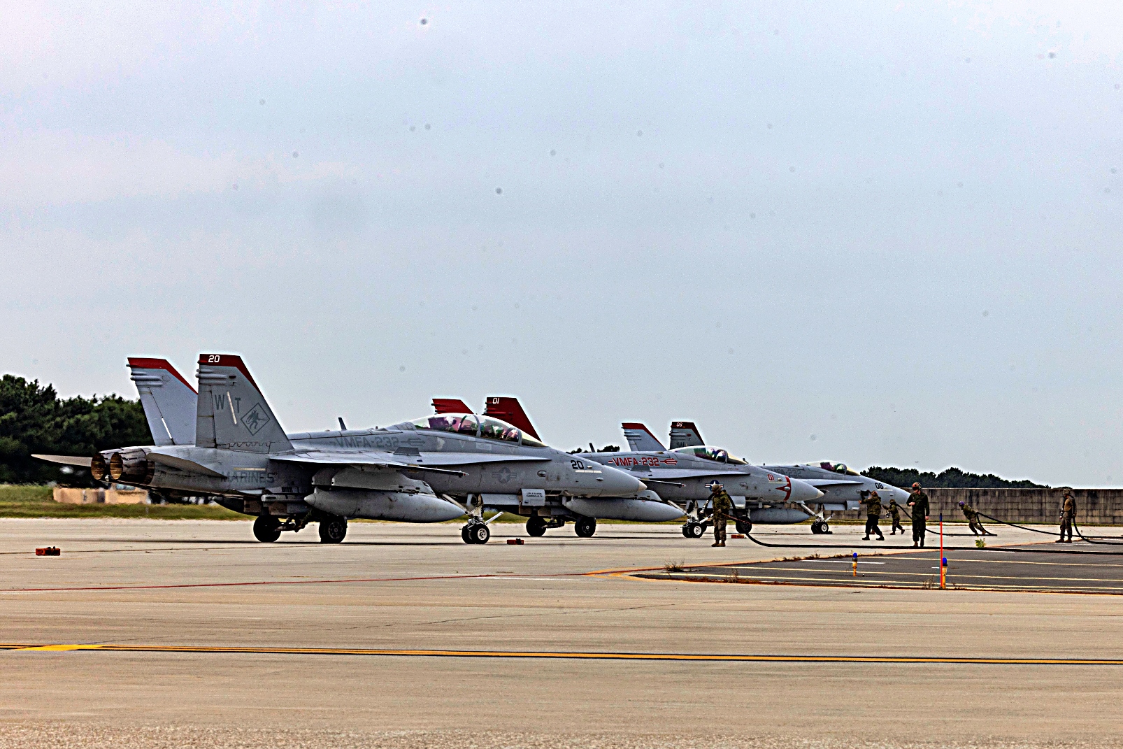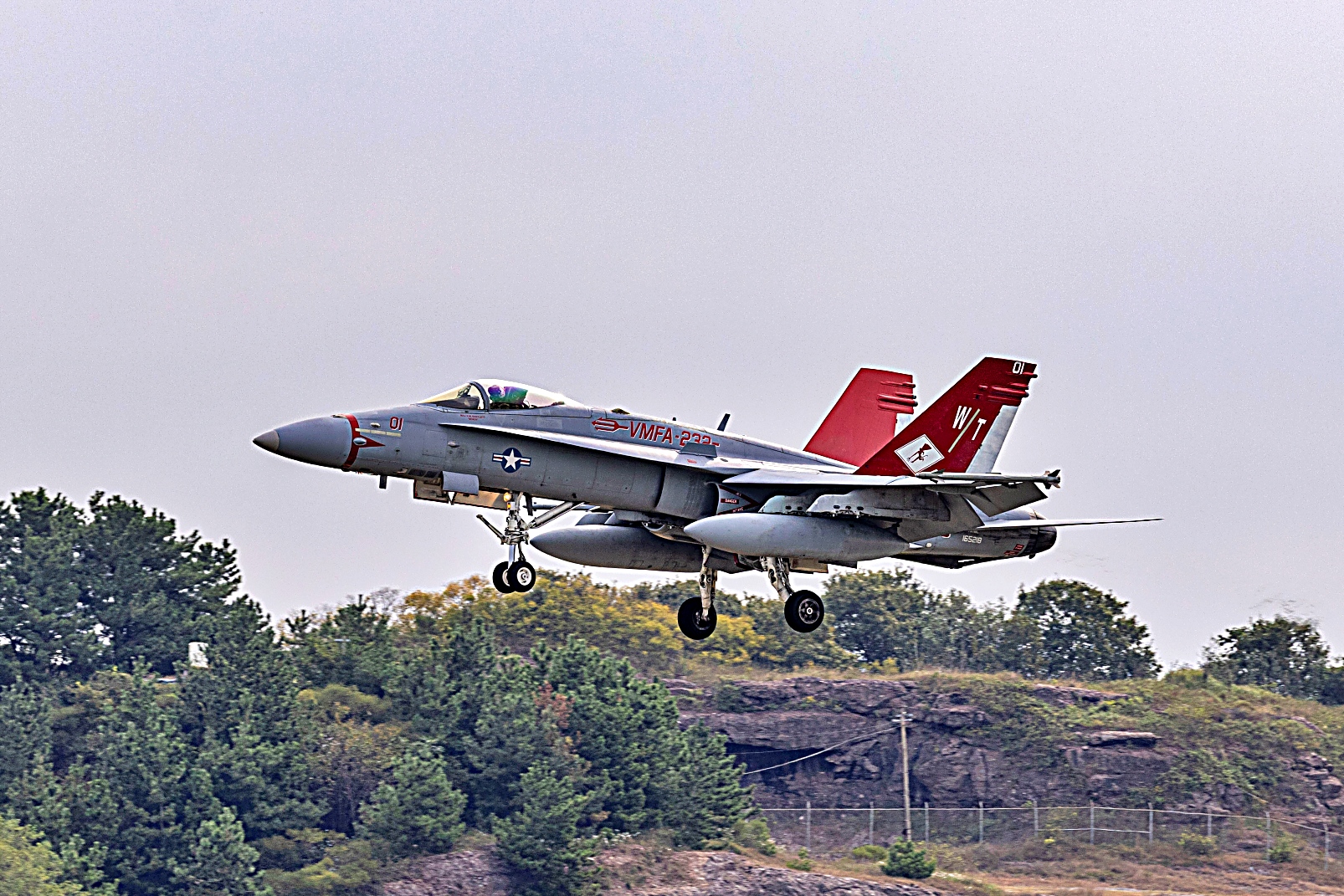 2025년 10월 16일부터 21일 사이 주한미공군 군산기지에서 미 해병대 VMFA-232 해병전투공격비행대 소속 F/A-18C/D Hornet 전투기가 부대 단위 훈련 중 이착륙하며 임무를 수행하고 있다.