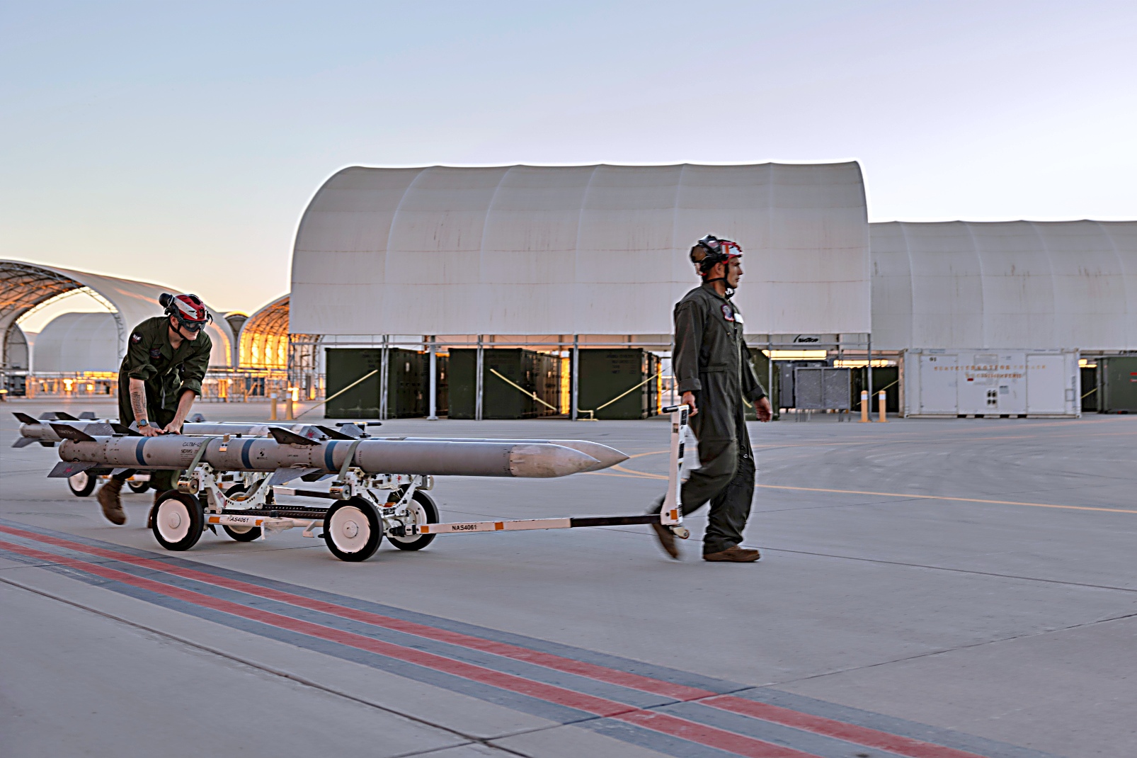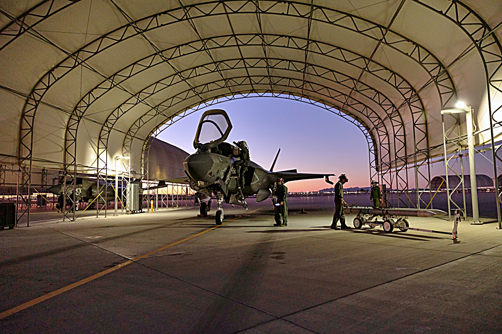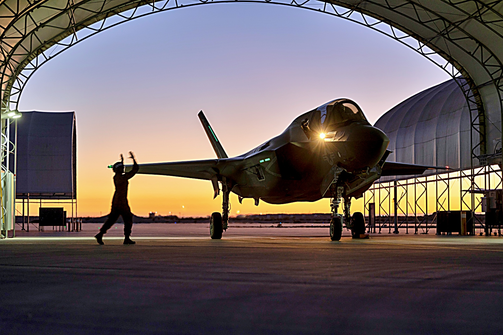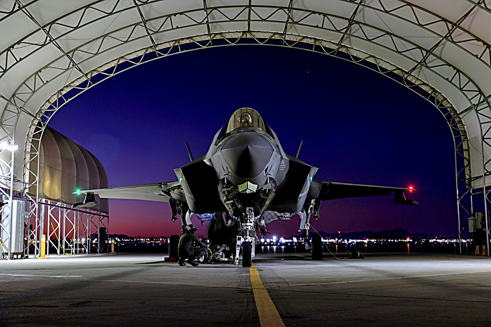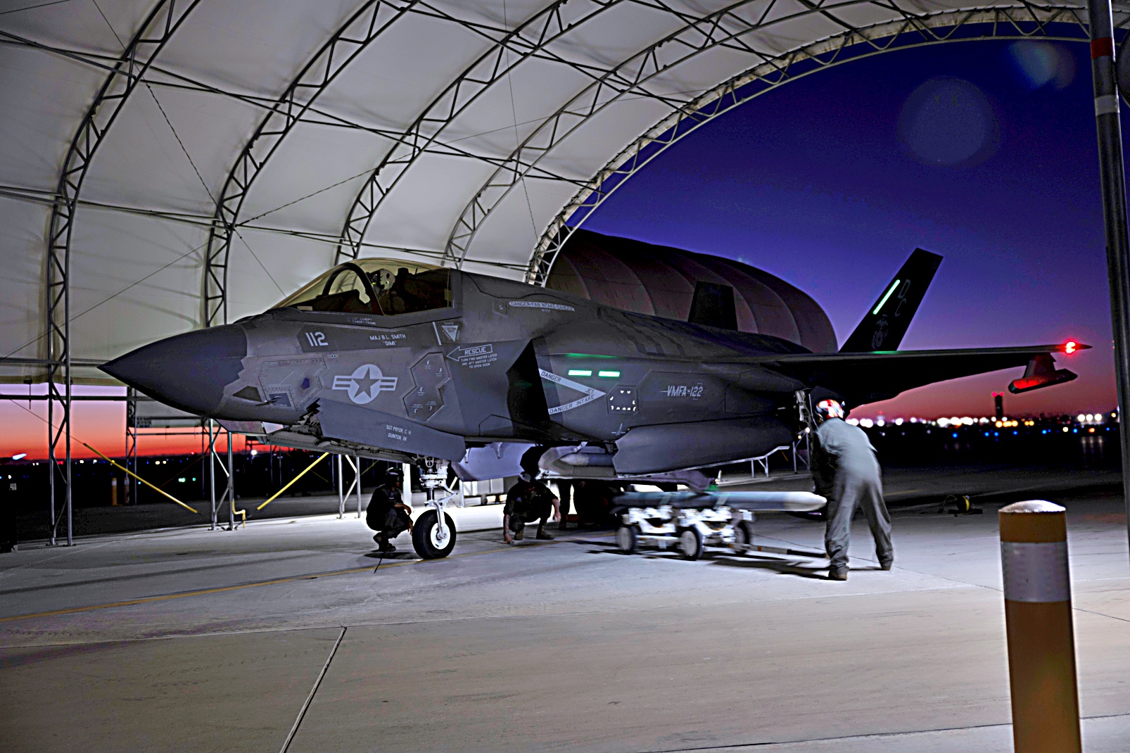 2025년 11월 6일, 애리조나주 Yuma 해병대 항공기지에서 진행된 도시 실전 훈련(RUT : Realistic Urban Training) 중, 제3해병항공단 제13해병항공군 VMFA-122 해병전투공격비행대 소속 F-35B Lightning II 공격기가 훈련을 지원할 비활성 훈련용 탄약을 적재하고 있다. RUT(현실적 도시 훈련)은 제11해병 원정군이 미 해군과 함께 상륙 작전을 수행하기 위해 해병 항공 지상 태스크 포스(MAGTF : Marine Air-Ground Task Force)로 통합된 원정 작전을 수행할 수 있도록 하는 지상 기반 훈련이다.