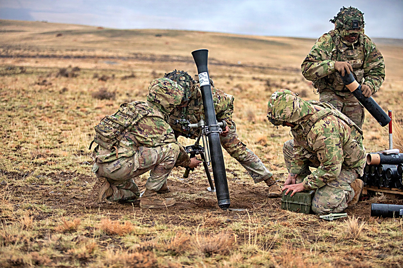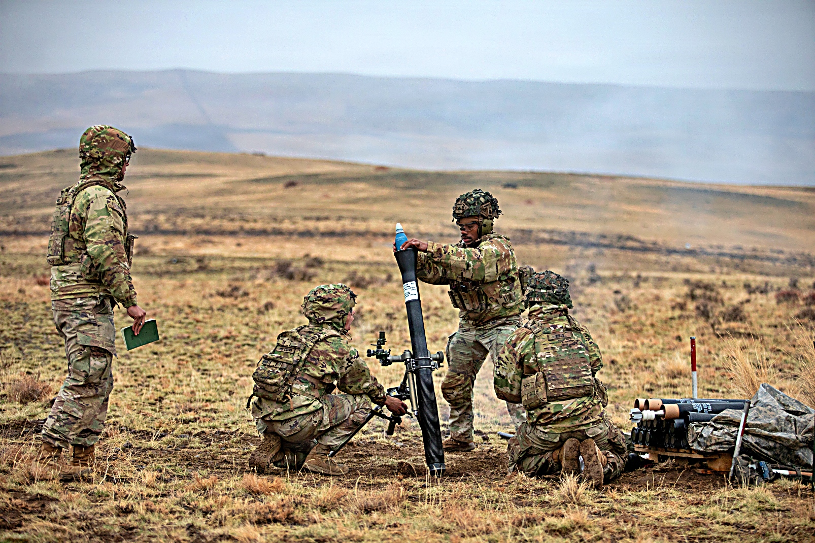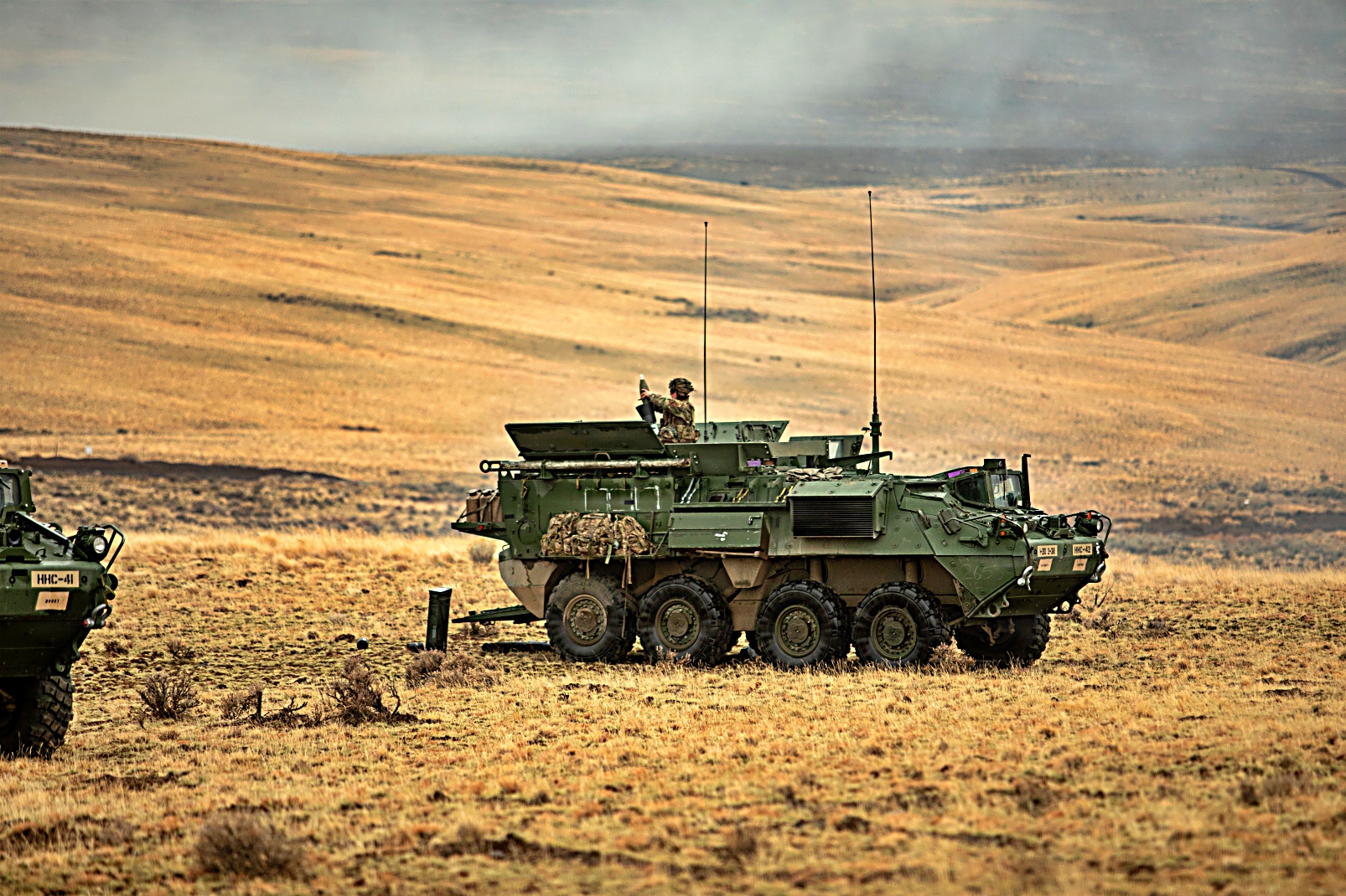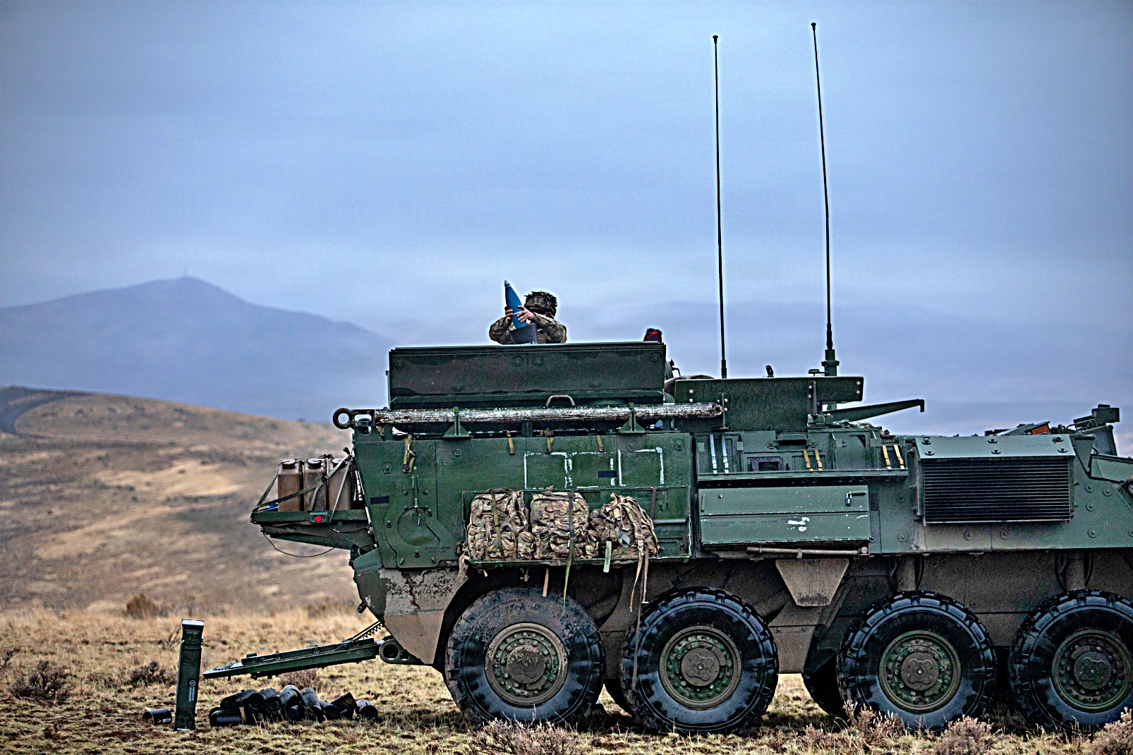 2025년 11월 3일 일요일, 워싱턴주 야키마 훈련센터에서 진행된 실사격 훈련 중, 미 육군 제3보병연대 제2대대 본부중대 소속 병사가 M1129 Stryker Mortar Carrier 자주박격포에서 120mm 박격포탄을 장착하여 사격하고 있다. 이 훈련은 ' Operation Rising Thunder'의 일환으로 간접 사격 능력을 강화하기 위한 것이다.