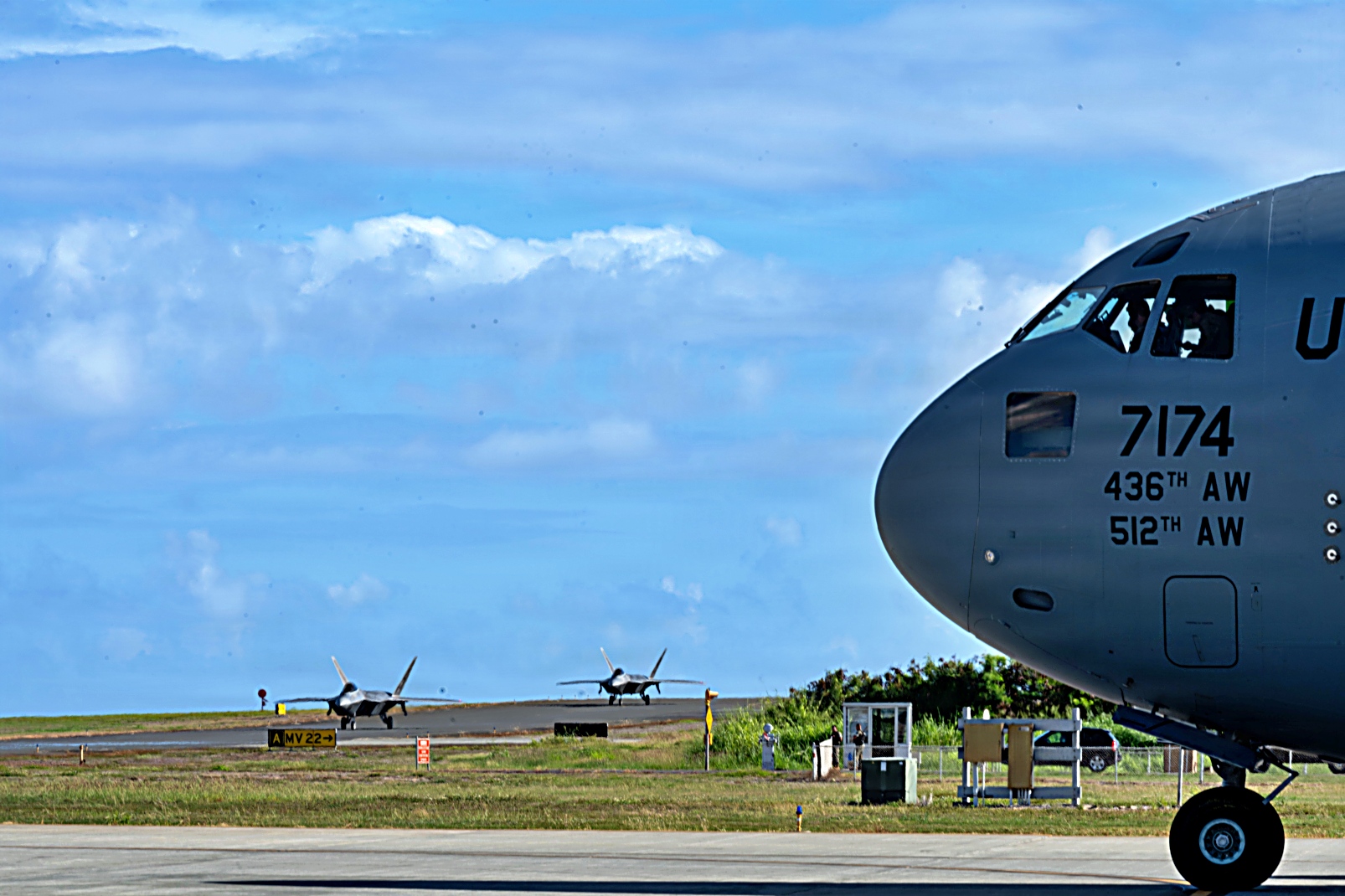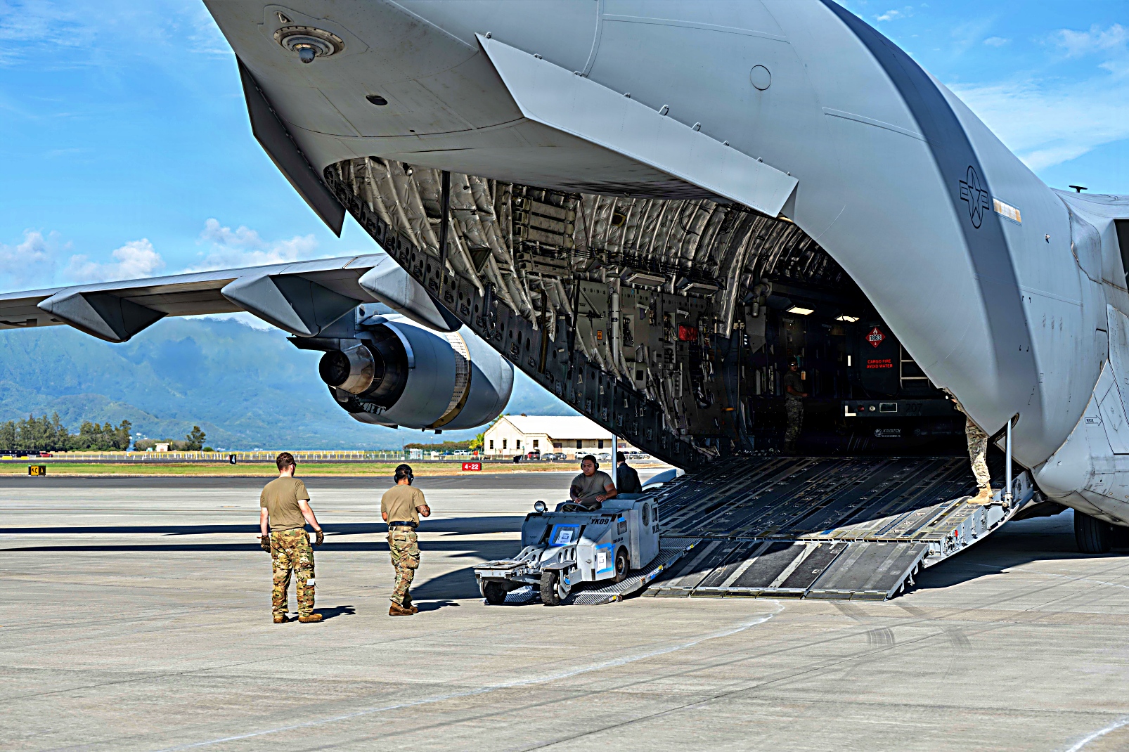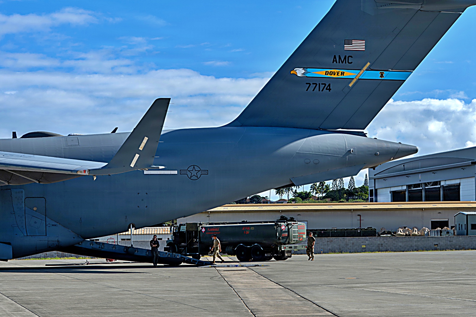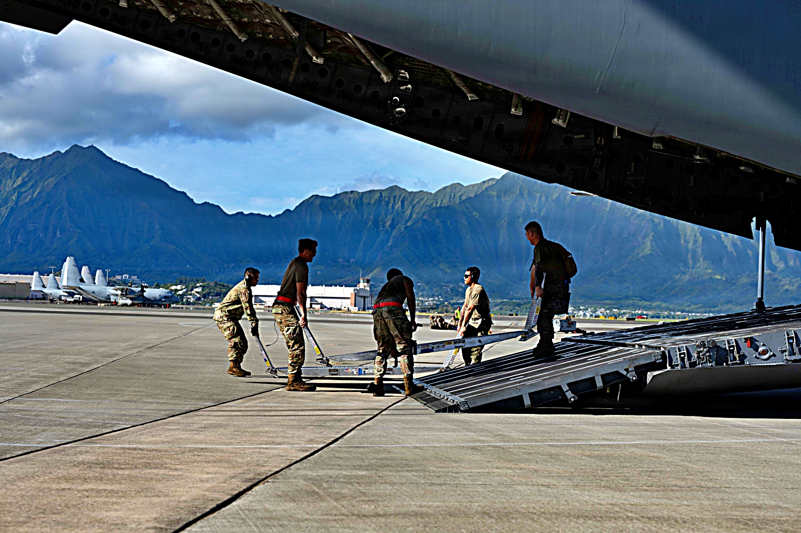 2025년 11월 6일, 하와이 주 해병대 기지에서 진행된 합동 태평양 다국적 준비 센터 ( Joint Pacific Multinational Readiness Center) 26-1 훈련을 지원하기 위한 통합 전투 전환(Integrated Combat Turn)에 참가한 제154정비대대 탄약 담당 병사들이 F-22 전투기의 재무장을 위해 카트에서 비활성 훈련용 미사일을 하역하고 C-17 Globemaster III 수송기에서 물자를 하역했다.
