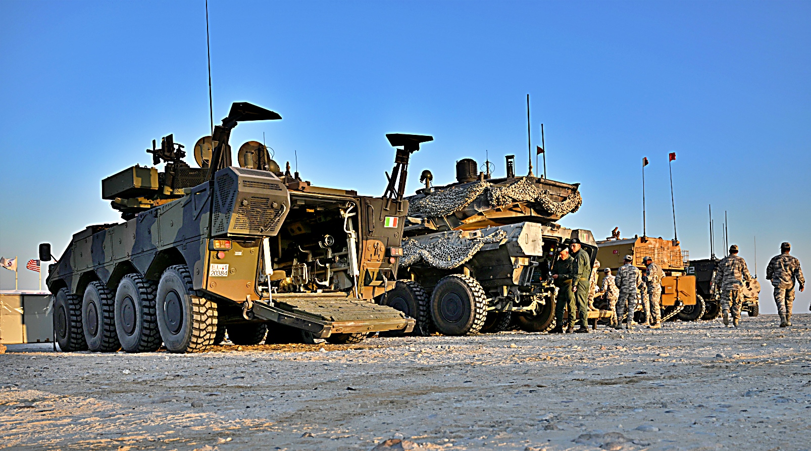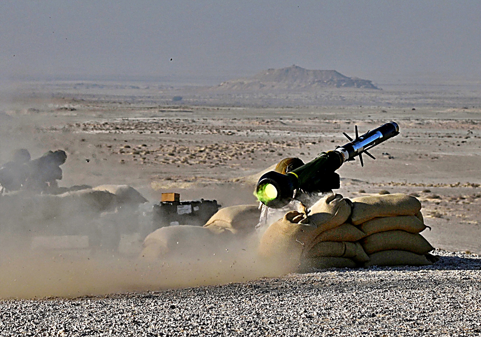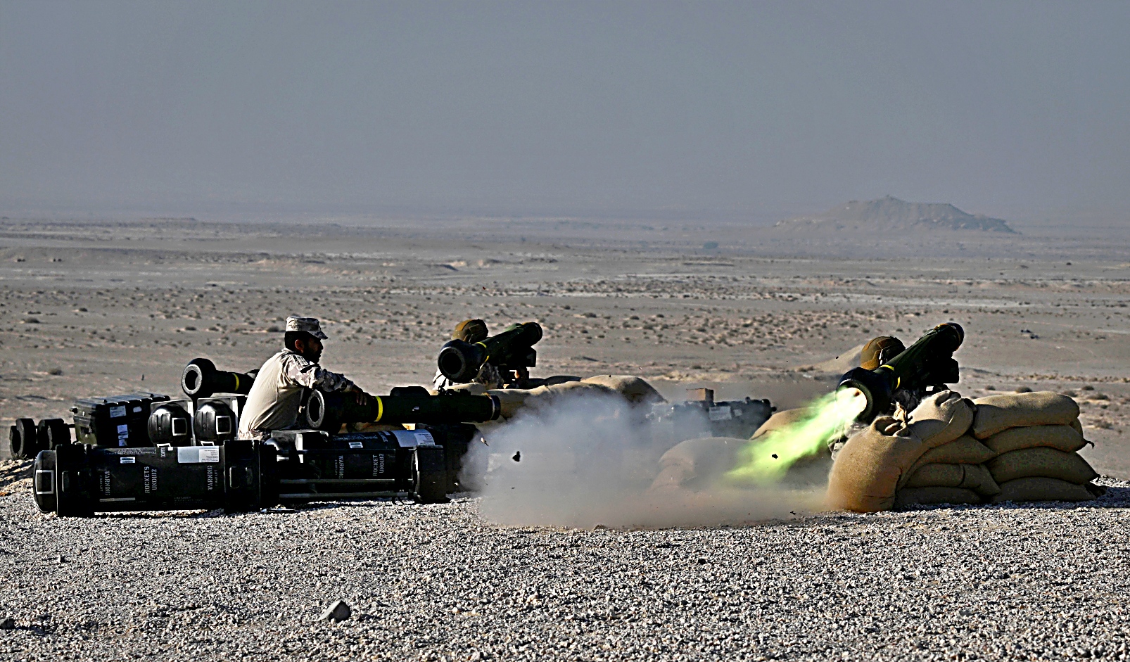 2025년 11월 20일, 미 중앙사령부 관할 구역인 카타르 Al Udeid 공군기지와 Umm Al-Houl 해군기지 내에서 진행된 ‘포악한 매 6(Ferocious Falcon 6)’ 훈련 중 카타르, 이탈리아, 영국, 터키, 프랑스의 군사 장비들이 줄지어 화력 시범을 펼치고 카타르 병사가 Javelin 대전차 미사일을 발사하고 있다.