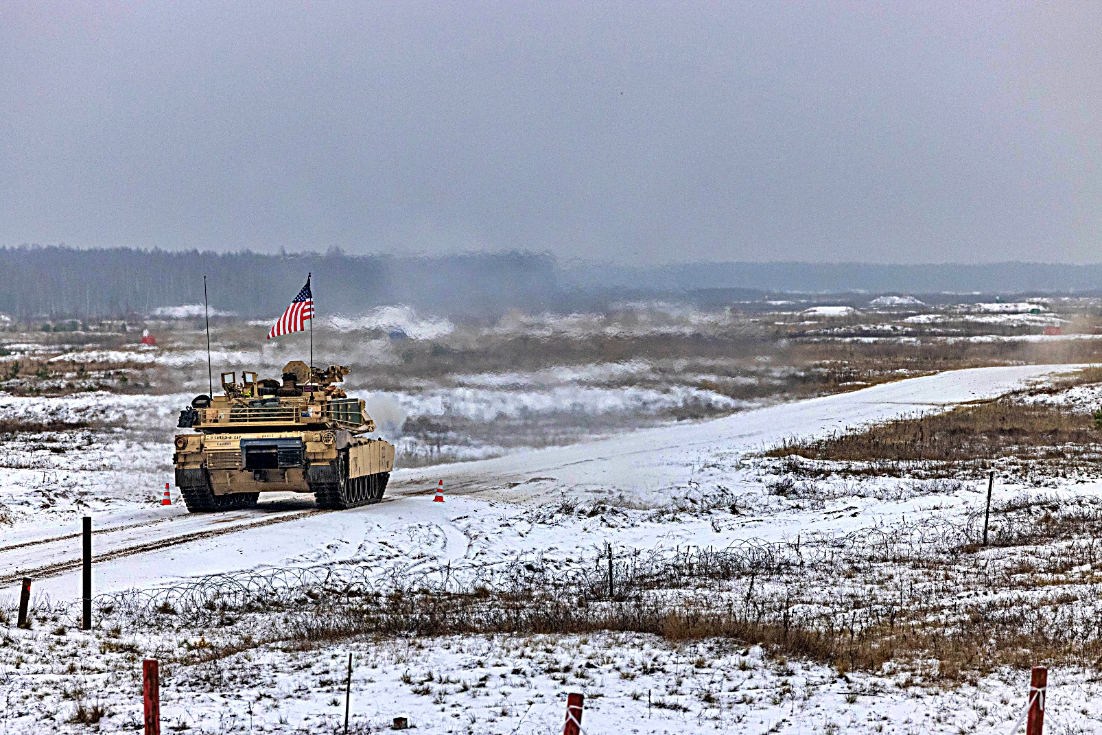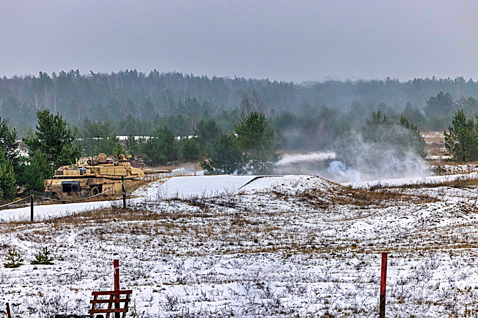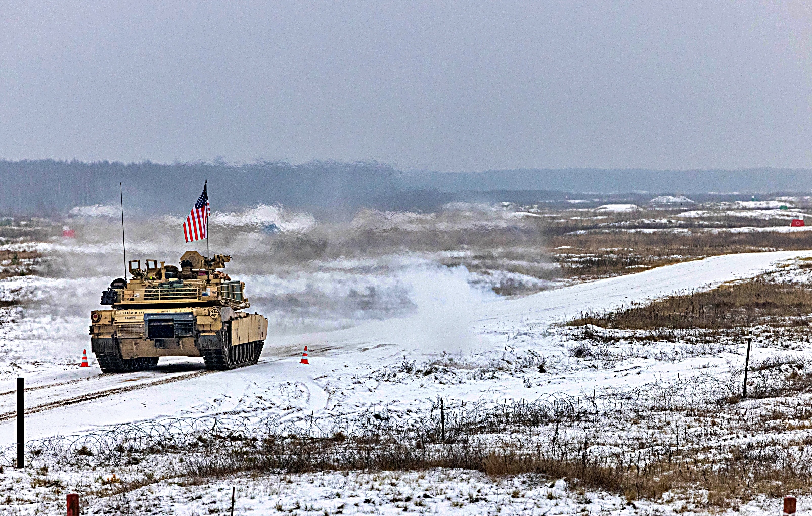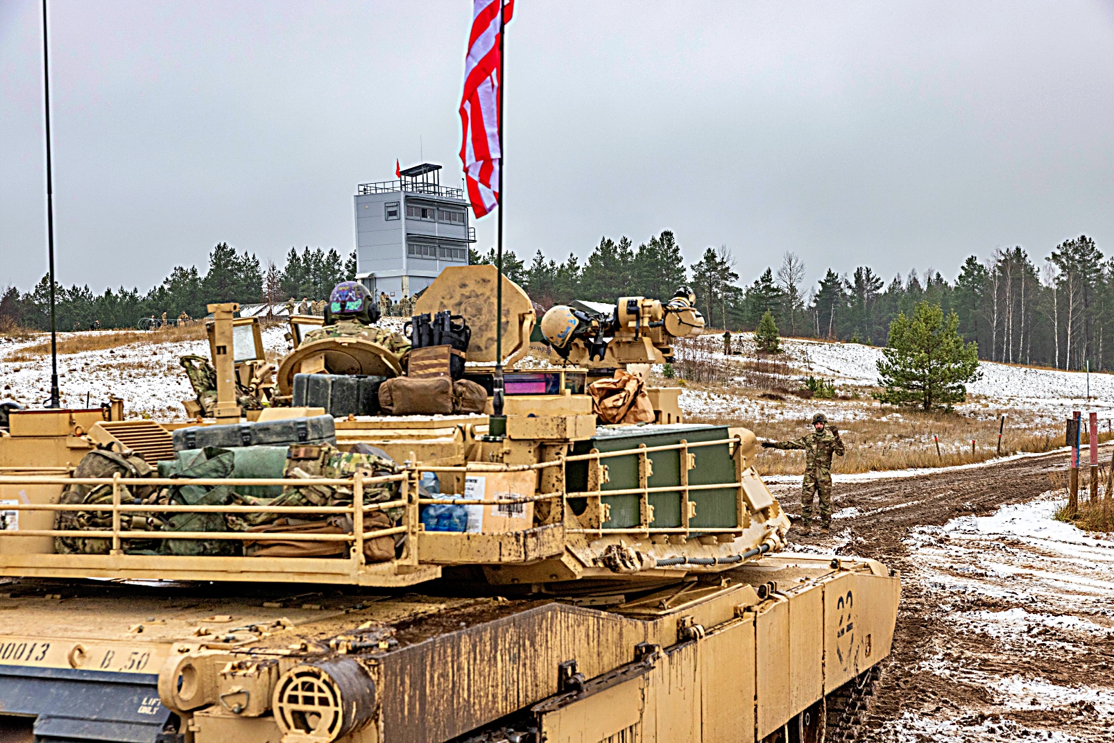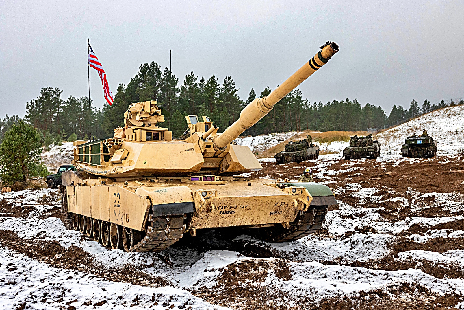 2025년 11월 19일, 라트비아 Adazi에서 열린 Iron Spear 전차 경연대회 사격 부문 시작 전, 미 육군 제8기병연대 제3대대 Battle 중대 소속 병사들이 M1A2 SEP Version 3 Abrams 전차를 배치하고 있다. 전투중대 소속 두 전차 승무원들이 다국적 전차 경기에 미군 대표로 참가했다. 이 대회는 NATO 동맹국 간 융합 강화, 전투 준비 태세 제고, 살상력 증진을 목표로 한다. 이번 경기에서는 승무원들의 지식과 신체 능력을 평가하기 위해 스트레스 유발 코스를 통과시킨 후 다양한 거리에서 표적을 사격하는 방식으로 진행됐다.
