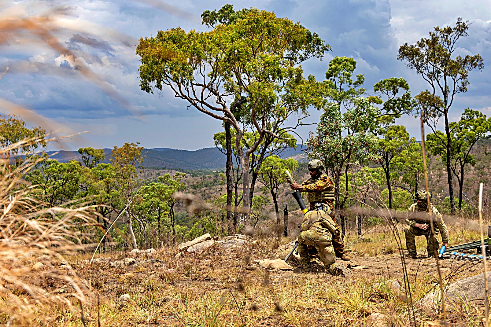 호주 육군 병사들과 왕립 호주 연대 박격포 소대 제1대대 소속 파푸아뉴기니 방위군 소속 병사가 타운즈빌 현장 훈련장에서 Black Dagger 25-2 2 훈련의 일환으로 M252A1 81mm 박격포 사격을 실시했다.
