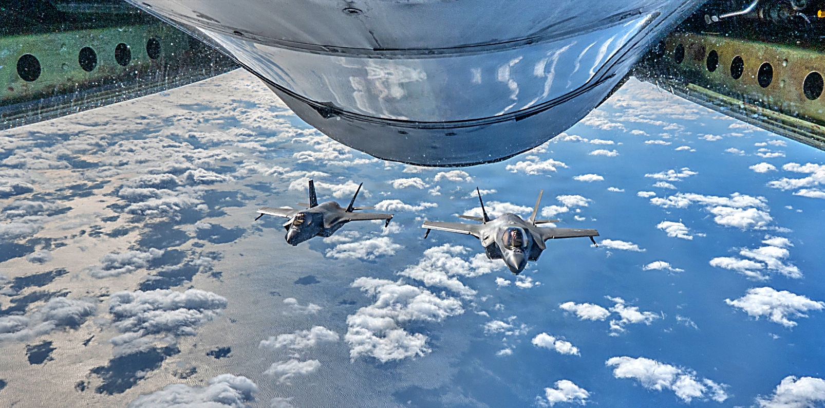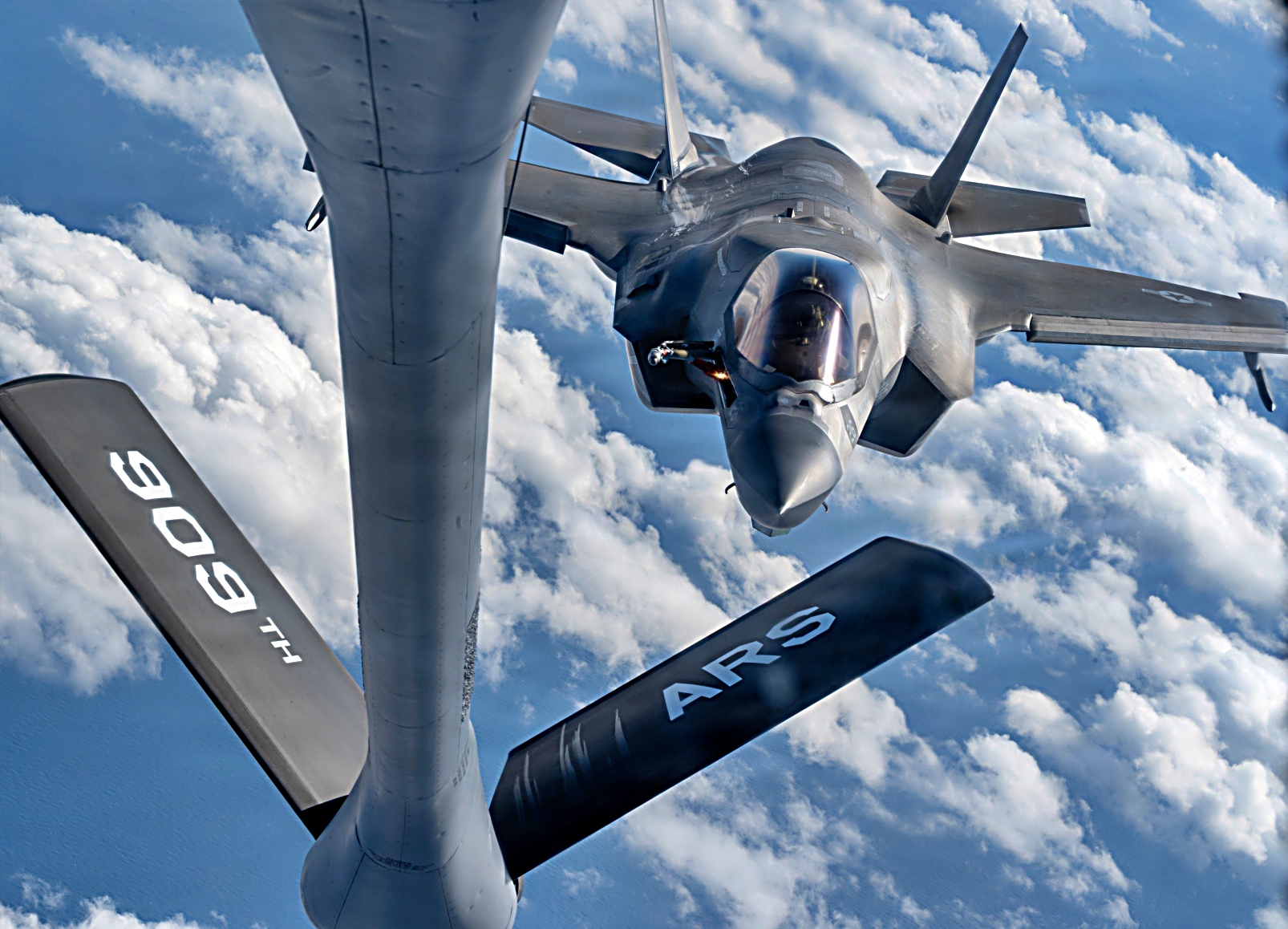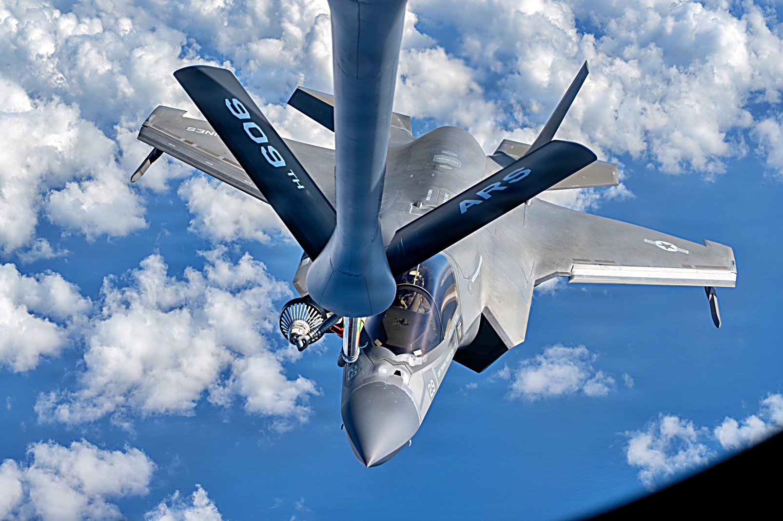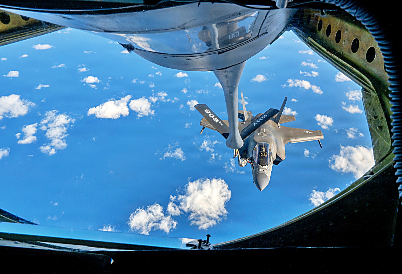 2025년 11월 20일, 태평양 상공에서 미 해병대 제1해병항공단 제12해병항공군 VMFA-242 해병전투공격비행대대 소속 F-35B Lightning II 공격기가 제909공중급유비행대대 소속 KC-135R Stratotanker와 공중급유를 실시하고 있다. VMFA-242 소속 F-35B의 주요 임무는 전자전 지원, 적 항공기 요격 및 격추, 적 지상 표적 탐지·공격·파괴이다.