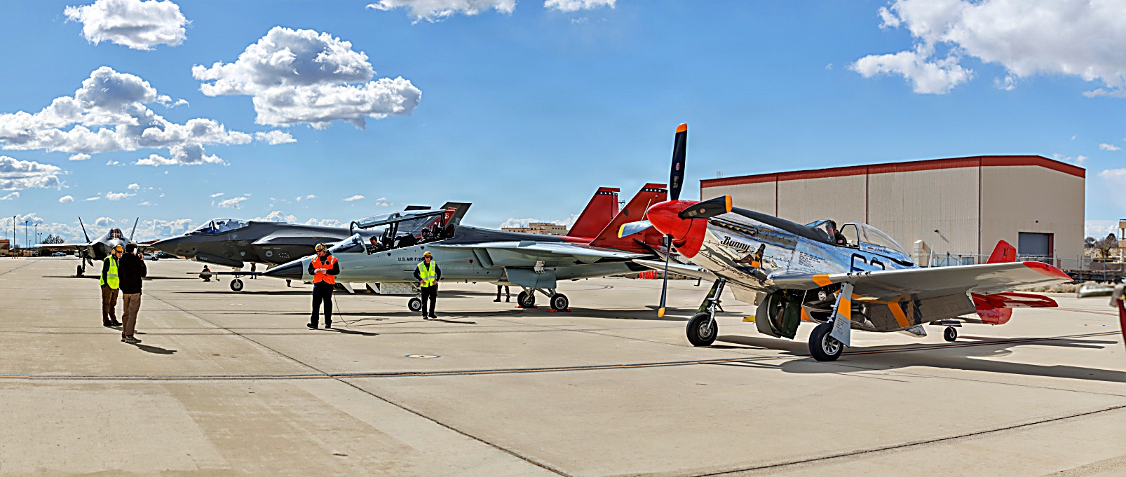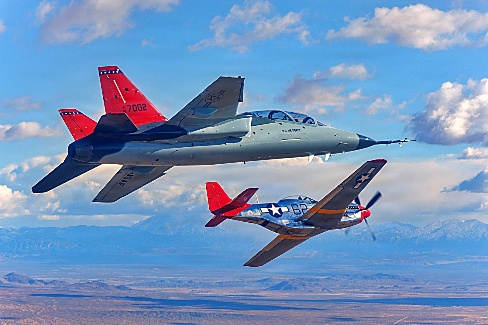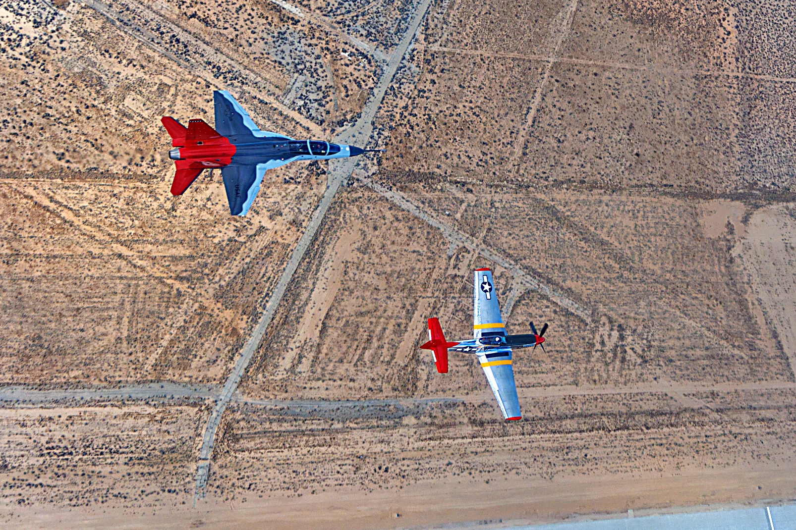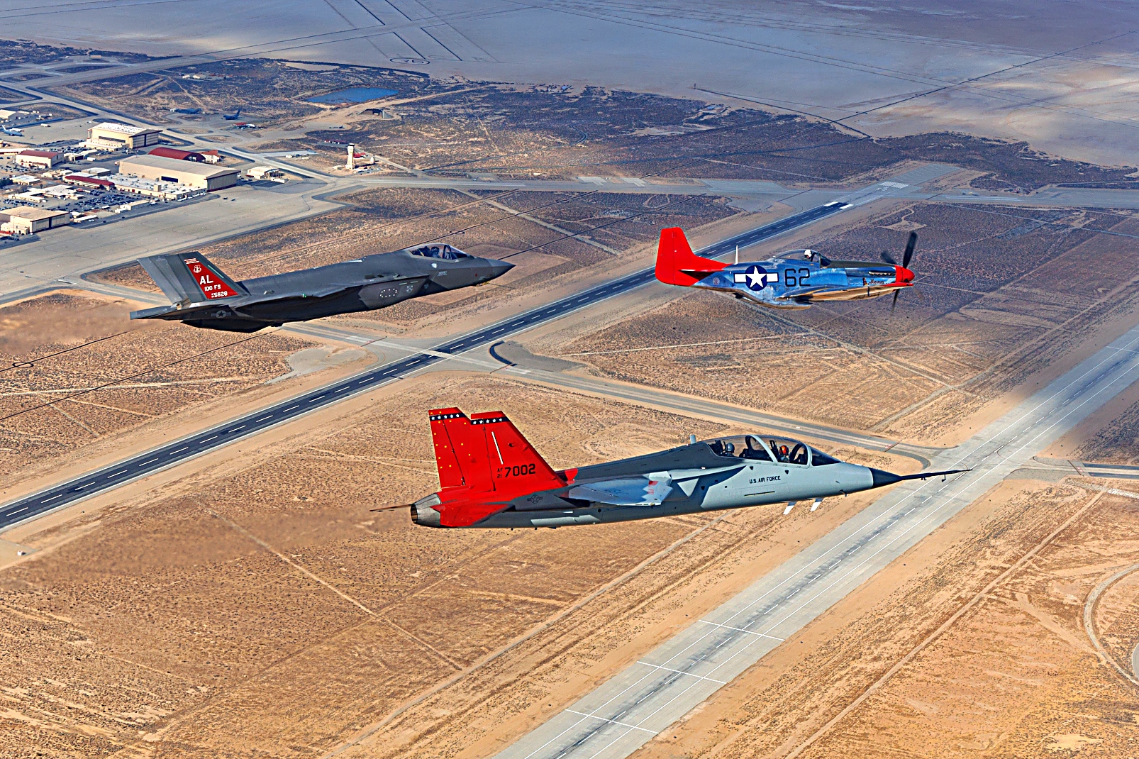 2025 Red Tail Rendezvous 행사 후, 에드워즈 공군 기상 상공에서 416비행시험대대의 T-7A Red Hawk, 앨라배마 주방위군 소속 F-35A, Palm Springs Air and Space Museum 소속 P-51D Mustang이 편대를 이루어 비행하고 있다. Tuskegee Airmen의 풍부한 역사를 기리고, 전투원 기준과 회복탄력성을 강화하며, 공군 병사들의 사기를 고취하기 위해, 412시험비행단은 3월 7일 캘리포니아주의 공식 Tuskegee Airmen 추모의 날에 특별한 오후 행사를 주최했다. 유익한 일련의 요건 덕분에 F-35A와 P-51D 항공기는 이륙 중 시험 임무를 수행하던 T-7A를 활용해 이 독특한 편대를 구성할 수 있었으며, 이 행사는 조종사들에게 앨라배마 주방위군 핵심 장거리 비행 훈련 시간을 제공했다. 동일한 오후에 비행 시험 항공 사진 촬영 임무도 예정되어 있어 이 희귀한 순간을 시각적으로 포착할 수 있었다. T-7A Red Hawk는 Tuskegee Airmen들에 대한 경의를 표하기 위해 빨간 수직미익을 하고 있다.