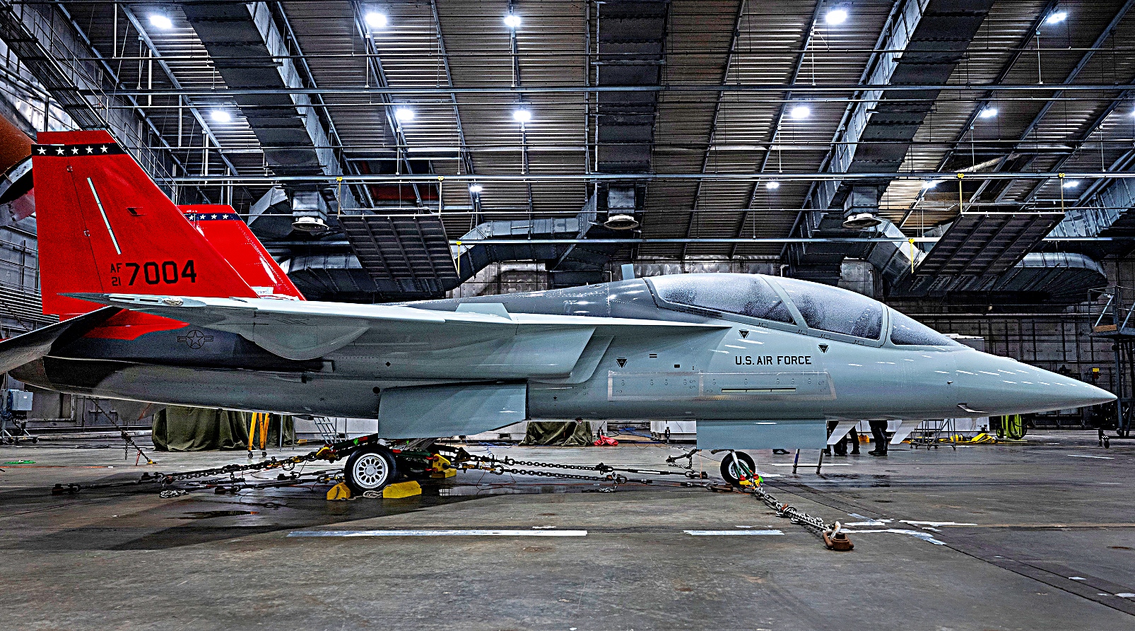 T-7A Red Hawk 정비팀이 5월 30일 플로리다주 에글린 공군기지의 McKinley Climatic Lab에서 강풍 구름 시험을 위해 항공기를 준비하고 있다. T-7은 6월 실험실 내 55,000평방피트 규모의 격납고에서 영하 14도부터 100도까지의 온도를 견디며 또 다른 냉각, 가열 및 풍속 시험을 수행했다.