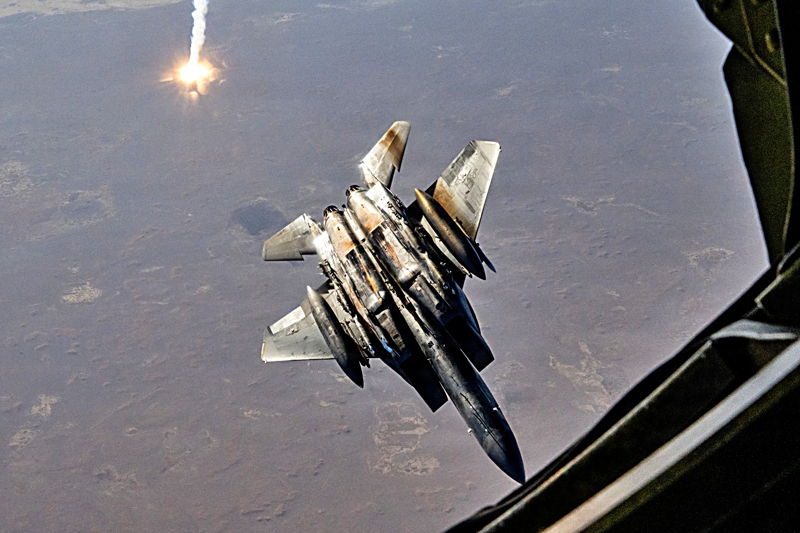 2025년 10월 11일, 미 중앙사령부 작전구역에서 미 공군 제391원정전투비행대대 소속 F-15E Strike Eagle 전폭기가 KC-135T Stratotanker 급유기와 공중급유 작전을 완료한 후 플레어를 투하하고 있다. F-15E 전폭기는 다양한 무기를 탑재할 수 있는 능력으로 중부사령부 작전구역 내에서 차단 작전, 근접 항공 지원 및 방어적 대공 작전을 수행할 수 있다.