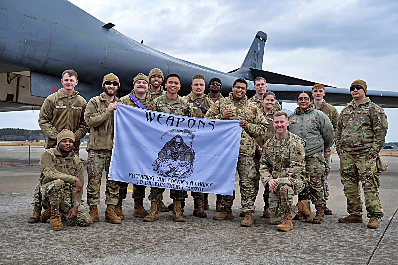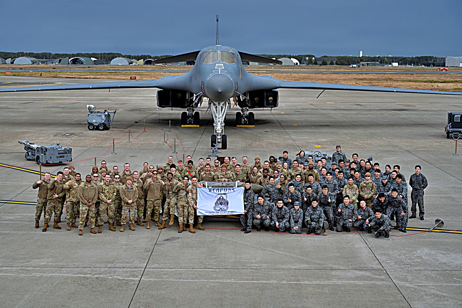 통합 탄약 탑재 행사 후, 미 공군 제9 원정 폭격기 중대 및 제35 전투비행단 소속 공군 병사들과 일본 항공자위대 대원들이 B-1B 랜서 앞에서 기념 촬영을 하고 있다. 이번 행사에는 기지 내 다양한 탄약 부대가 참여하여 공동 탄약 적재 시연을 진행했다.