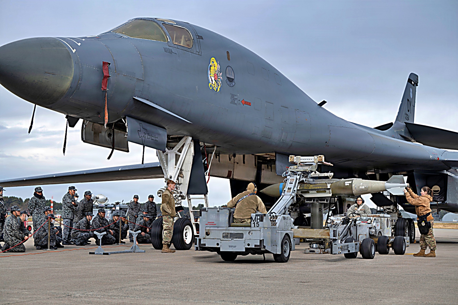 임무 완료전 2025년 11월 13일, 일본 미사와 공군기지에서 진행 중인 Bomber Task Force 배치 기간 중 통합 탄약 적재 행사에서 제9 원정 폭격 비행대 소속 미 공군 병사들이 B-1B 폭격기에 탑재할 GBU-31 폭탄을 운반하고 있다. 탄약 적재 시연 과정에서 탄약 팀들은 지식을 교환하고 작전 기법을 조율하며 유대감을 강화해 실전 임무 수행 시 효율성과 안전성을 높였다.