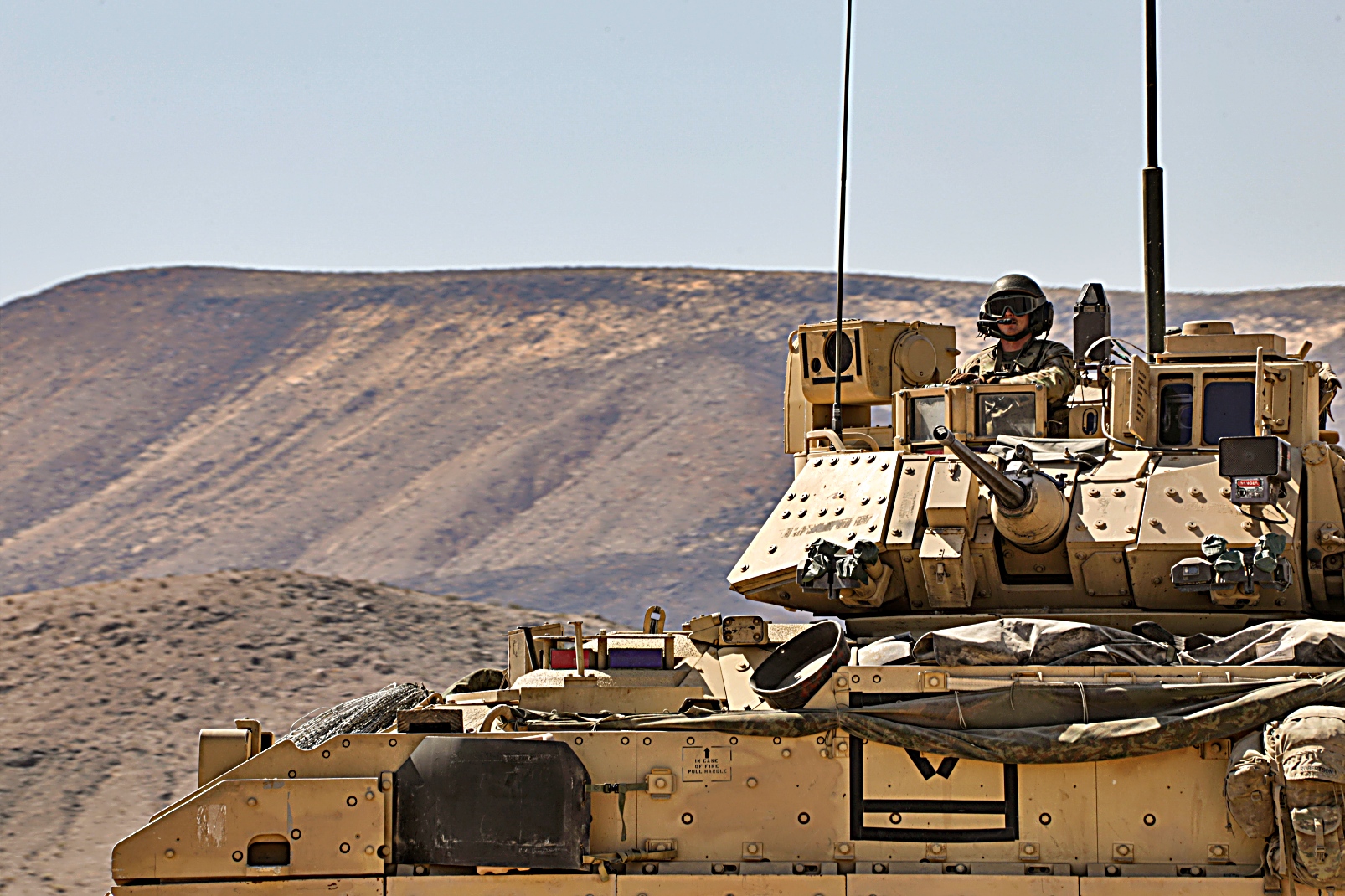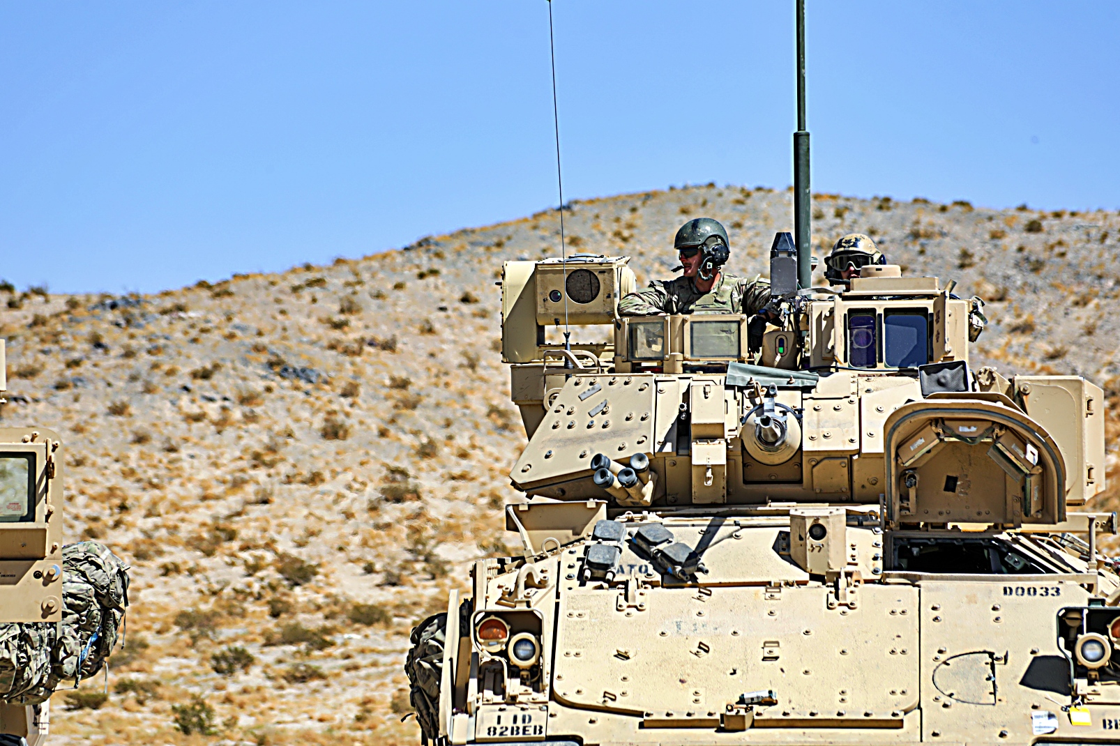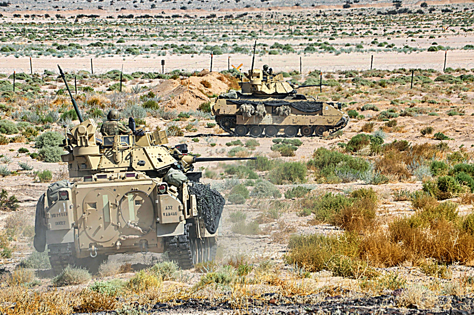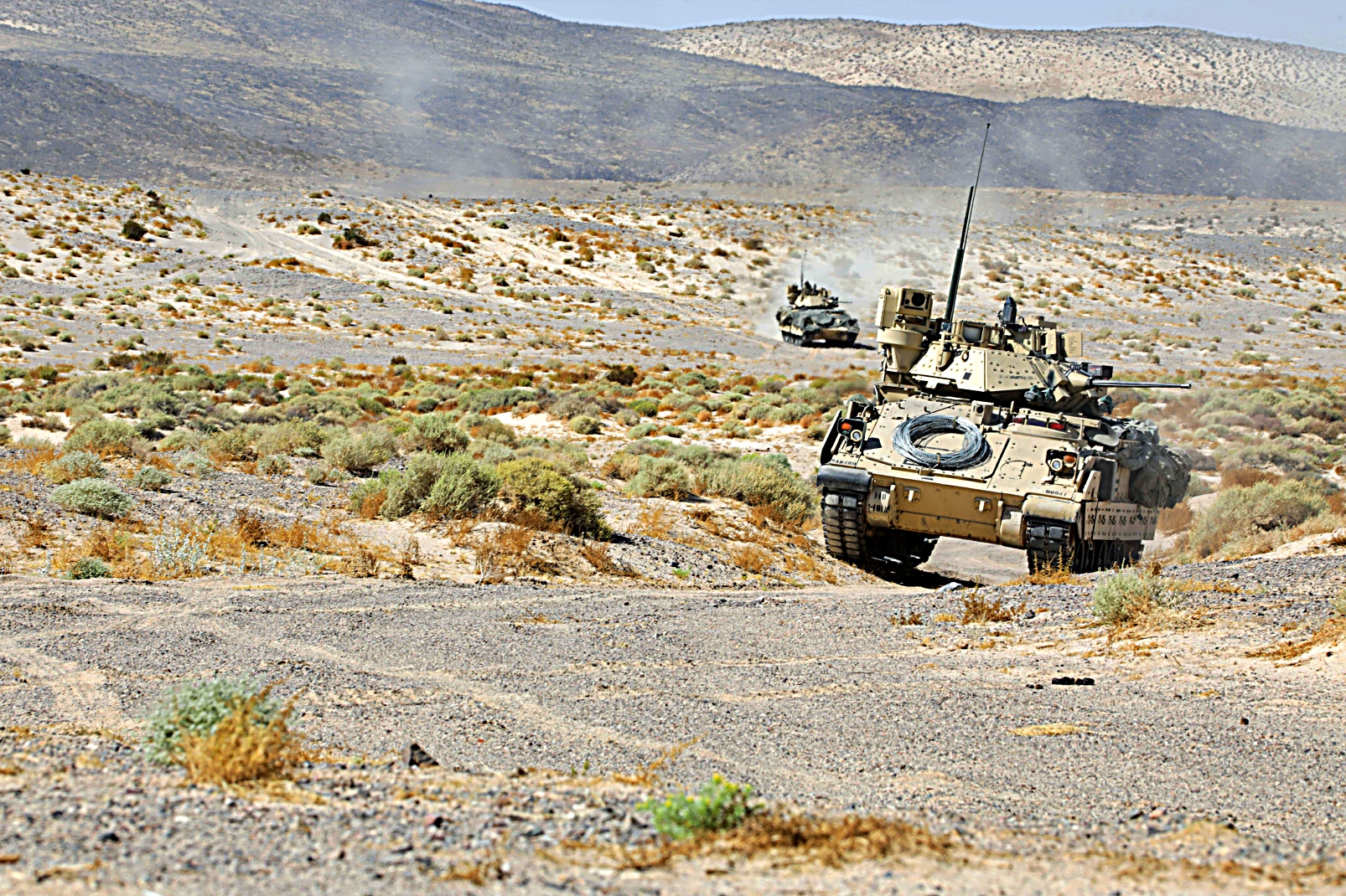 2024년 9월 12일부터 26일사이, 캘리포니아주 Fort Irwin 소재 국립훈련센터에서 진행된 Rotation 24-11 훈련 중, 미 육군 제1보병사단 제2기갑여단전투팀 제70기갑연대 제2대대 소속 Bradley 전투장갑차와 M1A2 전차가 기동하며 훈련중이다.